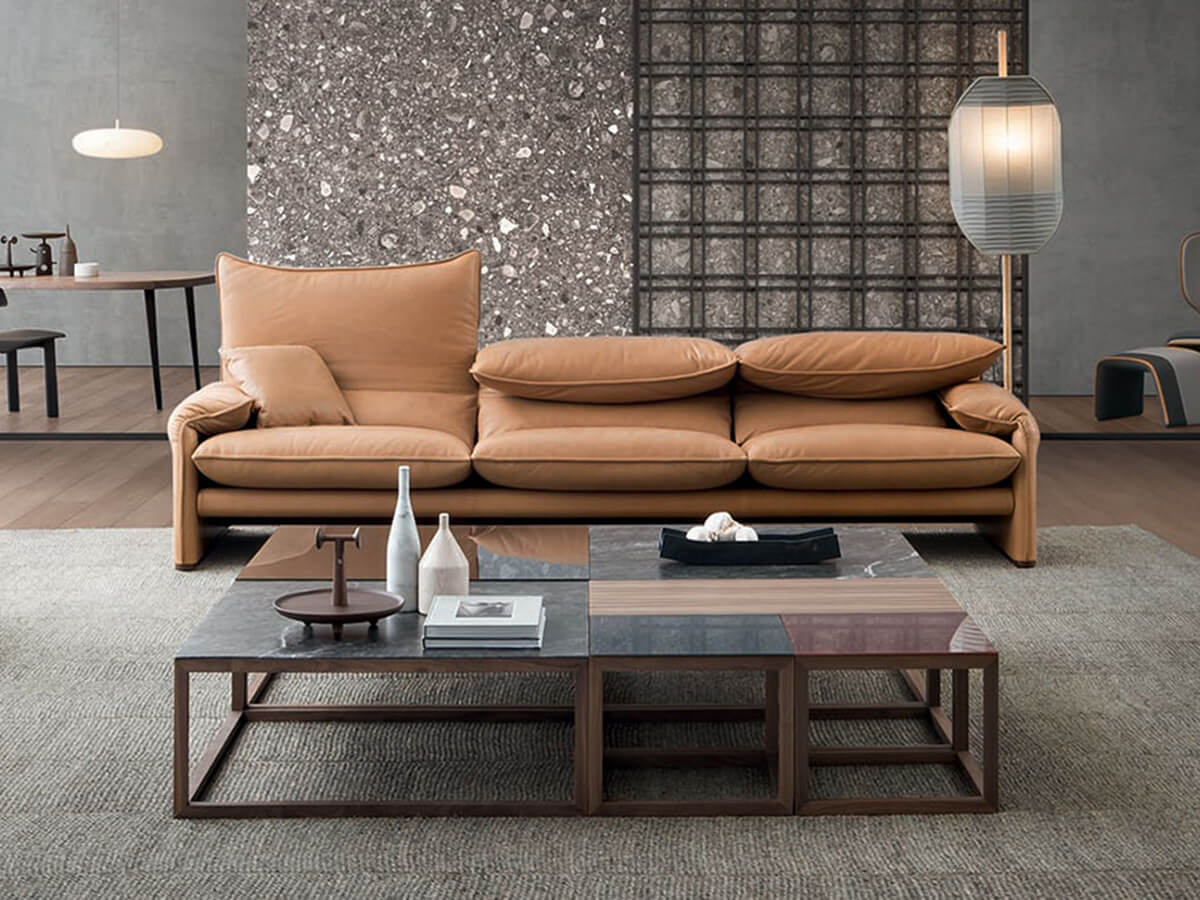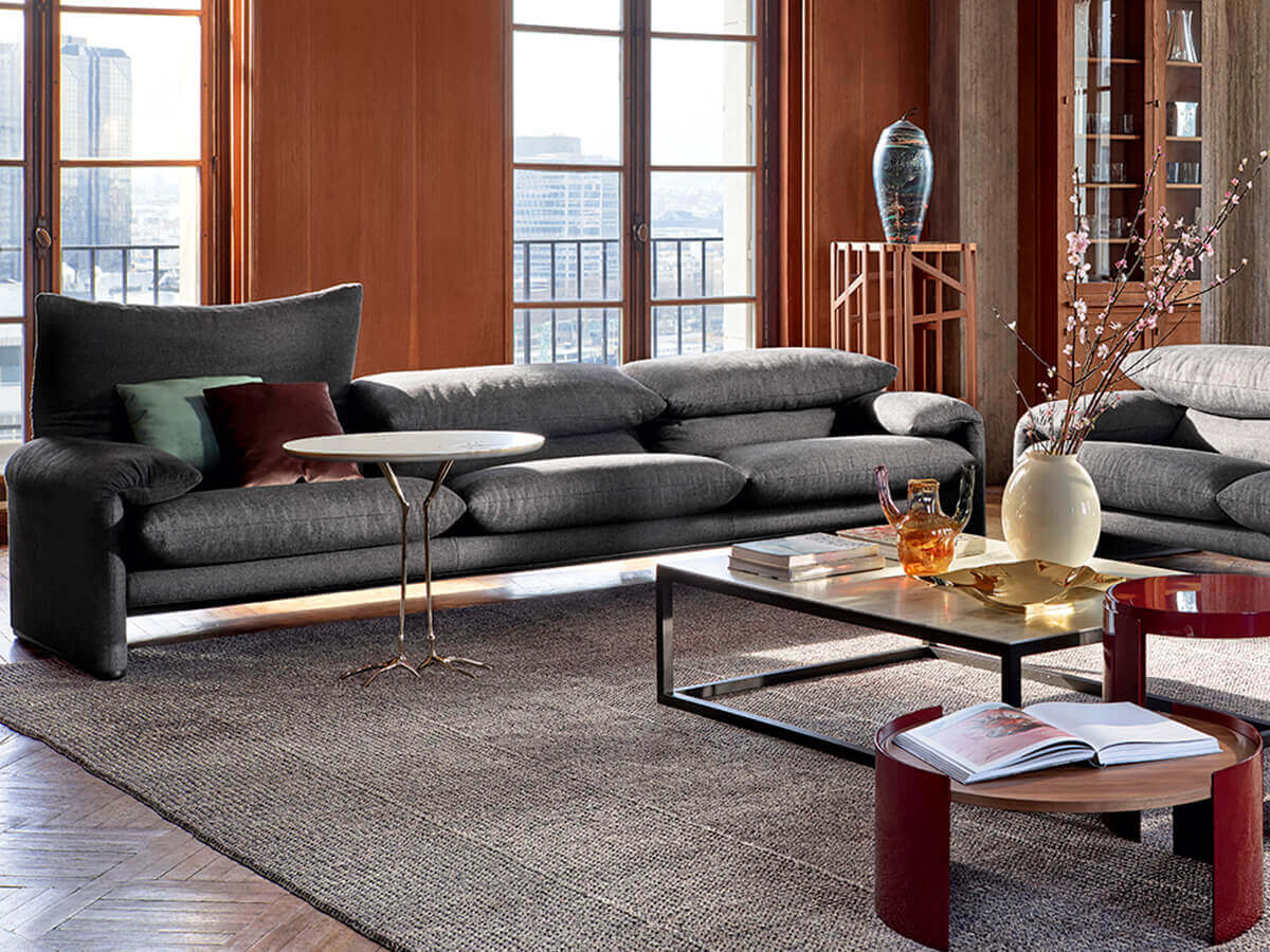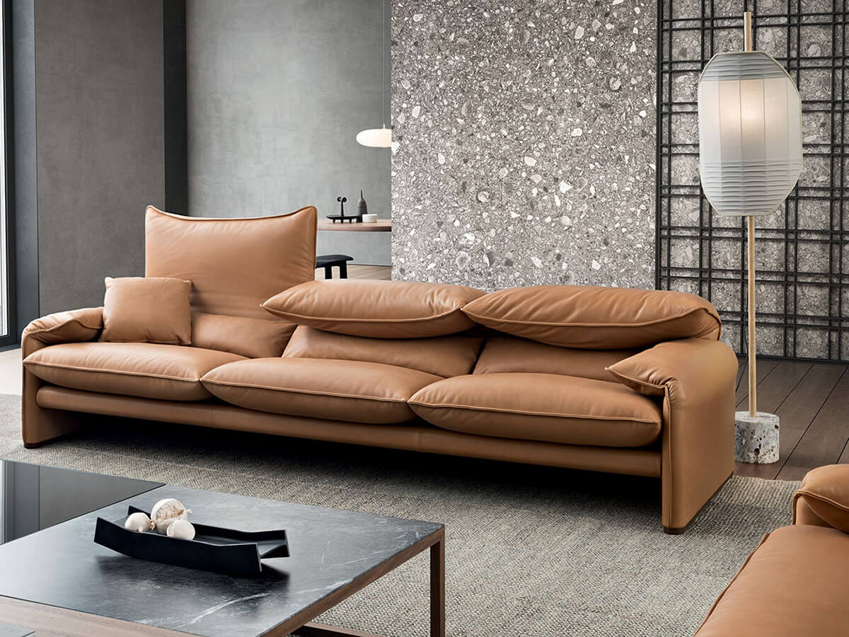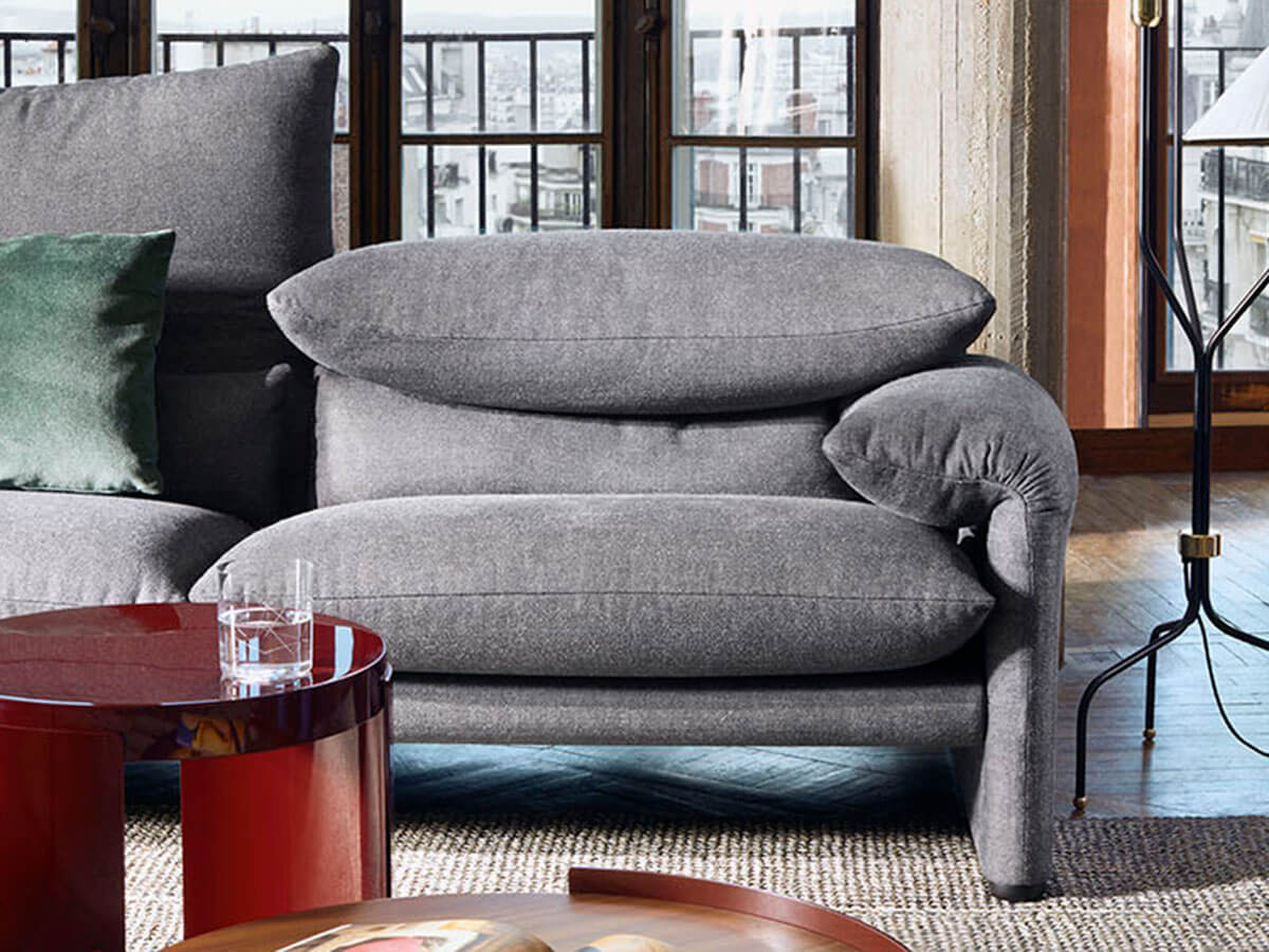 Forty five years since its creation and its manufacture by Cassina, the sofa Maralunga by Vico Magistretti is still considered a timeless icon. The ergonomic conformation and the cleverness of the adjustable system for the height of the backrests contribute to blend the aesthetic value and stylistic innovation in a unique piece. Following its success, Cassina decided to add two models in Maralunga collection: Maralunga Maxi and Maraluna Maxi 40. The version Maxi is available only with perimetral stitching and it offers new sizes for two and three seaters sofas. The depth has been increased to give you a more comfortable seat, able to meet the most demanding requirements.