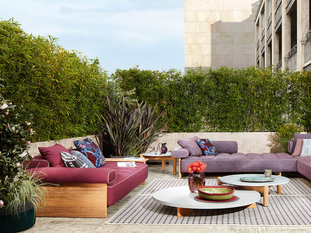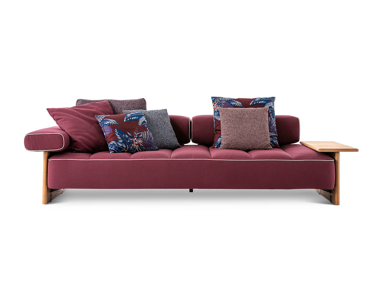 The Sail Out Sofa is a modular outdoor system designed by Rodolfo Dordoni for Cassina. The soft shape of the seats reminds vaguely to the inflatable small mattresses in canvas, further enriched with sartorial and valuable details as the profile in gros-grain in grey or in the same colour of the fabric covering the sofa. The predominant quality of Sail Out Sofa is the comfort, obtained thanks to the use of SoloSoff® padding, a product made with blown polyester fiber and memory foam. Smart and extremely versatile, this sofa is able to offer you a large range of combinations by assembling the seating modules with the related elements: the coffee table in teak and the armrest/backrest available in two different heights. Finally, Dordoni adds to the Sail Out collection a pouf with a ballasted cushion able to support a tray or to be used as an armrest or low coffee table.