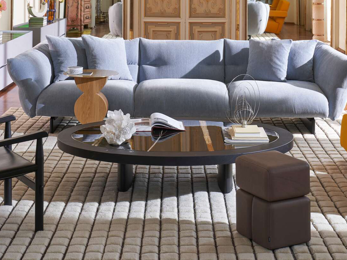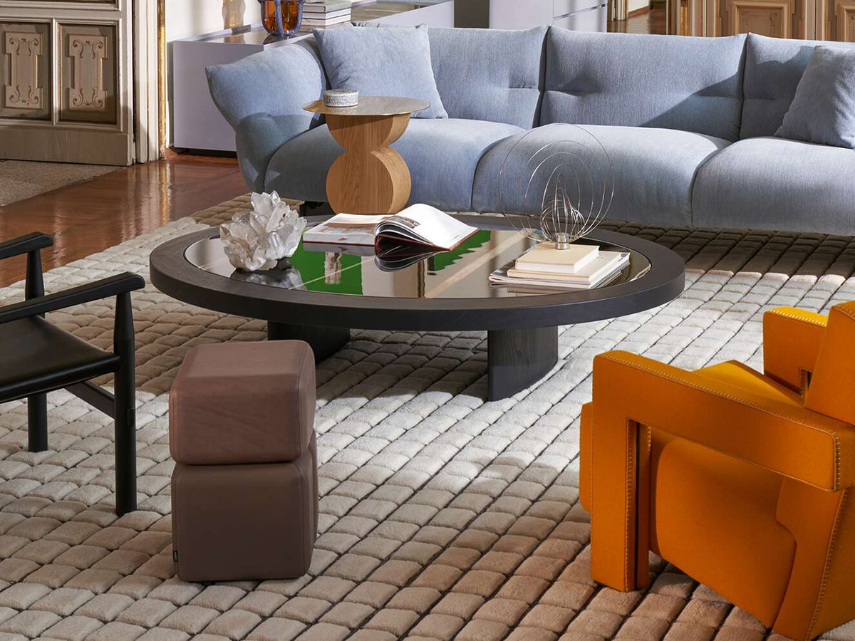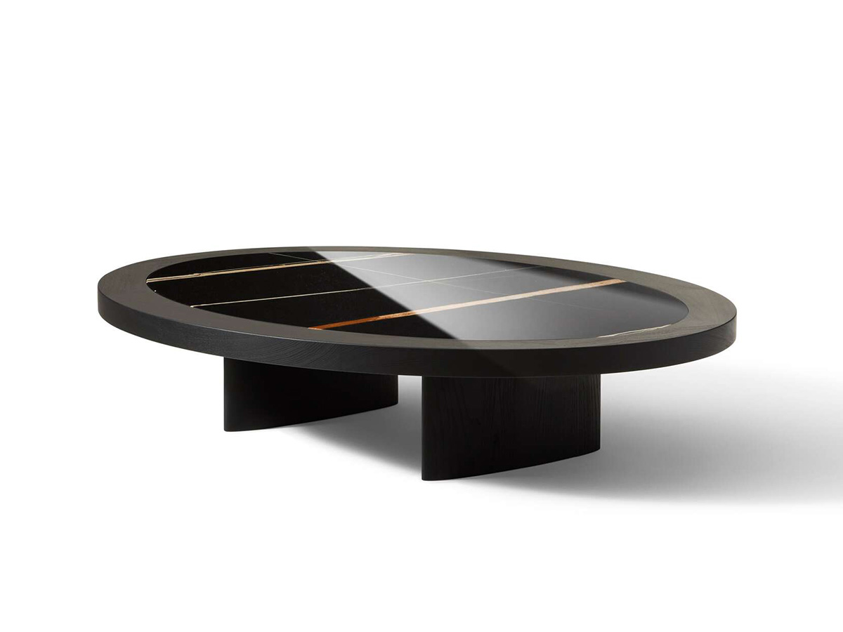 Cassina returns to express its personal concept of craftsmanship with the Monta coffee table, an elegant and material piece of furniture that reflects the aesthetic taste of Charlotte Perriand. The creation of this object is due to the collaboration between Cassina and Pernette Perriand-Barsac, daughter and only heir of the designer whose legacy continues to be a source of inspiration today. Monta low table has a structure made up of two elliptical legs and an oval top. The top is composed of an external ring of eight symmetrical sectors assembled thanks to an elaborate process that frames a precious marble slab, enhancing its structural value and presence. Monta is offered in a single size and two versions with different finishes to better enhance the elegance of the materials and colours.