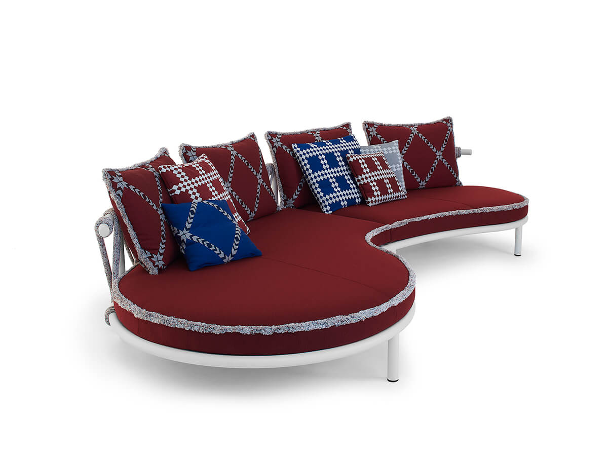 Designed by Patricia Urquiola, the Trampoline Sofa is able to represent the happiness of outdoor life thanks to its playful touch, rich in rounded and curvy shapes which do not fear any unexpected occurrences. Starting from an eco-friendly approach, Cassina develops this model with innovative and sustainable materials, completely Made in Italy and created in partnership with Poli.design of the Politecnico di Milano. A stainless steel structure is the base for panels realized in RFM®, a recycled handfinished fiberglass. The backrest marked by the distinctive handweave in polypropylene cord and nylon is able to offer the perfect comfort which can be further improved by cushions covered in resistant and hypoallergenic fabrics made by polyester yarns fully recyclable.