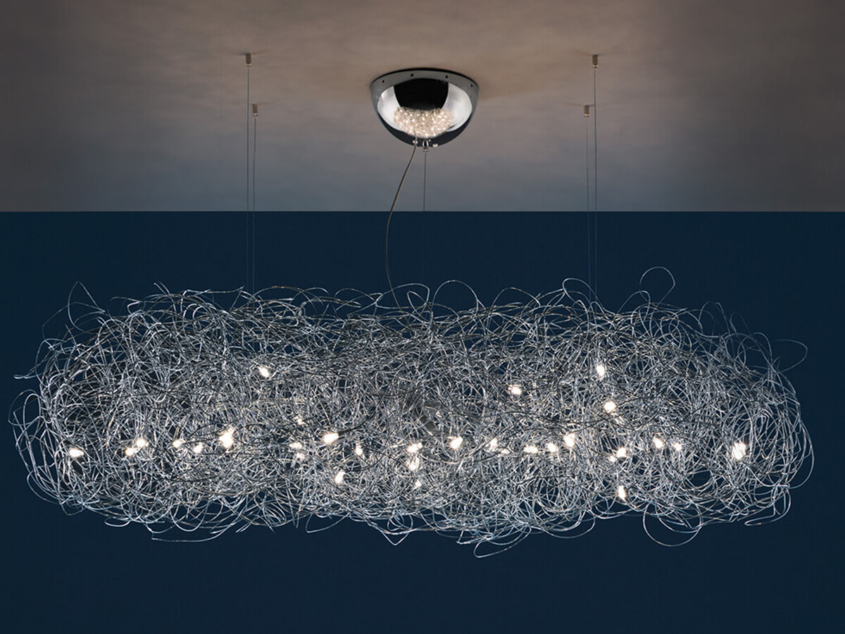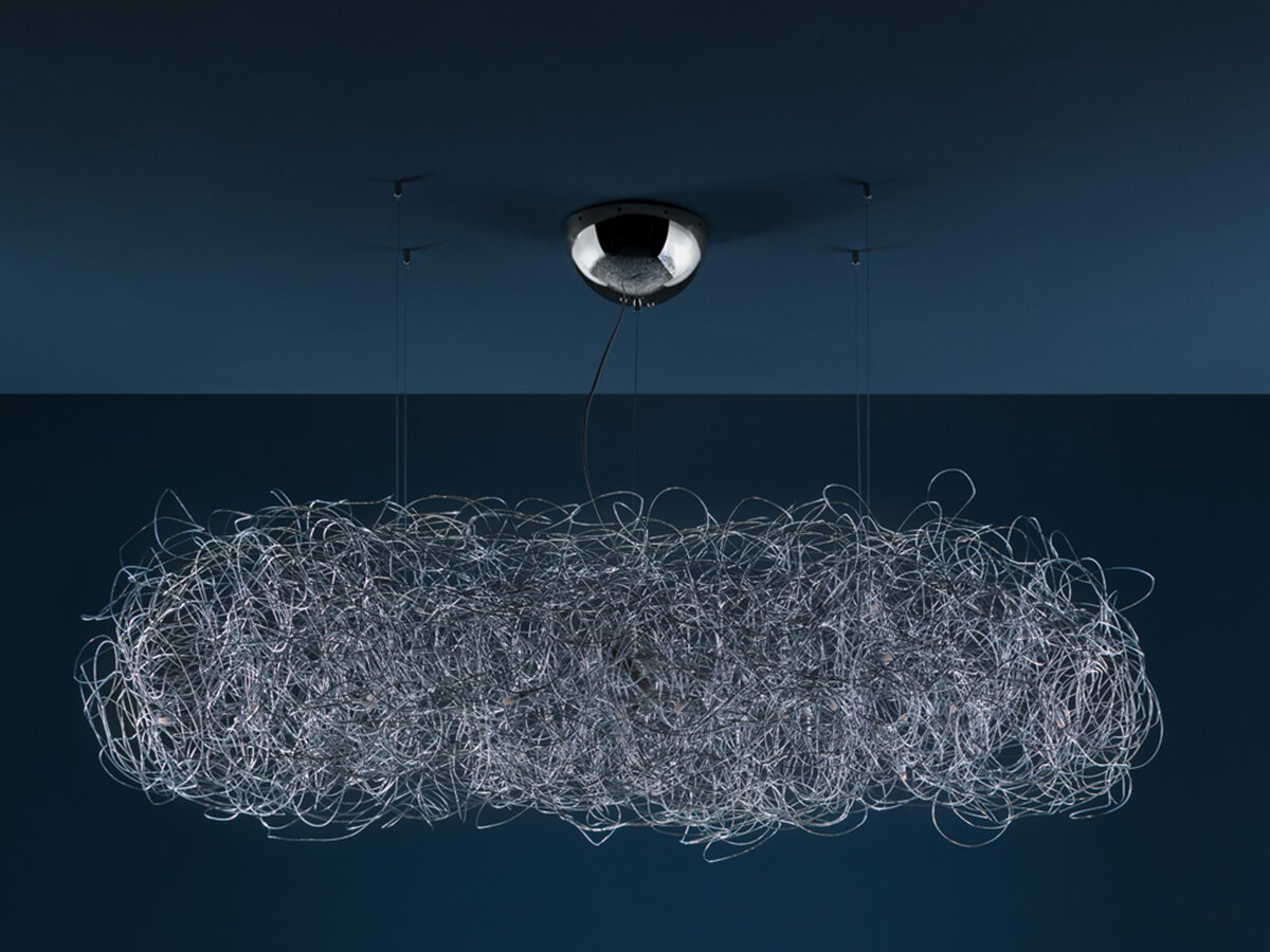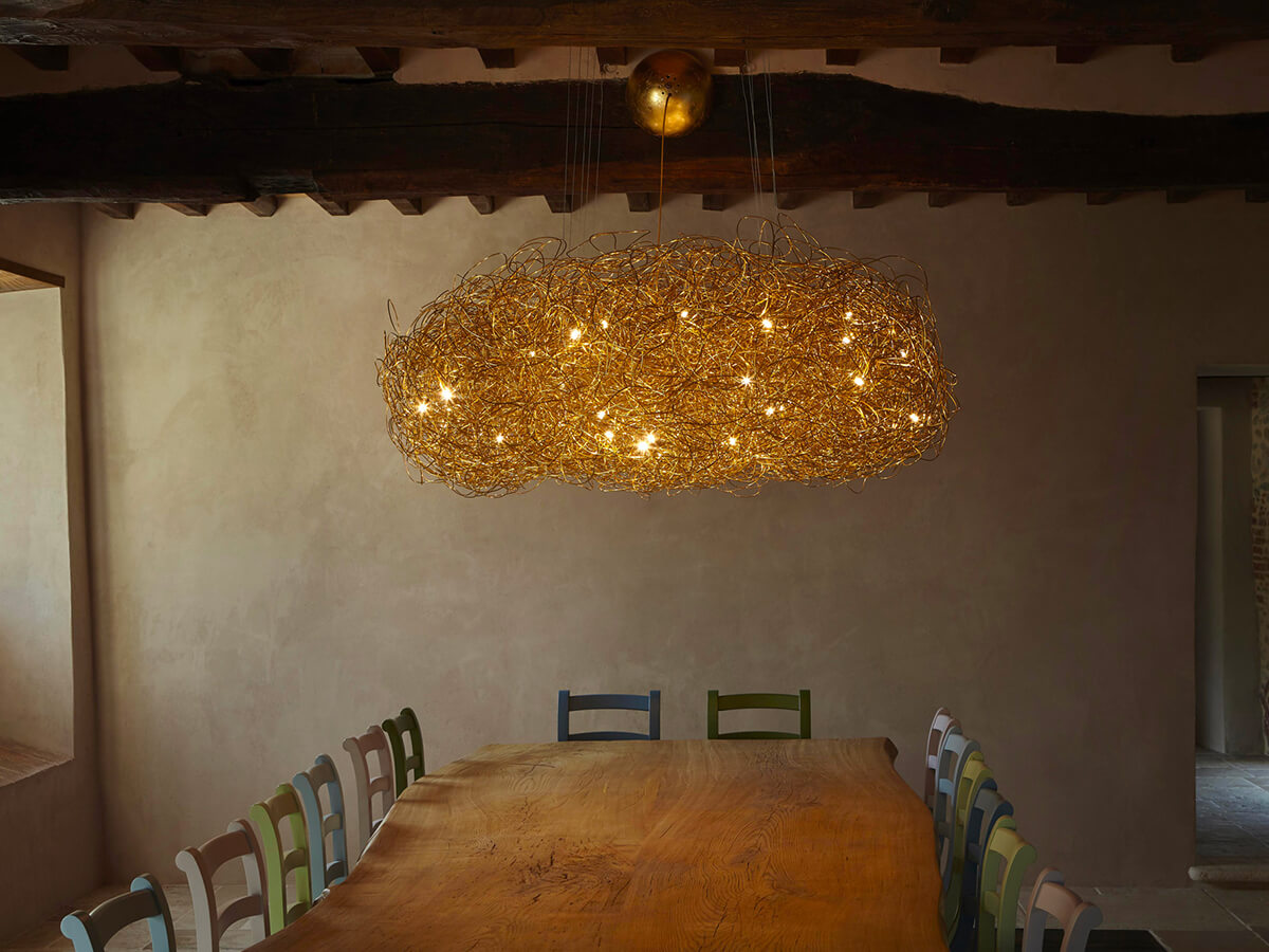 Artisan rigor and taste for a production centered around the product have allowed the designer Enzo Catellani to develop the prototype created years ago, following a specific request from a customer, to put into production for Catellani & Smith a real family of iconic lamps, called Fil de Fer, born from the intertwining of an aluminum wire. Particularly fascinating are the options for the ceiling both in the spherical version and in the more irregular one, which makes the lamp seem almost a cloud. Aluminum or gold finishes, made in different sizes, make this lamp a real sculpture, a work of art that has become a cult object over the years, able to adapt perfectly to any environment, enriching it and giving it a touch of inimitable design.