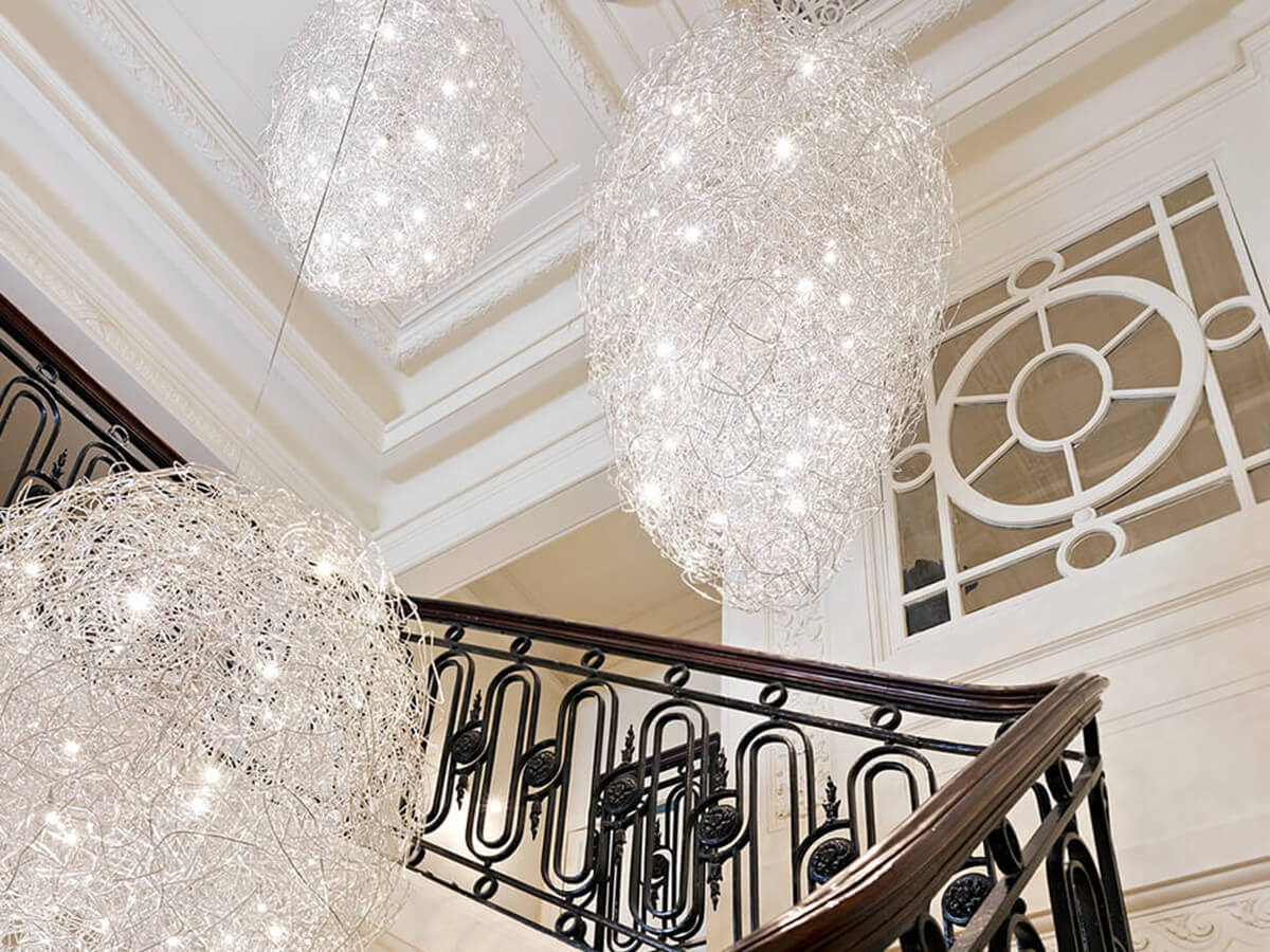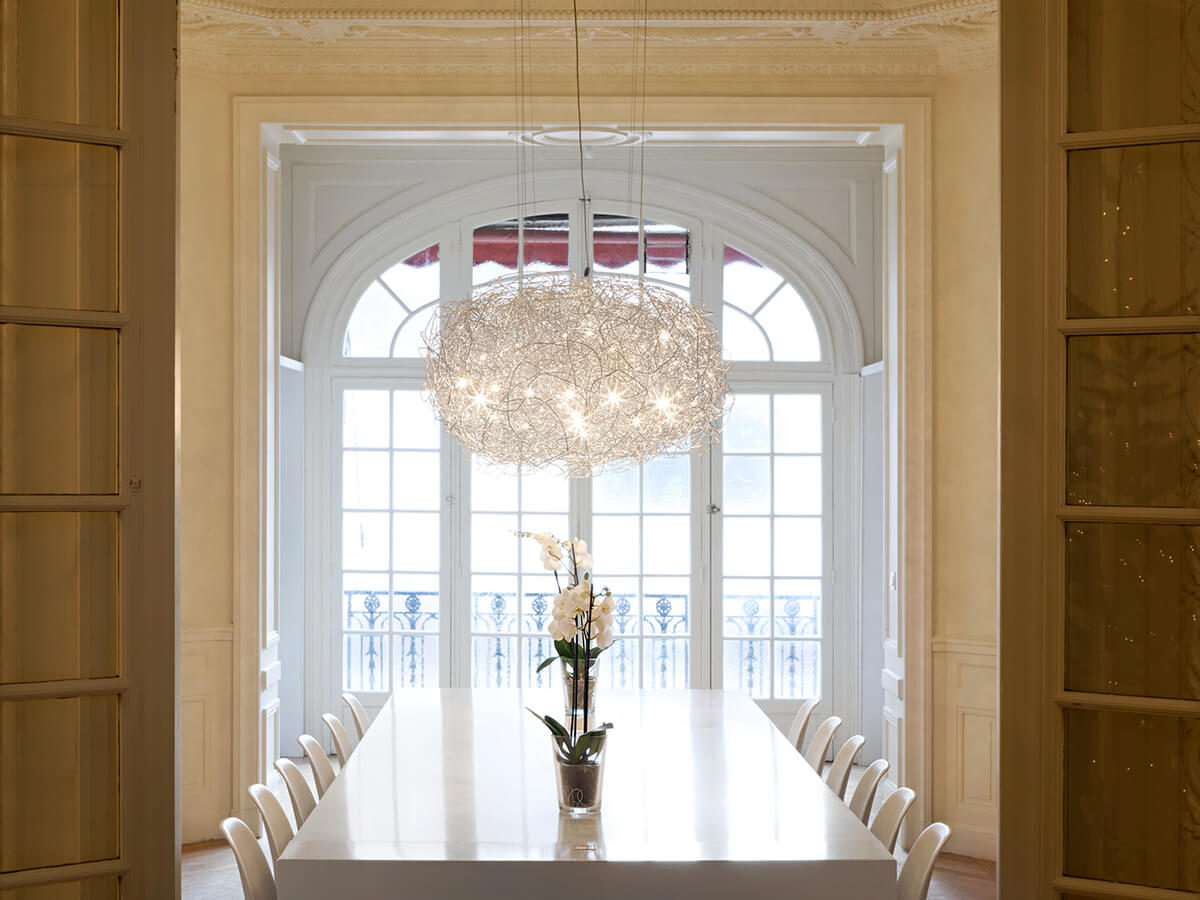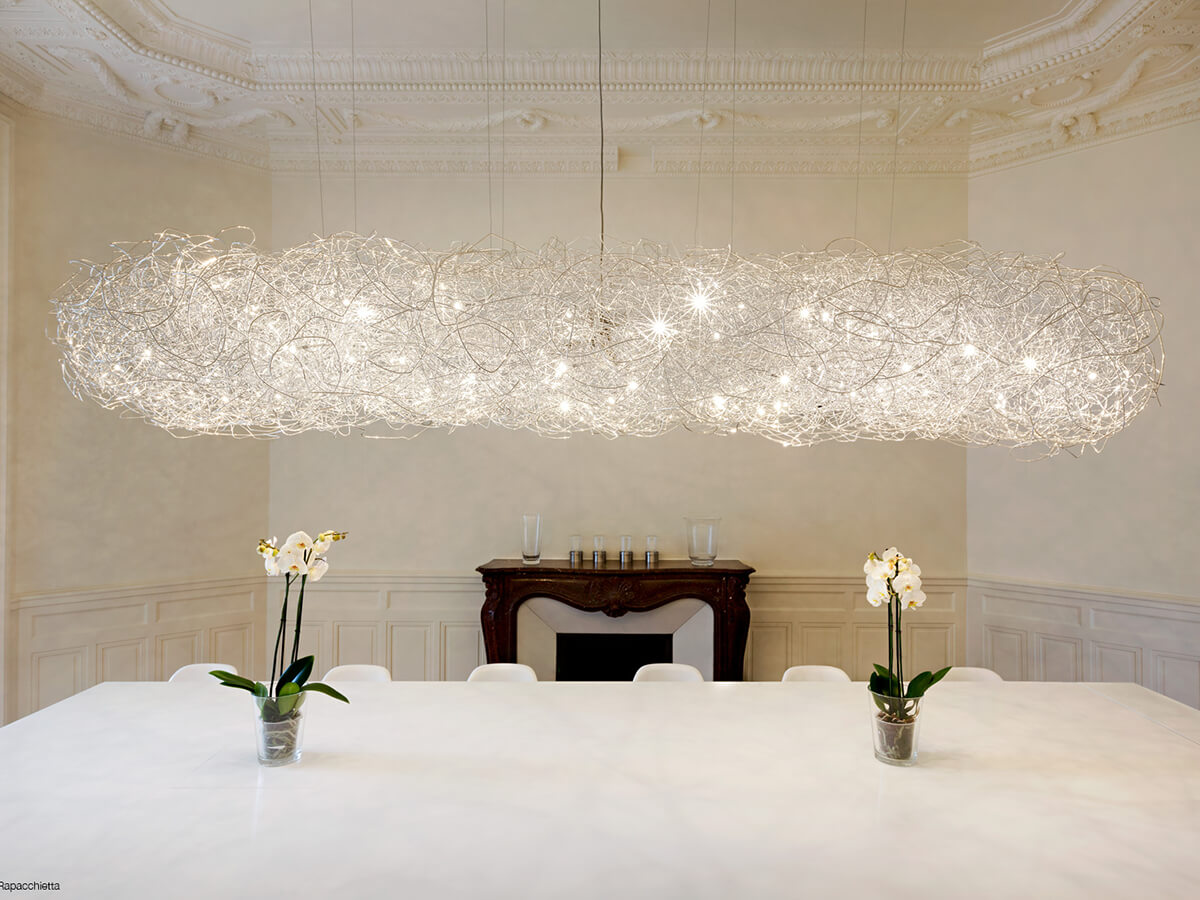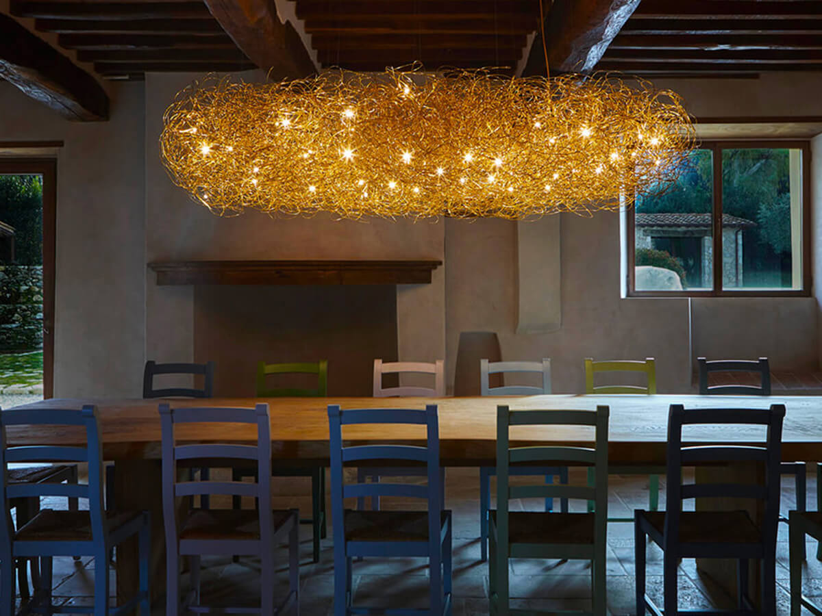 Artisan rigor and taste for a production centered around the product have allowed the designer Enzo Catellani to develop the prototype created years ago, following a specific request from a customer, to put into production for Catellani & Smith a real family of iconic lamps, called Fil de Fer, born from the intertwining of an aluminum wire. Particularly fascinating are the options for the ceiling both in the spherical version and in the more irregular one, which makes the lamp seem almost a cloud. Aluminum or gold finishes, made in different sizes, make this lamp a real sculpture, a work of art that has become a cult object over the years, able to adapt perfectly to any environment, enriching it and giving it a touch of inimitable design.