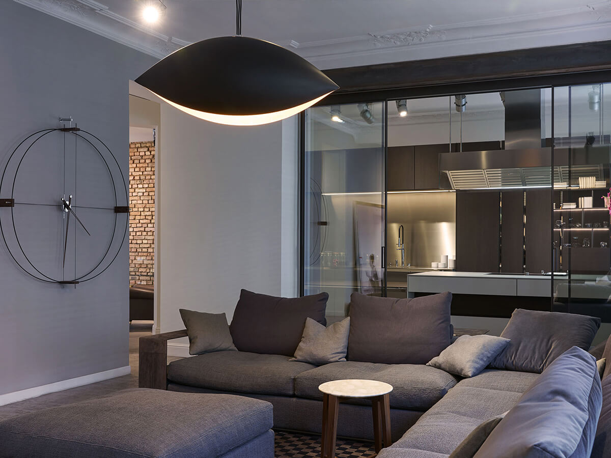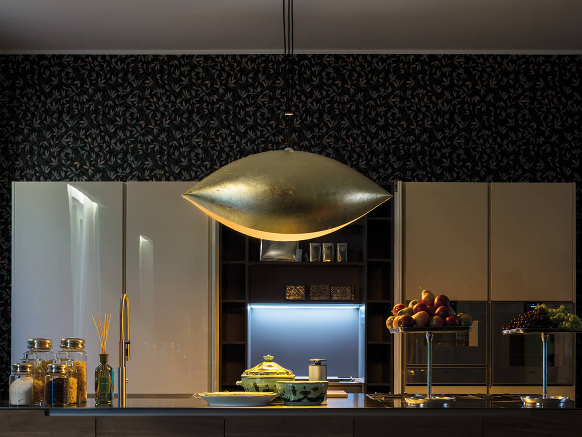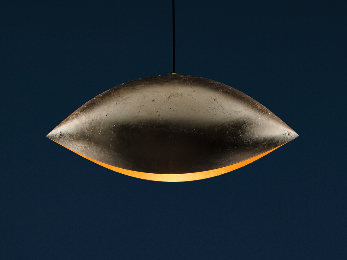 This suspension lamp that is part of the Luci d’Oro collection recalls the shape of a shell, born from the passionate research of the designer Enzo Catellani on the color of light and all its shades. Malagola has a metal base from which an aluminum body is suspended which can be covered in the variant with gold leaf, copper leaf or even silver leaf. It is produced in three different sizes and is adjustable up to a maximum height from the ceiling of 170 cm. The craftsmanship captures the light and defines the surrounding space, creating relaxing and convivial atmospheres suitable for both contract and home decor projects.