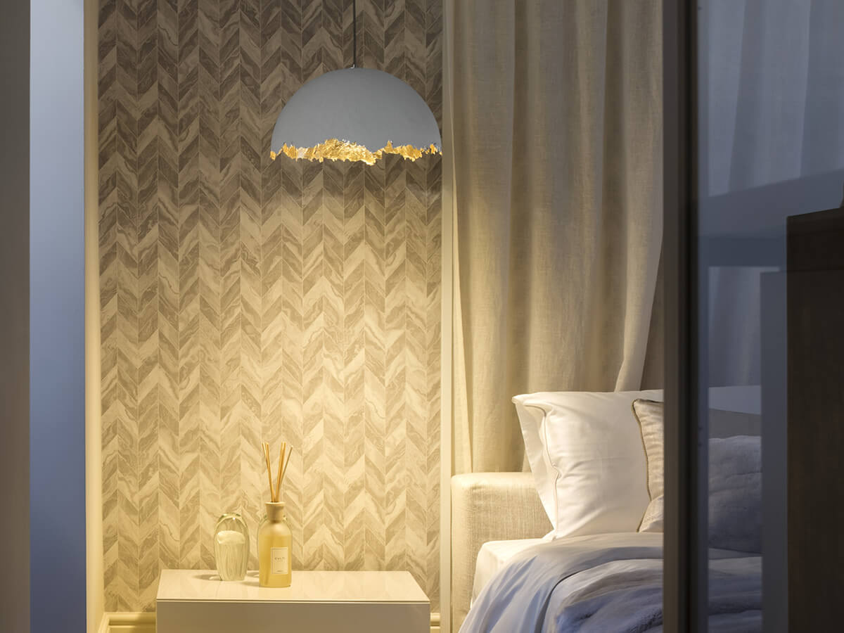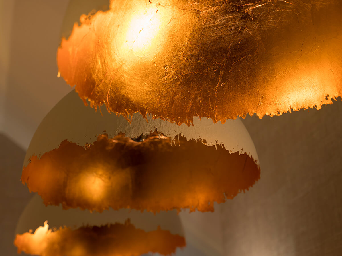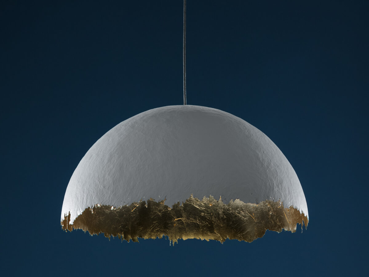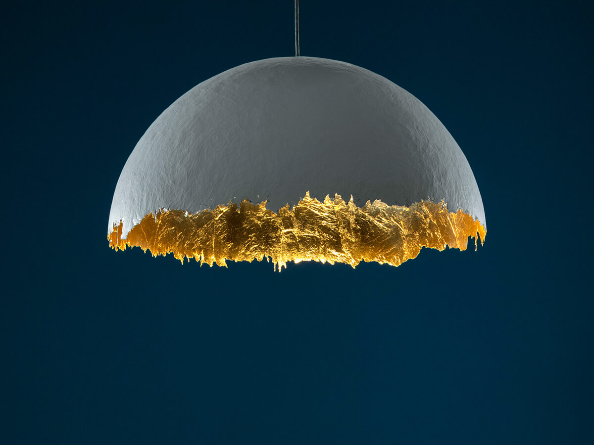 The Postkrisi 49 suspension lamp, born from the planning of the designer Enzo Catellani, is made up of a white painted metal base and a fiberglass hemispherefrom the irregular edge, the external white finish of the diffuser is contrasted by an interior finished in gold leaf or silver leaf that gives warmth and strength to the object, the light is focused and oriented downwards and directly illuminates a specific point such as the table in the living area, thus defining the spaces of the house. The lamp is available in two different sizes, with one or three LED bulbs, to better adapt to different design needs.