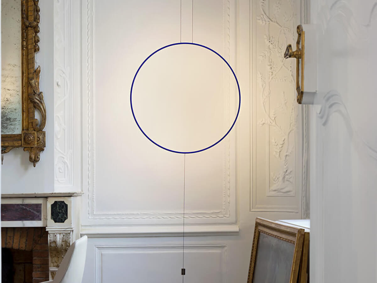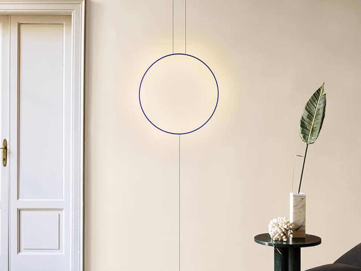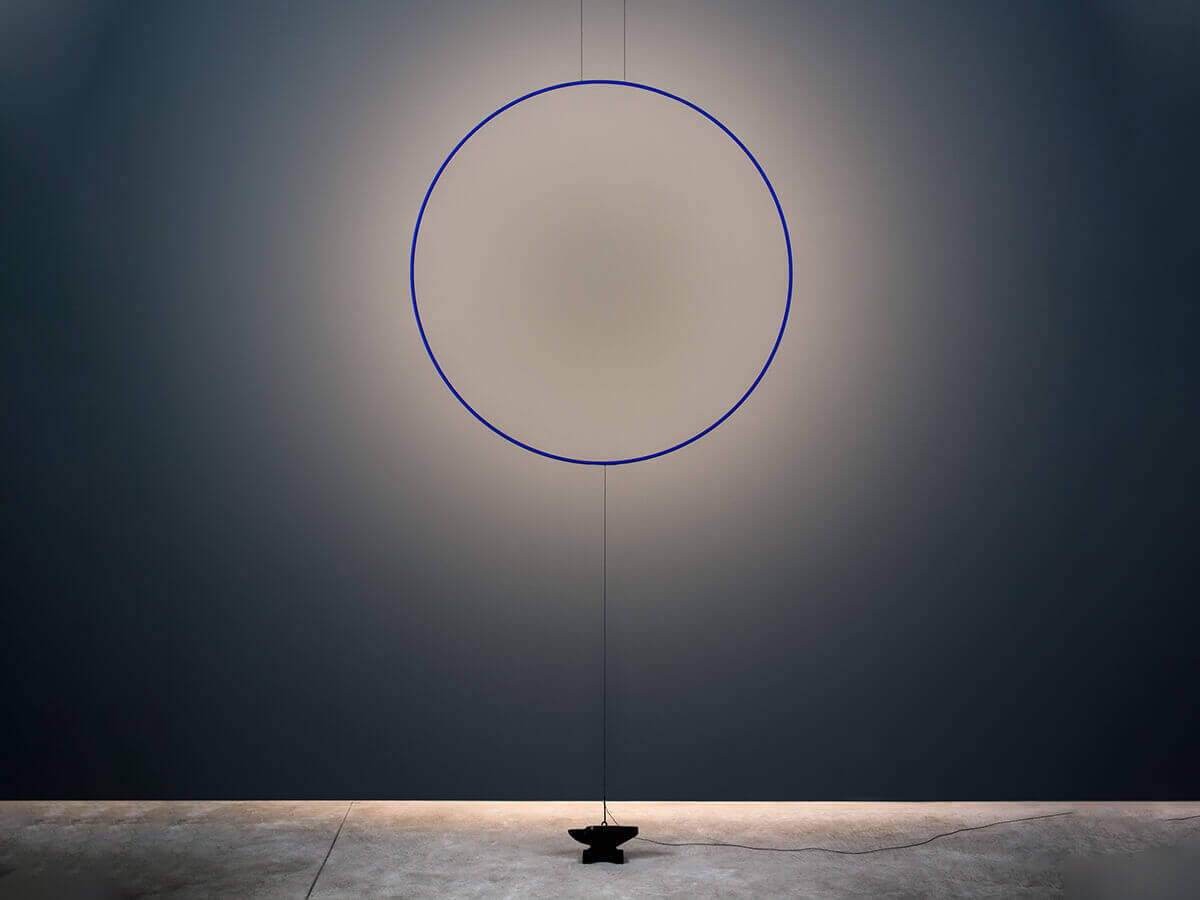 Enzo Catellani's passion for the essentiality of the lines and the perfect shape of the circle are the basis for the creation of this family of lamps which, with respectful irony, the designer calls Sorry Giotto. The pendant version of this lamp is made up of a copper ring, available with a diameter of 90 or 120 cm, hand painted with the characteristic blue color and anchored to the ground by means of a black iron anvil. The presence of a dimmer with memory of the last step allows you to modulate the intensity of the light according to different needs. The result is a lamp with a unique and easily recognizable taste, especially appreciated by those who love a minimalist style.