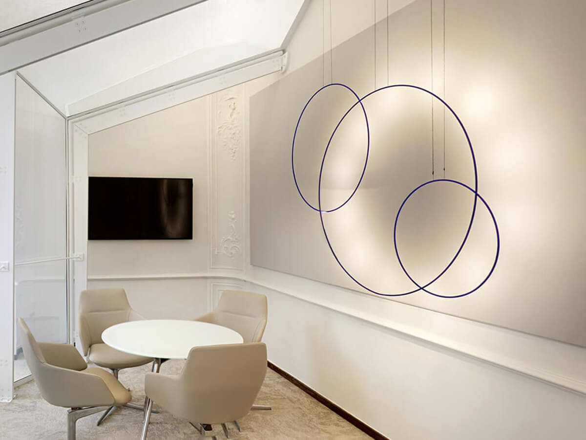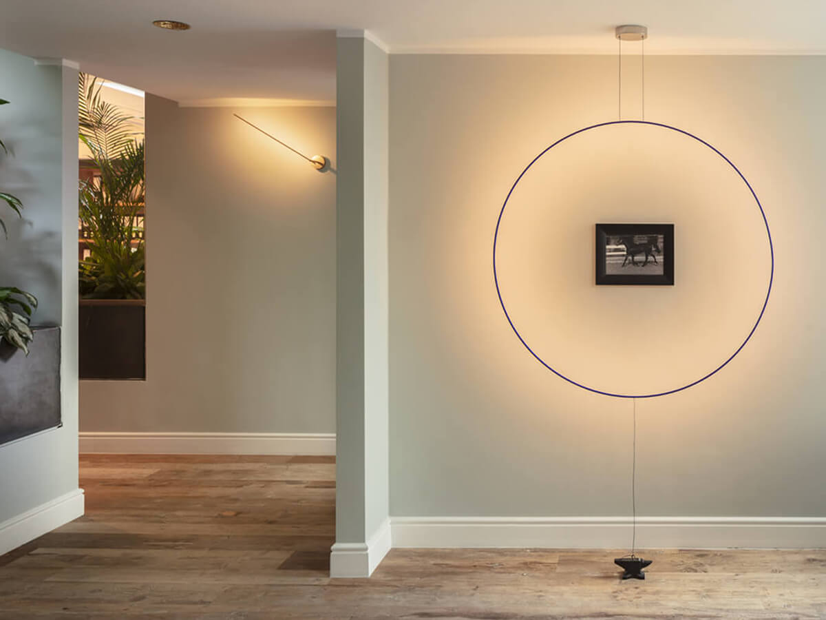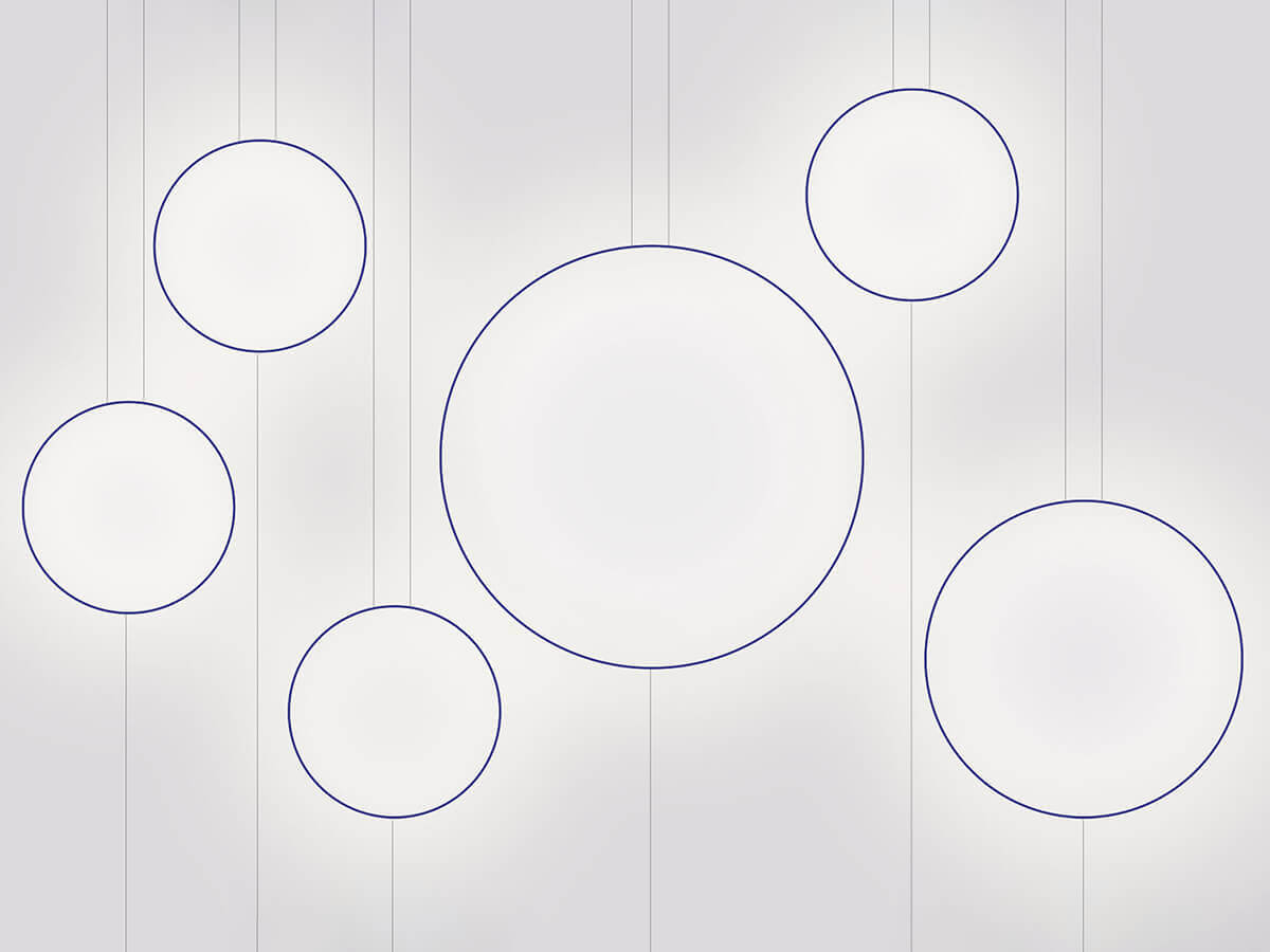 Enzo Catellani's passion for the essentiality of the lines and the perfect shape of the circle are the basis for the creation of this family of lamps which, with respectful irony, the designer calls Sorry Giotto. The pendant version of this lamp is made up of a copper ring, available with a diameter of 90 or 120 cm, hand painted with the characteristic blue color and anchored to the ground by means of a black iron anvil. The presence of a dimmer with memory of the last step allows you to modulate the intensity of the light according to different needs. The result is a lamp with a unique and easily recognizable taste, especially appreciated by those who love a minimalist style.