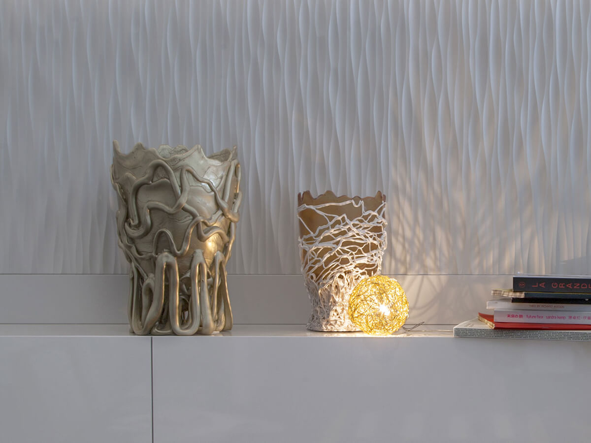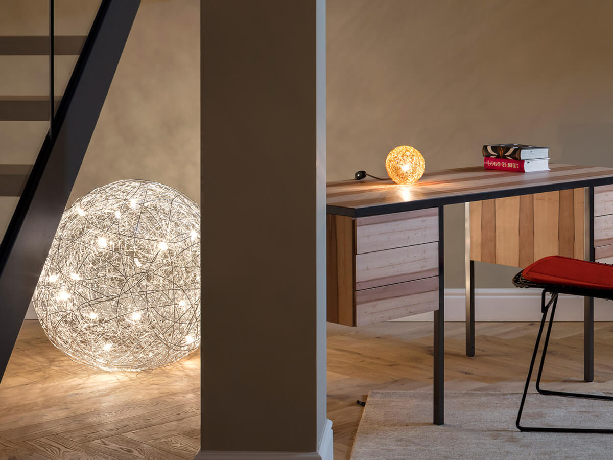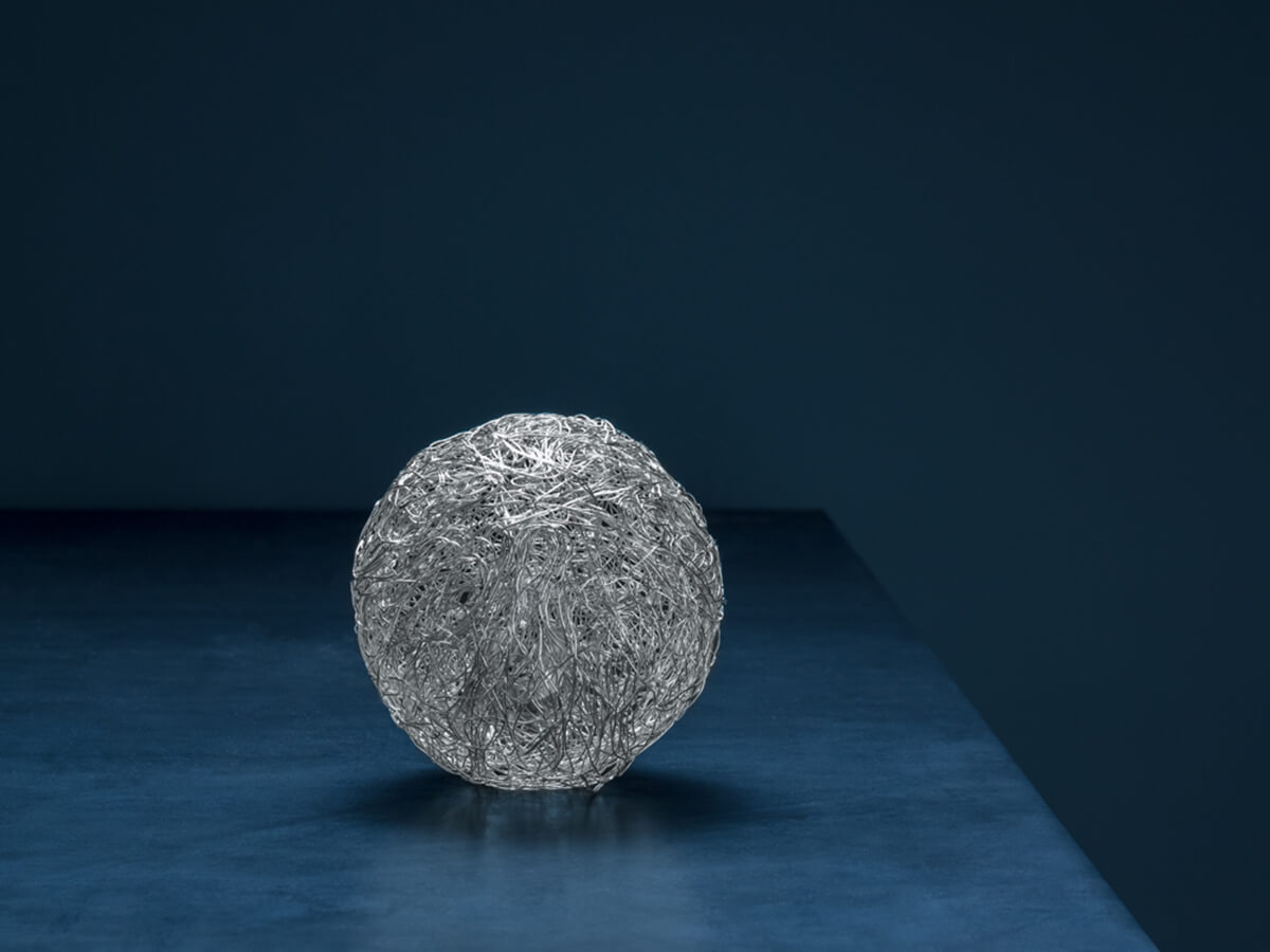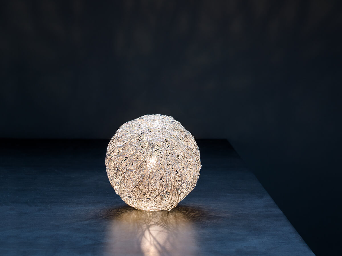 The Sweet light T table lamp by the Catellani & Smith brand is based on the idea of intertwining: an aluminum wire is molded into a spherical shape that resembles a ball, illuminated from the inside by tiny LEDs. Several variants are proposed, from natural aluminum to brass or silver-colored aluminum, for a product that has something special and magical, a precious object perfect for enhancing the intimate and somewhat hidden places of the house or, for example, the bedside tables in the sleeping area, creating suggestive plays of light and shadow for an atmosphere with ancestral references.