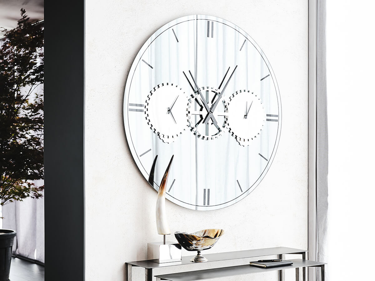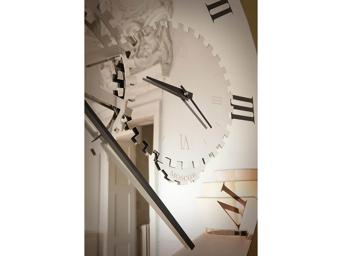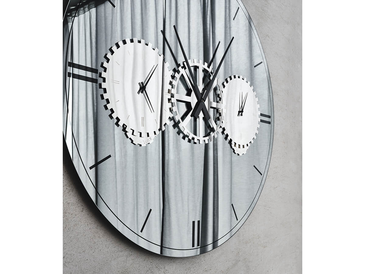 A timeless object, capable of enclosing modern eras and vintage flavors in a single solution. Times embodies the charm of a mirror, embodied in the solid practicality of the wall clock. It is a decorative design accessory that retains a unique and irreplaceable function. It consists of three dials to be placed on different time zones. The left dial can be adjusted to New York, London or Rome, while the right dial to Moscow, Tokyo or Sydney. Cities are engraved on the rotating mirror below. The result is an elegant, contemporary, beautiful and above all, useful object