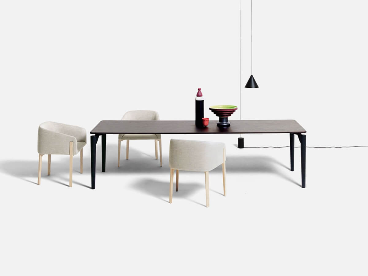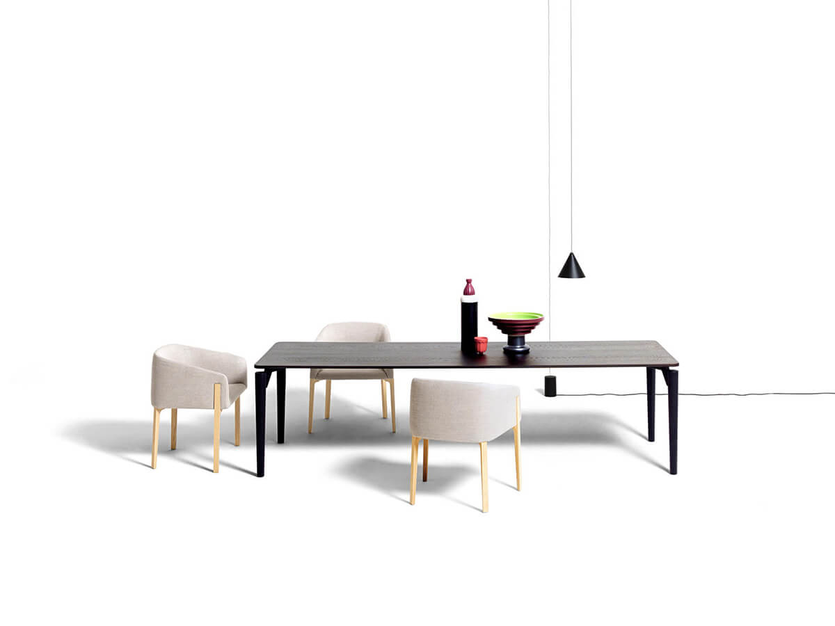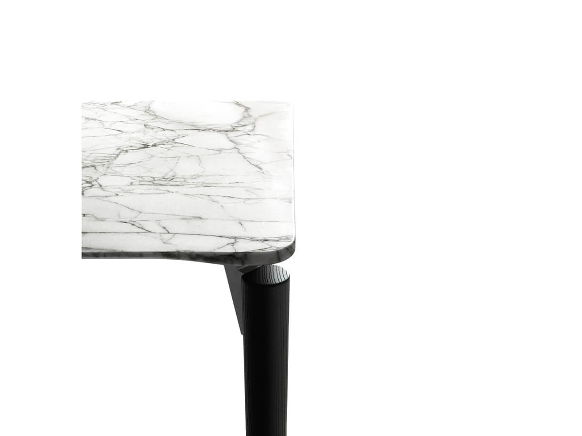 The '95 table by De Padova is one of the most evocative creations of Achille Castiglioni's more mature period. The top, which can be made in wood or marble, seems to float above the sturdy base thanks to thin support brackets hidden from view, creating a visual effect of lightness and harmony. Its distinctive element is precisely the joint between the leg and the top, characterized by a large recess that gives a feeling of momentum and solidity at the same time. The '95 table can be made in different variants: oval, rectangular or round. In the latter case it is distinguished by the presence of only three legs and can also be equipped with a central revolving shelf.