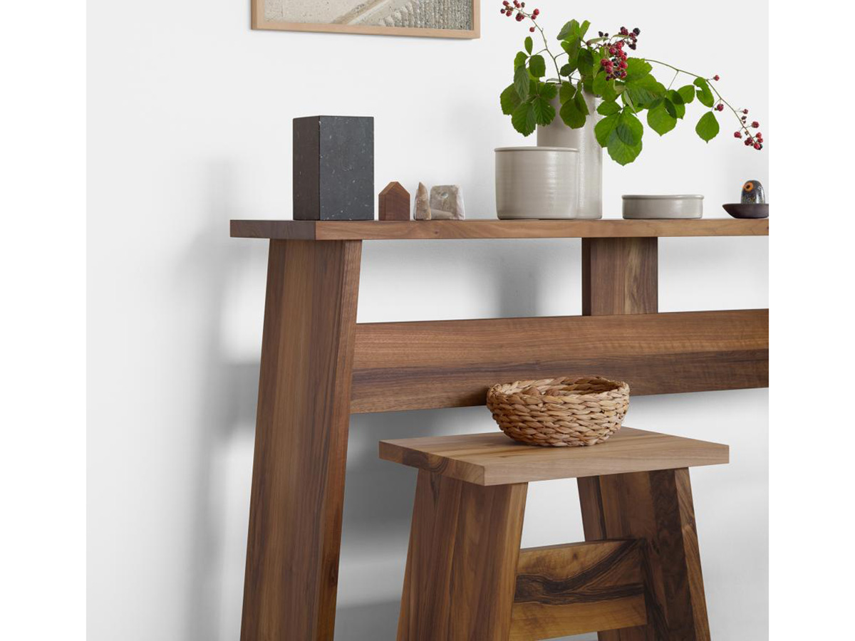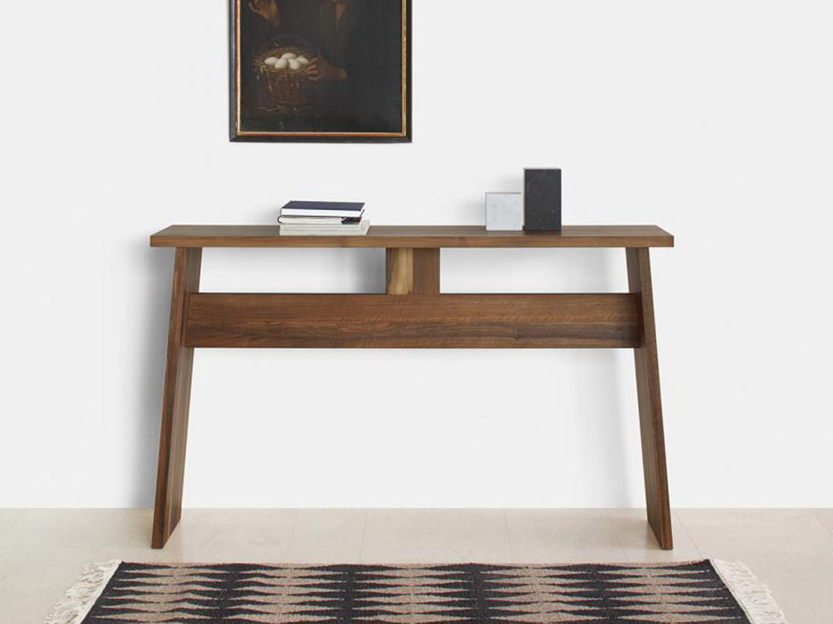 Originality and design meet in this console with a strongly squared cut and a singular personality, strong yet attentive to compositional detail. Drayton was born from the artisanal and always contemporary vein of E15 in re-adapting a versatile piece of furniture giving it an even more decisive and fundamental character. The horizontal bar stands out here, a reference to the structural concept of the Fayland table. The minimal shapes accompany a clear design with a strongly Nordic cut. It is made of European walnut and solid oak with an oiled or white surface.