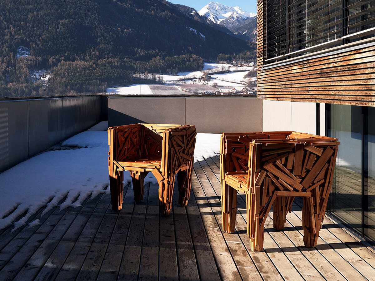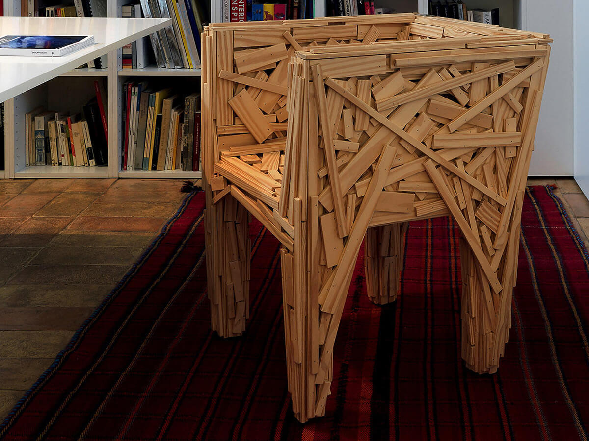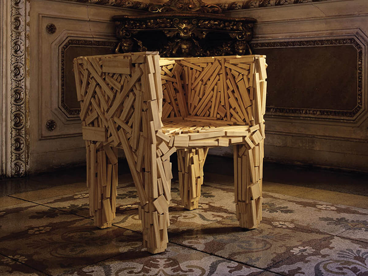 The Favela armchair, produced by Edra since 2003, represents the most famous example of the characteristic "poor design" style of its creators, the Brazilian brothers Fernando and Humberto Campana. Conceived for the first time in 1991 and initially made with recycled materials, the Favela armchair is above all a small essay of conceptual art, inspired by the habit of the inhabitants of the Brazilian favelas of building their homes and furnishings with waste materials. The armchair is made up of many small strips of natural wood nailed by hand in an artisanal process that makes each armchair a unique piece and has a different arrangement from all the others, with strips of several sizes each nailed according to its own angle.