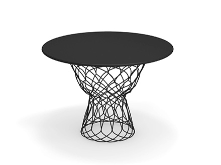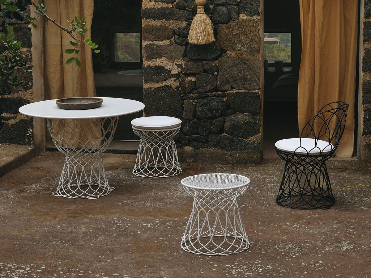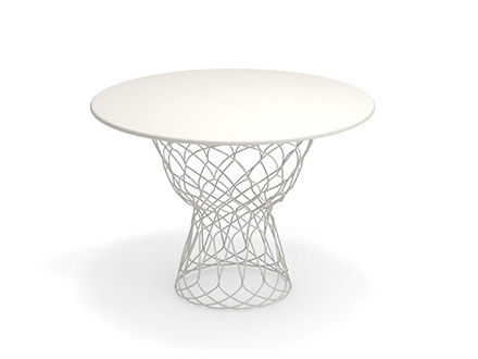 The Re-Trouvé round table, designed by the designer Patricia Urquiola and produced by Emu, reinterprets the traditional wrought iron garden furniture of the 1950s in a contemporary key. The sheet steel top is supported by a central structure in intertwined steel wires that create an unusual and original geometric pattern of great aesthetic impact. Available in white and matt black and in two different sizes, this table adapts to both classic and modern-style environments thanks to the vaguely retro air and the new technologies that have made its creation possible. It can be used to decorate gardens and terraces of private residences but also green spaces of luxury hotels or resorts.