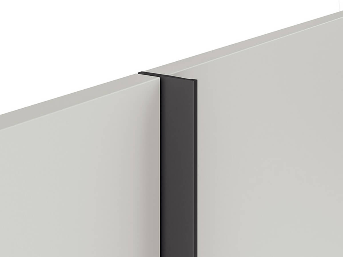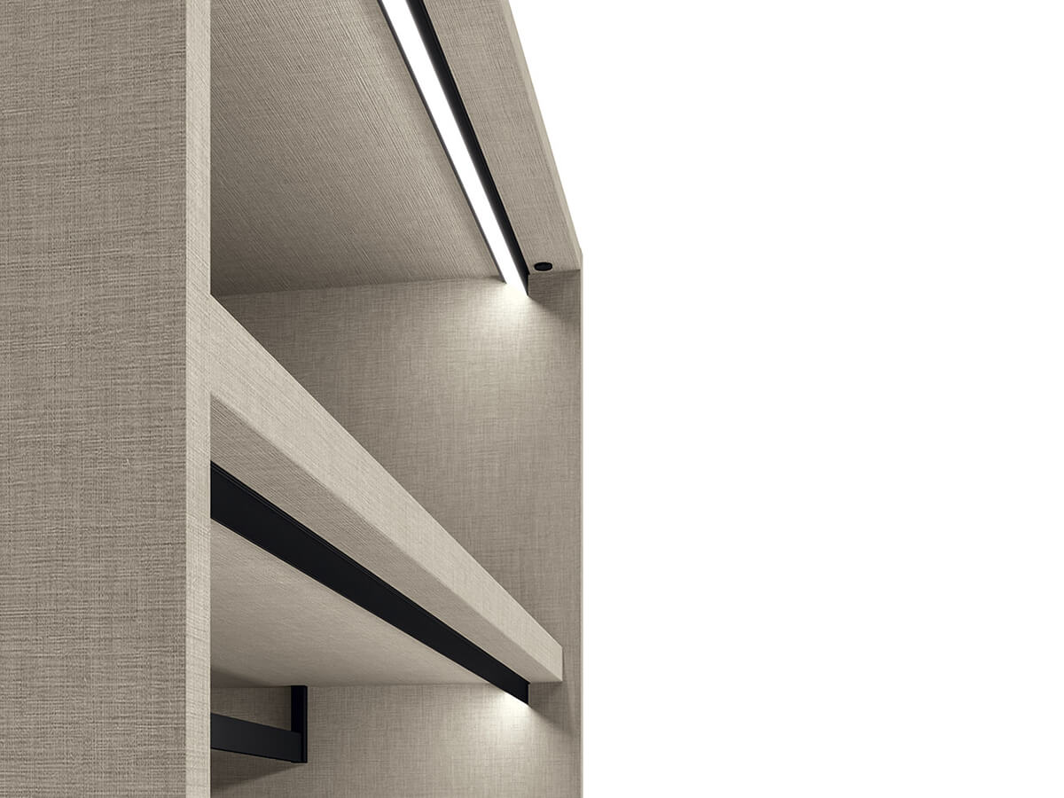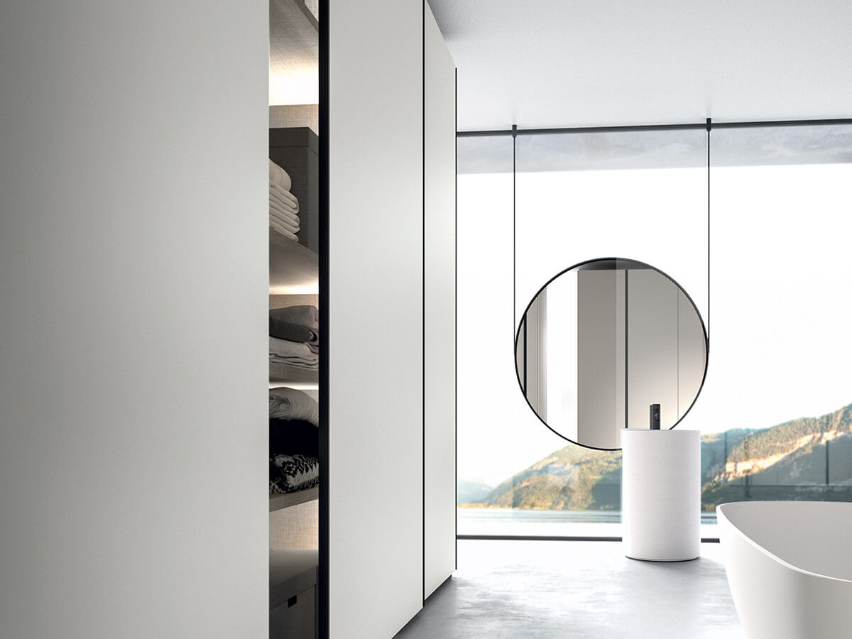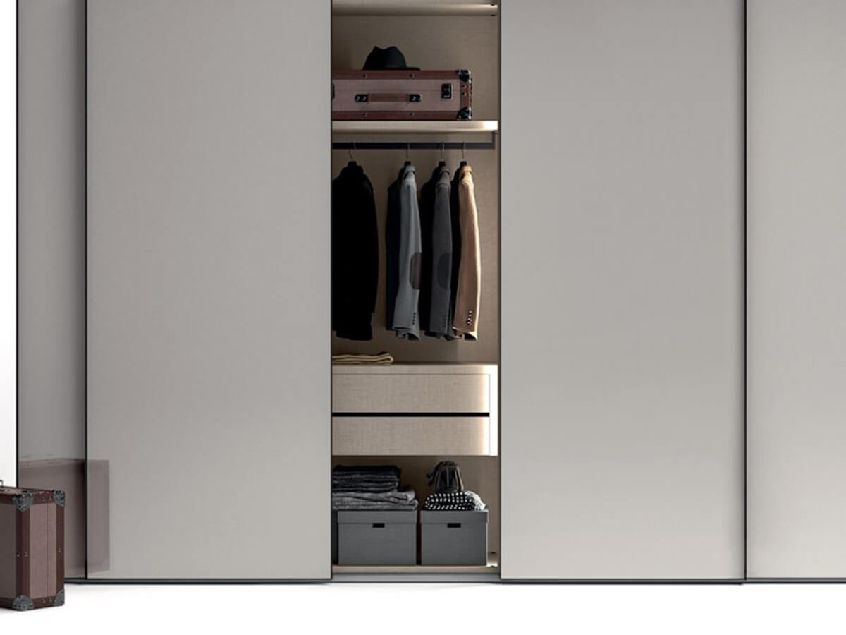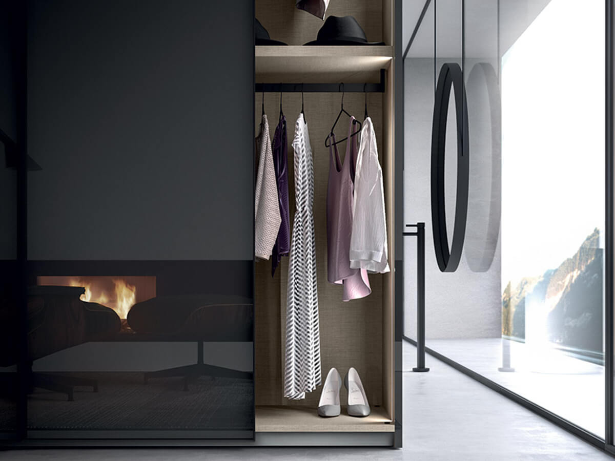 The Geo sliding wardrobe by Erba Mobili stands out for its marked design flexibility and the unlimited possibilities of customization guaranteed by an unrestricted management even of compositions outside the standard sizes. Geo is therefore a real custom-made sliding wardrobe, in which both external sides and doors can take on an always different appearance depending on the designer's wishes thanks to the application of mirrors, glass, fabrics or wallpapers, which are to add to the more than 25 finishes of the melamine faced panels from the Erba Mobili sample collection. The handle, which runs vertically along the entire height of the door, can be made up of a thin protruding metal sheet or a recessed groove.