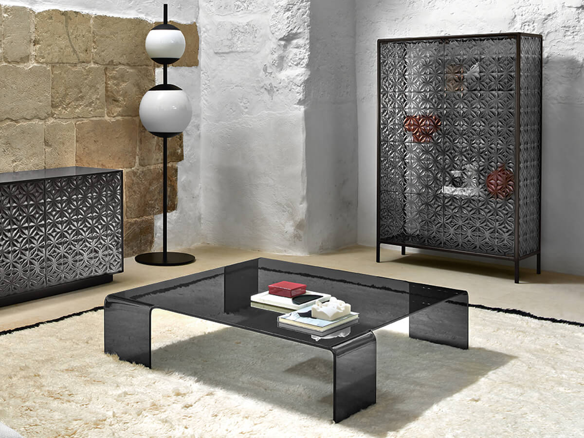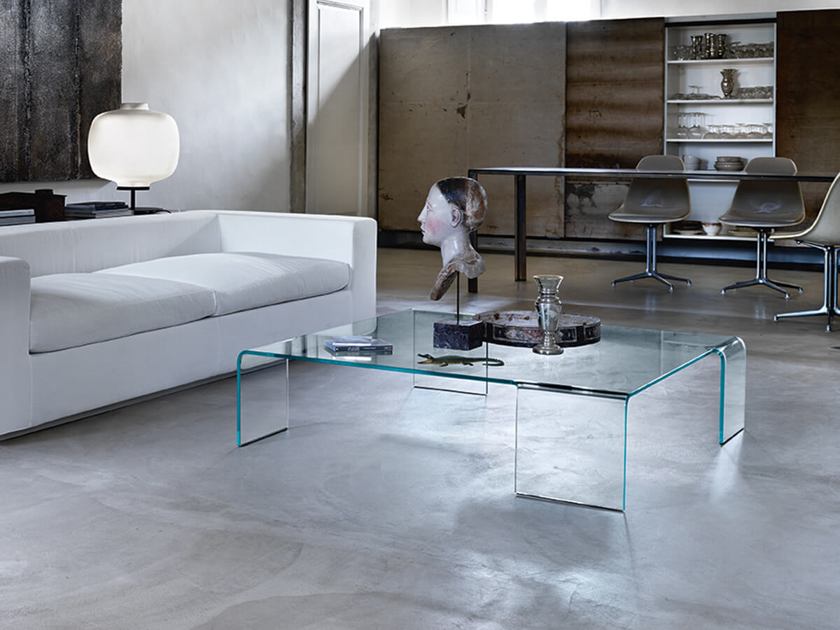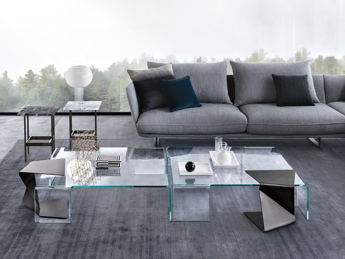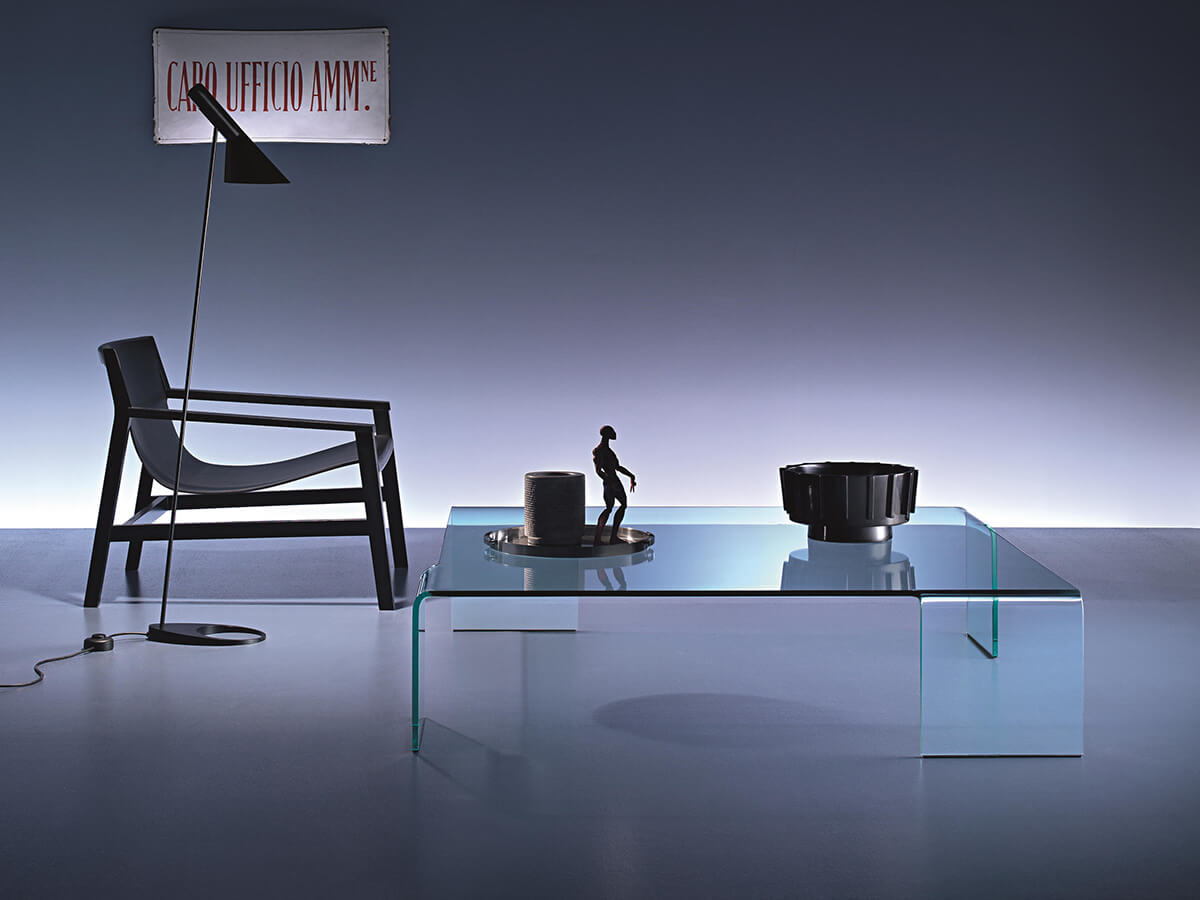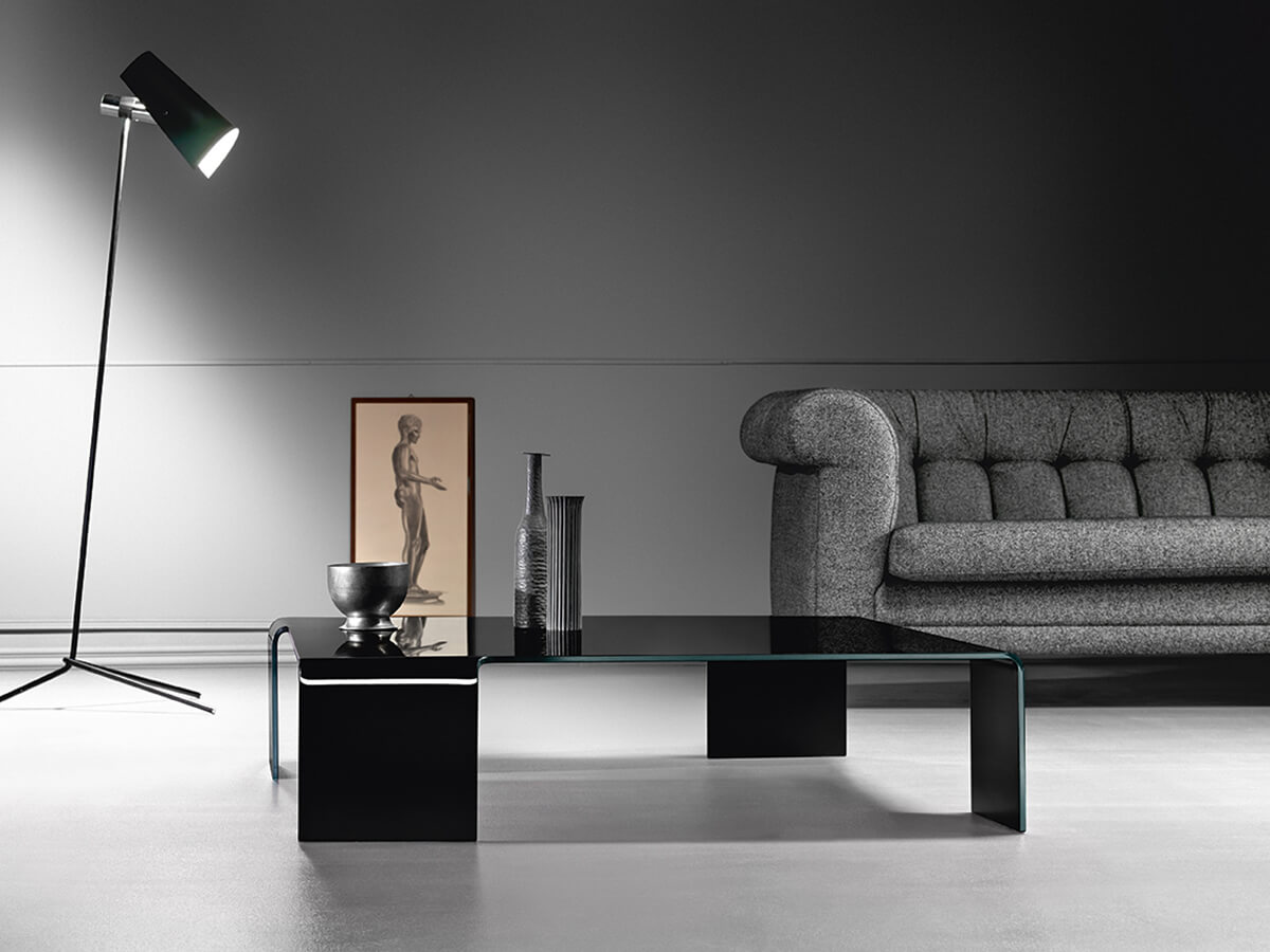 A coffee table with an essential design, capable of recalling softness and simplicity in order to create a whole of great effect. Neutra recalls a style that is not afraid to remove, instead of adding, details to the figure, purifying it of any superfluous part so as to create something new, clear-cut, clean. Neutra stands out precisely for the monolithic 12 mm curved glass top. On request, it can also be extralight glass, white back-painted extralight glass and black back-painted glass, so as to create variability within the different environments. Whatever the solution, Neutra is a coffee table that is well suited to sophisticated living rooms and living spaces, where there is a need for a particularly sophisticated support surface.
