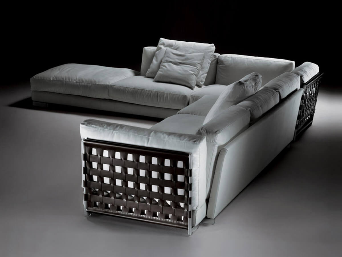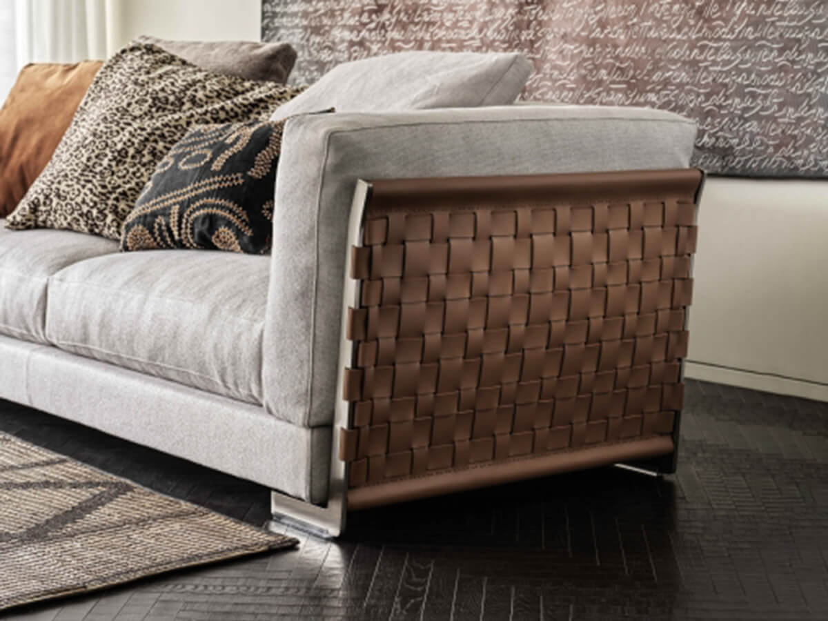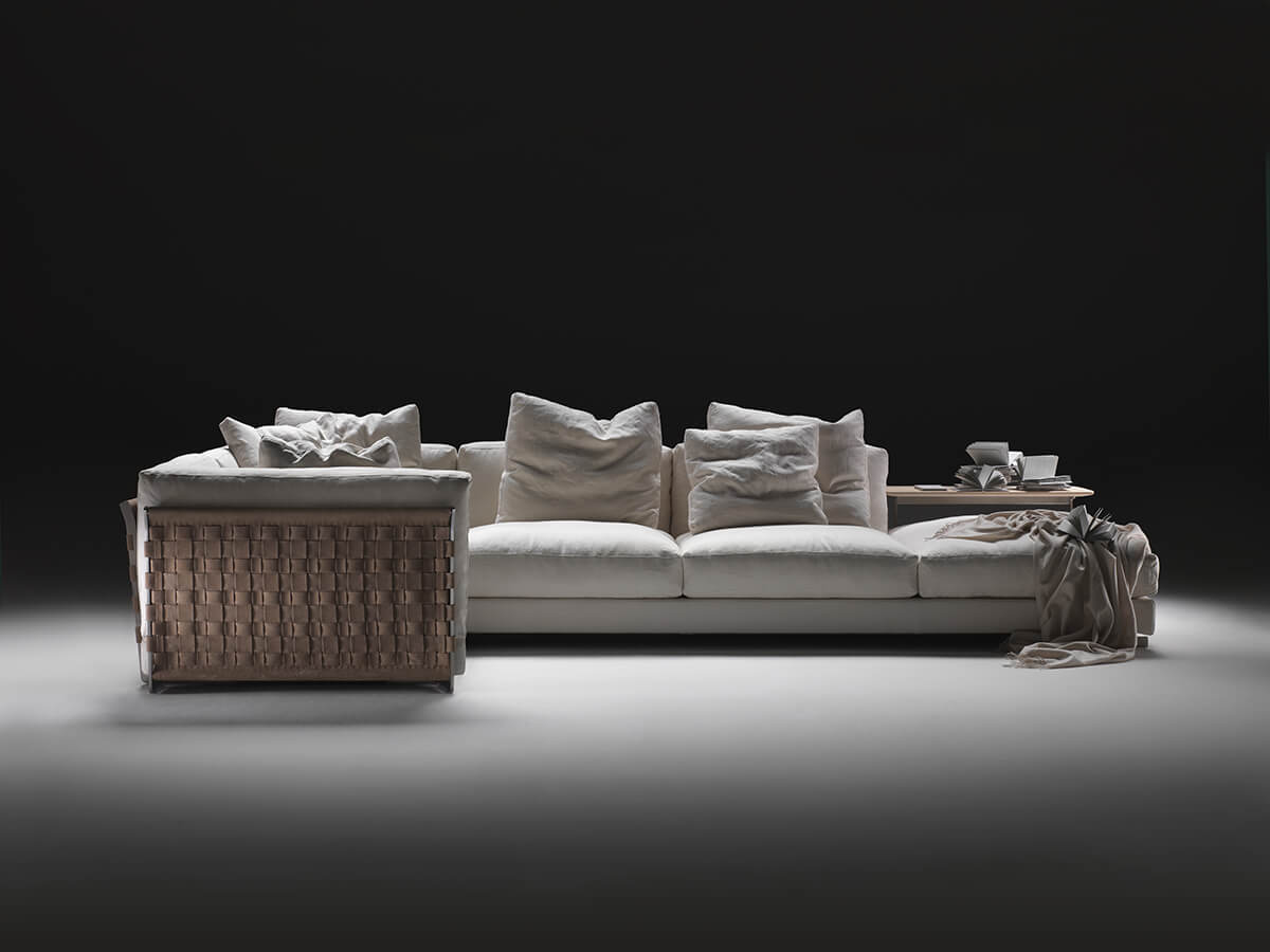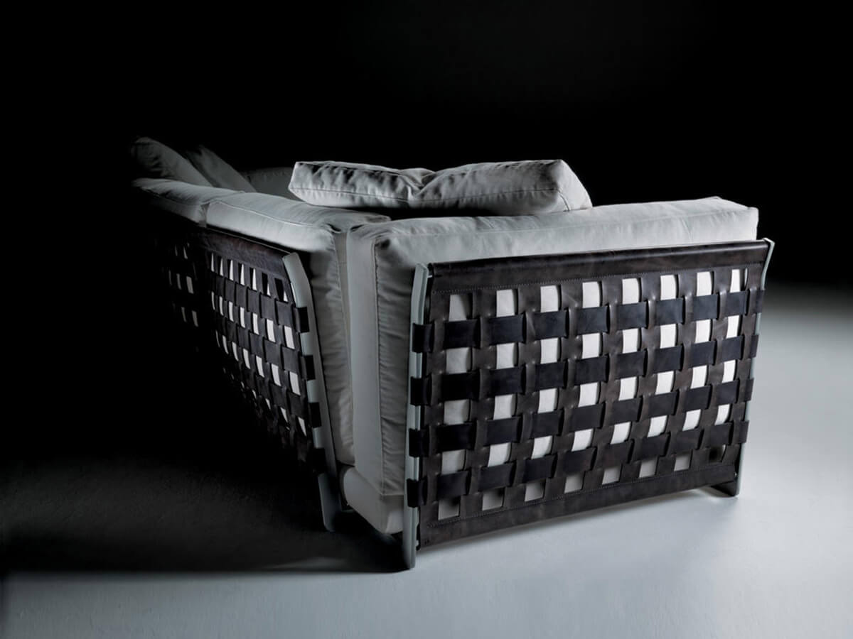 Cestone is a sofa designed to be placed in the center of living spaces, or anywhere in a space where it is possible to admire the intertwining of the back and sides. These two elements are generally neglected in common living room sofas, as the placement against the walls does not make the back of the seat visible. Here Flexform completely overturns the paradigm, creating a back and sides made up of metal frames covered in woven leather. There are two options for interlacing the irregular weave made with strips of leather in two lengths: thicker or thinner, created to show the upholstery of the padded parts. The resulting checker effect has a strong aesthetic impact and creates an excellent contrast with the padded parts.* Technical features: Classic Cestone version: elements depth 97 cm - Cestone 09 version: elements depth 114 cm