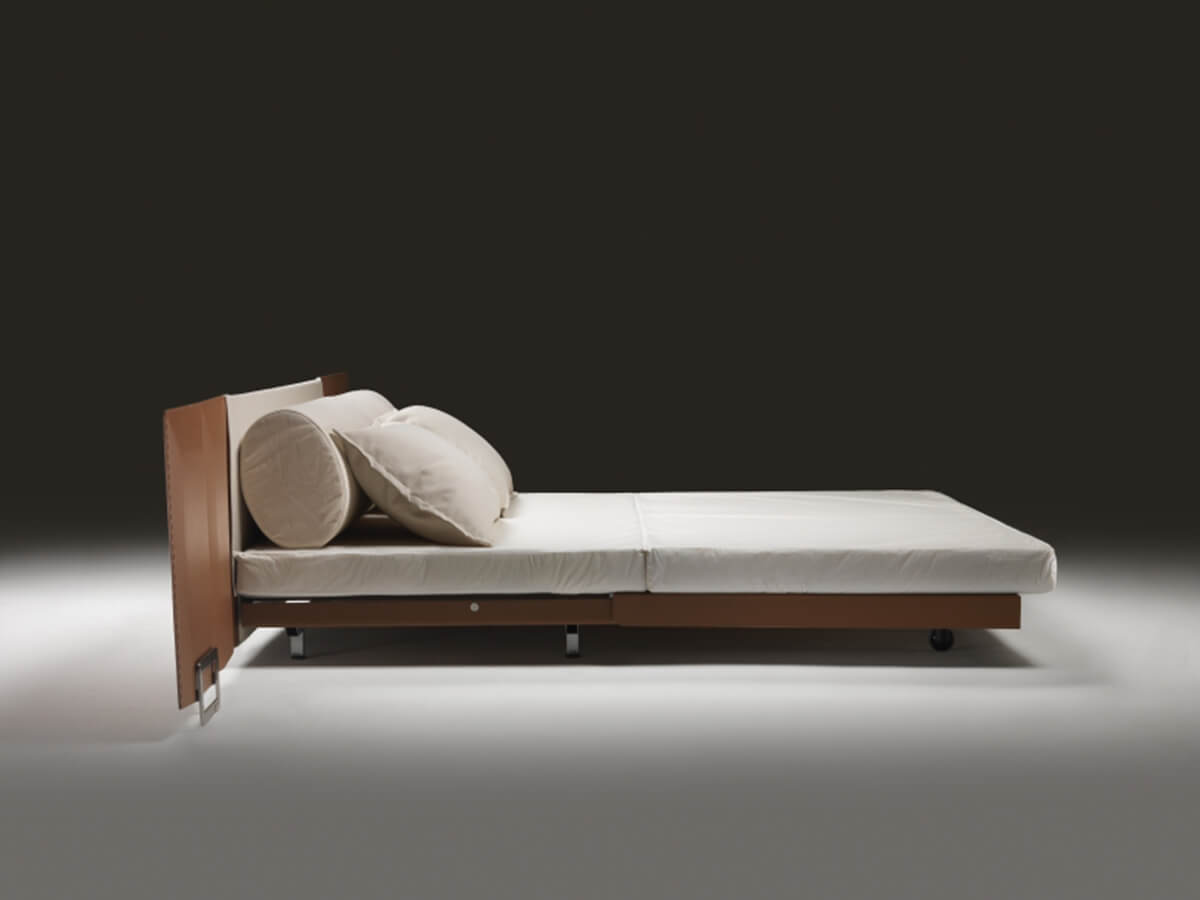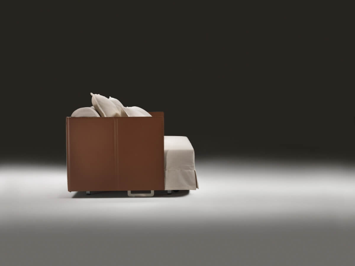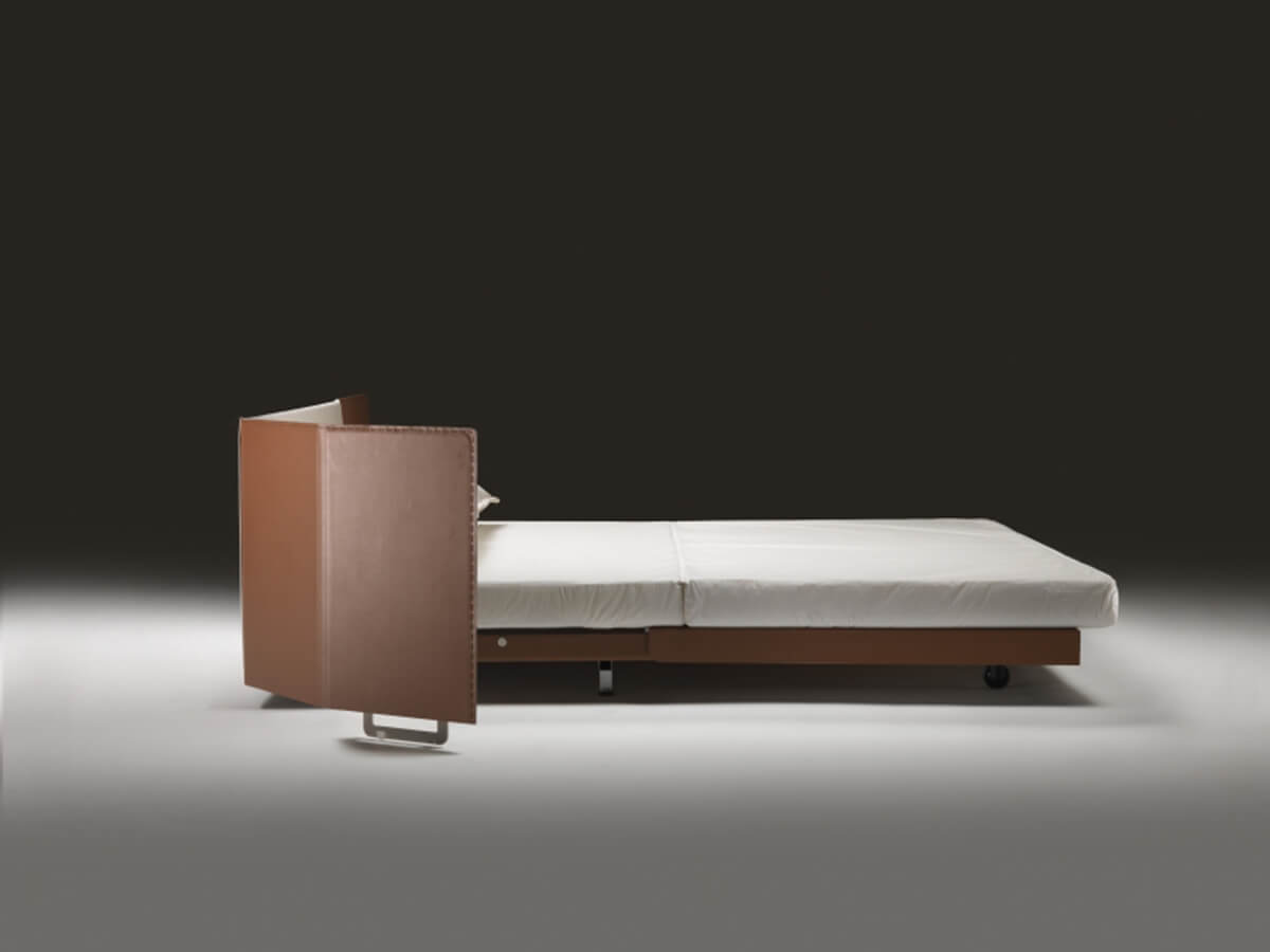 Eden is an elegant sofa bed, capable of dressing a double night and day function without ever losing its own personal stylistic touch, the result of the creative genius of Antonio Citterio. Eden is characterized by simple lines embellished with sophisticated packaging, enhanced by the use of leather that raises its value. Backrest and armrests are made of wood, entirely covered in leather and structured to support important roller cushions with polyurethane foam and dacron padding, as well as soft goose down cushions.* Technical features: for the version with double mattress, metal feet available in satin, chrome, black chrome, champagne and burnished finish.For both versions, metal platform with wooden slats