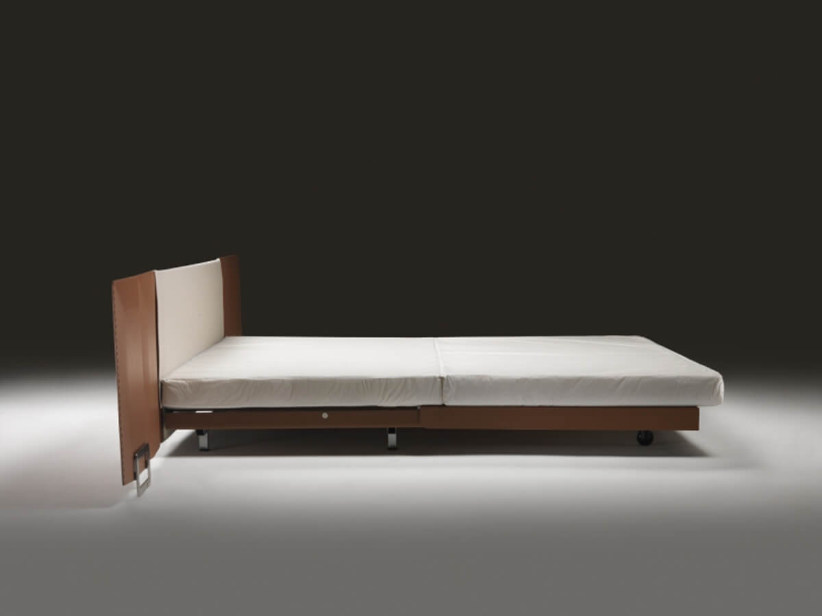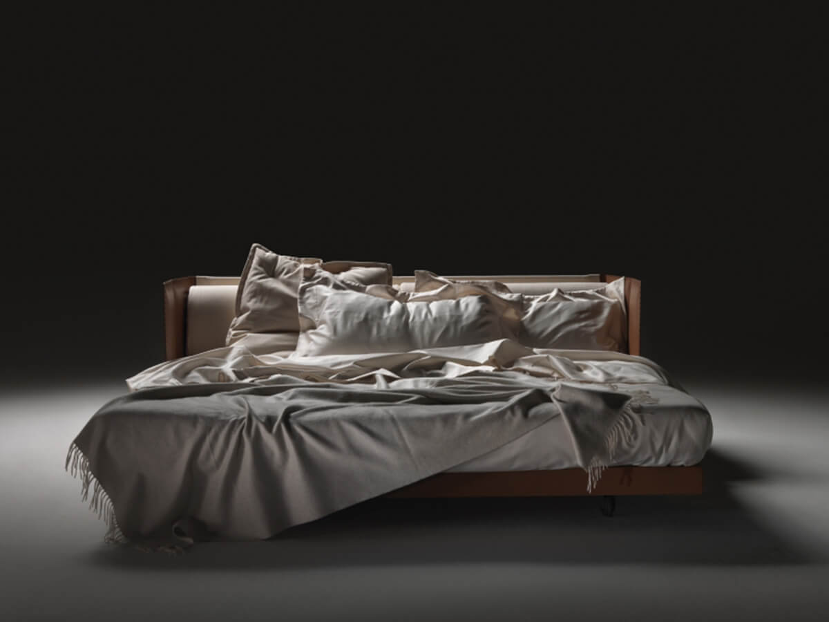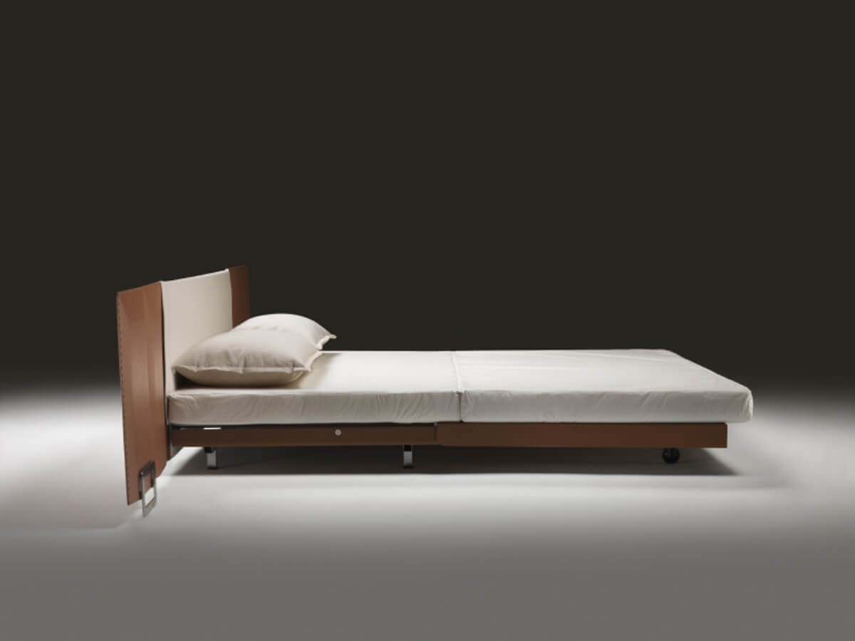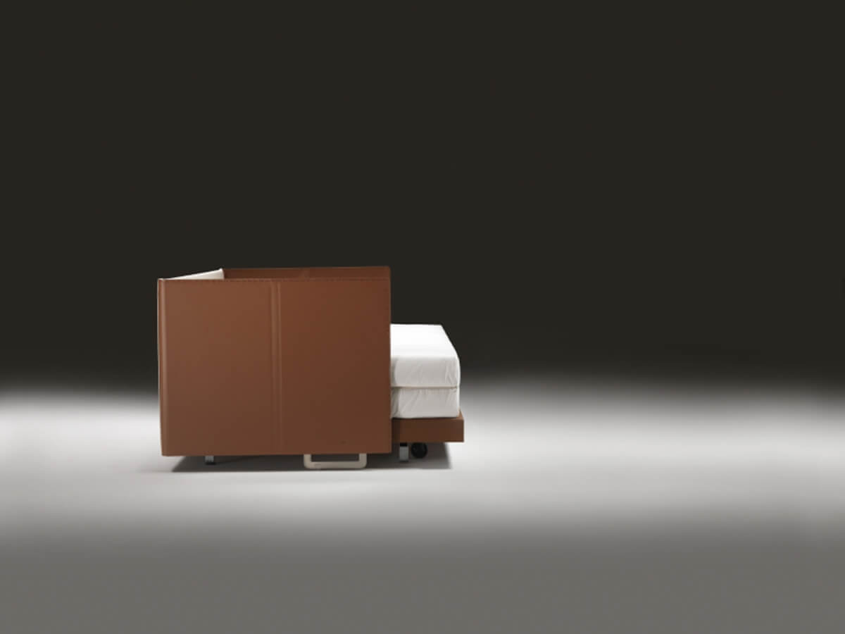 Eden is an elegant sofa bed, capable of dressing a double night and day function without ever losing its own personal stylistic touch, the result of the creative genius of Antonio Citterio. Eden is characterized by simple lines embellished with sophisticated packaging, enhanced by the use of leather that raises its value. Backrest and armrests are made of wood, entirely covered in leather and structured to support important roller cushions with polyurethane foam and dacron padding, as well as soft goose down cushions.* Technical features: for the version with double mattress, metal feet available in satin, chrome, black chrome, champagne and burnished finish.For both versions, metal platform with wooden slats