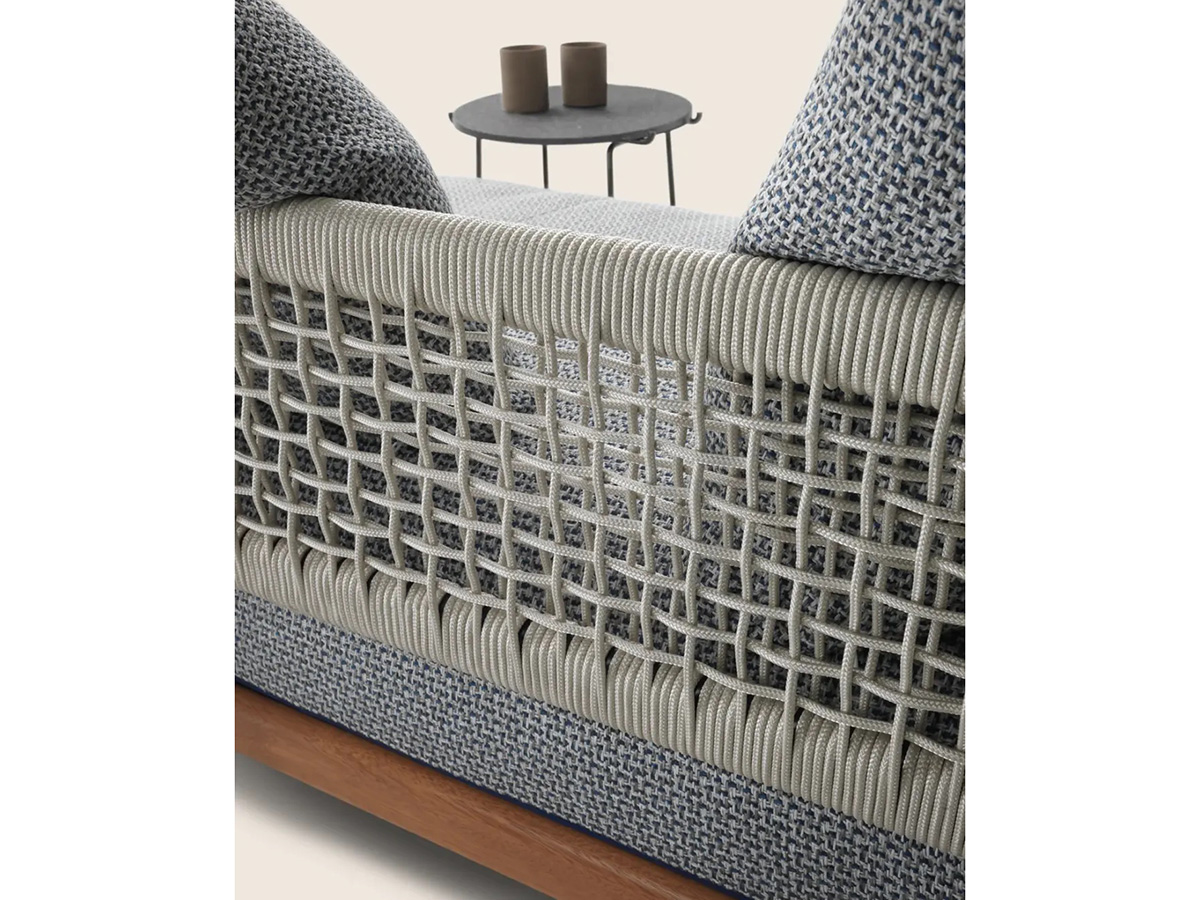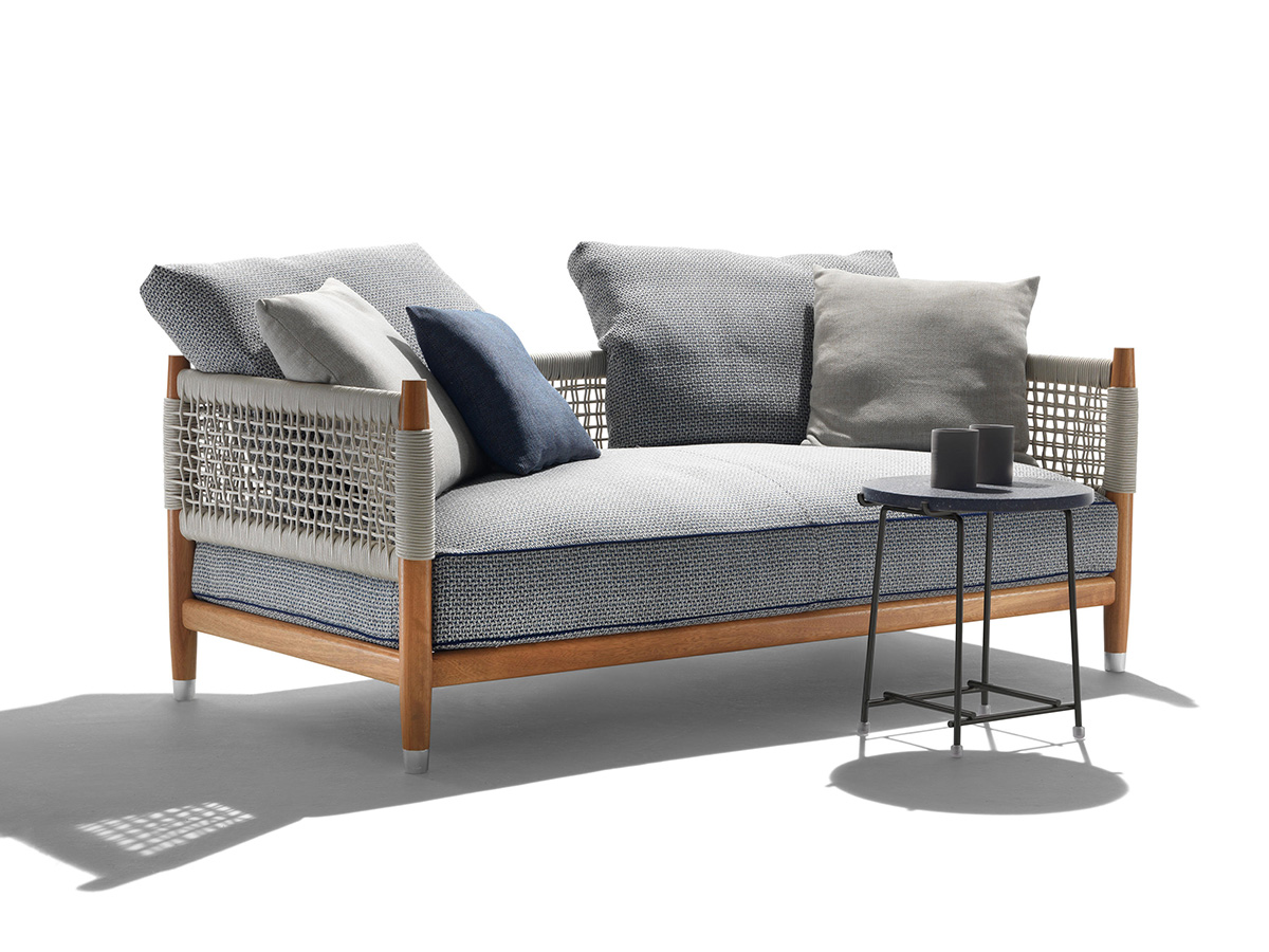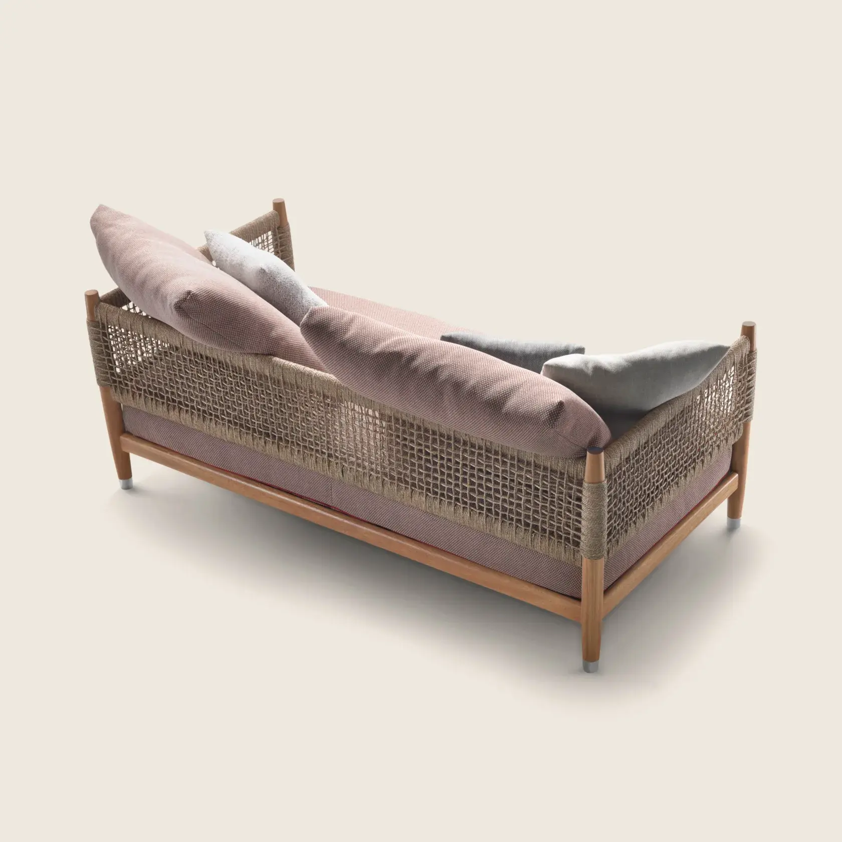 With a retro inspiration, the Parker Outdoor sofa designed by designer Antonio Citterio and produced by Flexform features light lines and a characteristic rope weave for the backrest and armrests. The structure is in steel and solid Iroko wood, available in different finishes, while the seat cushion is covered in removable and water-repellent fabric, packaged with a refined grosgrain profile. Optional cushions are available upon request to integrate those of the backrest and make the sofa more comfortable. Different configurations are possible thanks to the availability of two or three seater sofas, poufs and an element with a backrest and a single armrest. The essential and refined design and the high quality craftsmanship of this product allow you to furnish verandas, terraces and gardens with style.