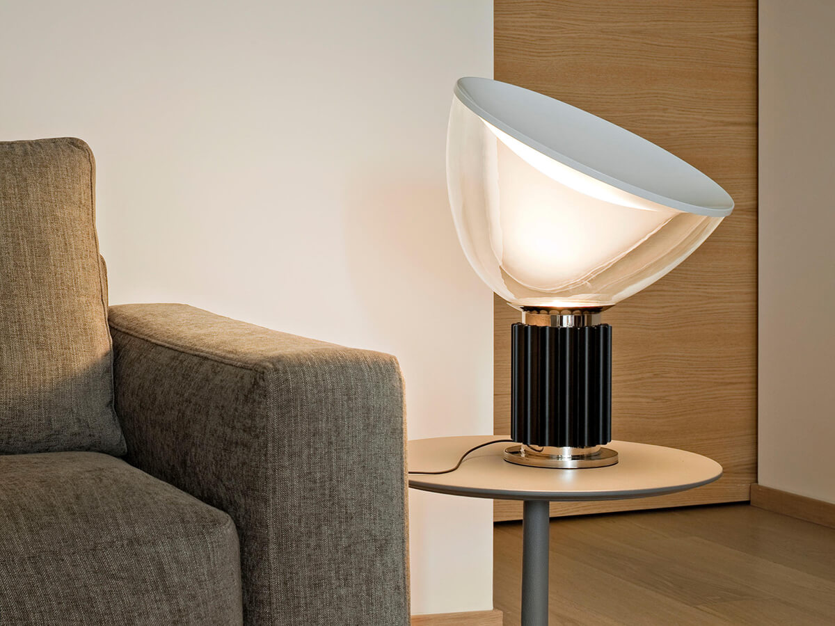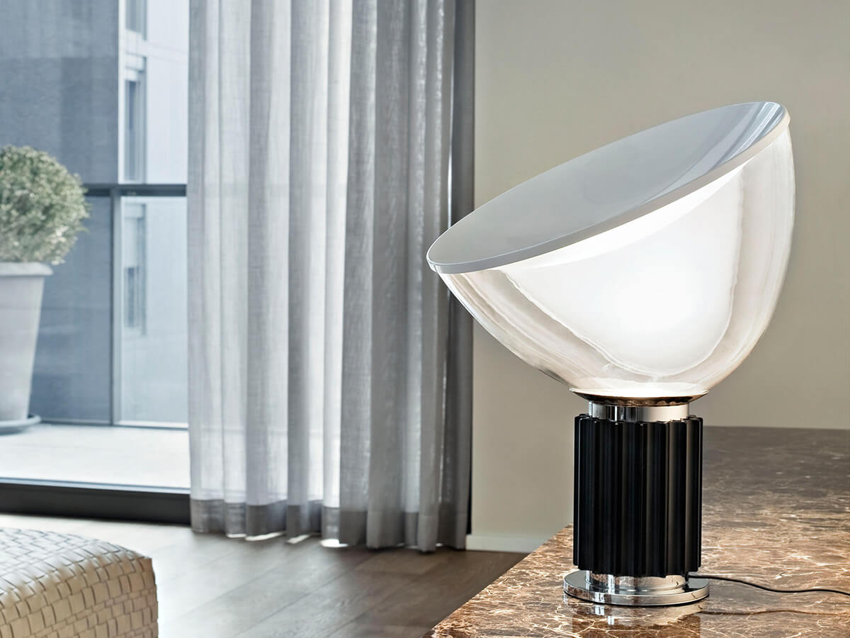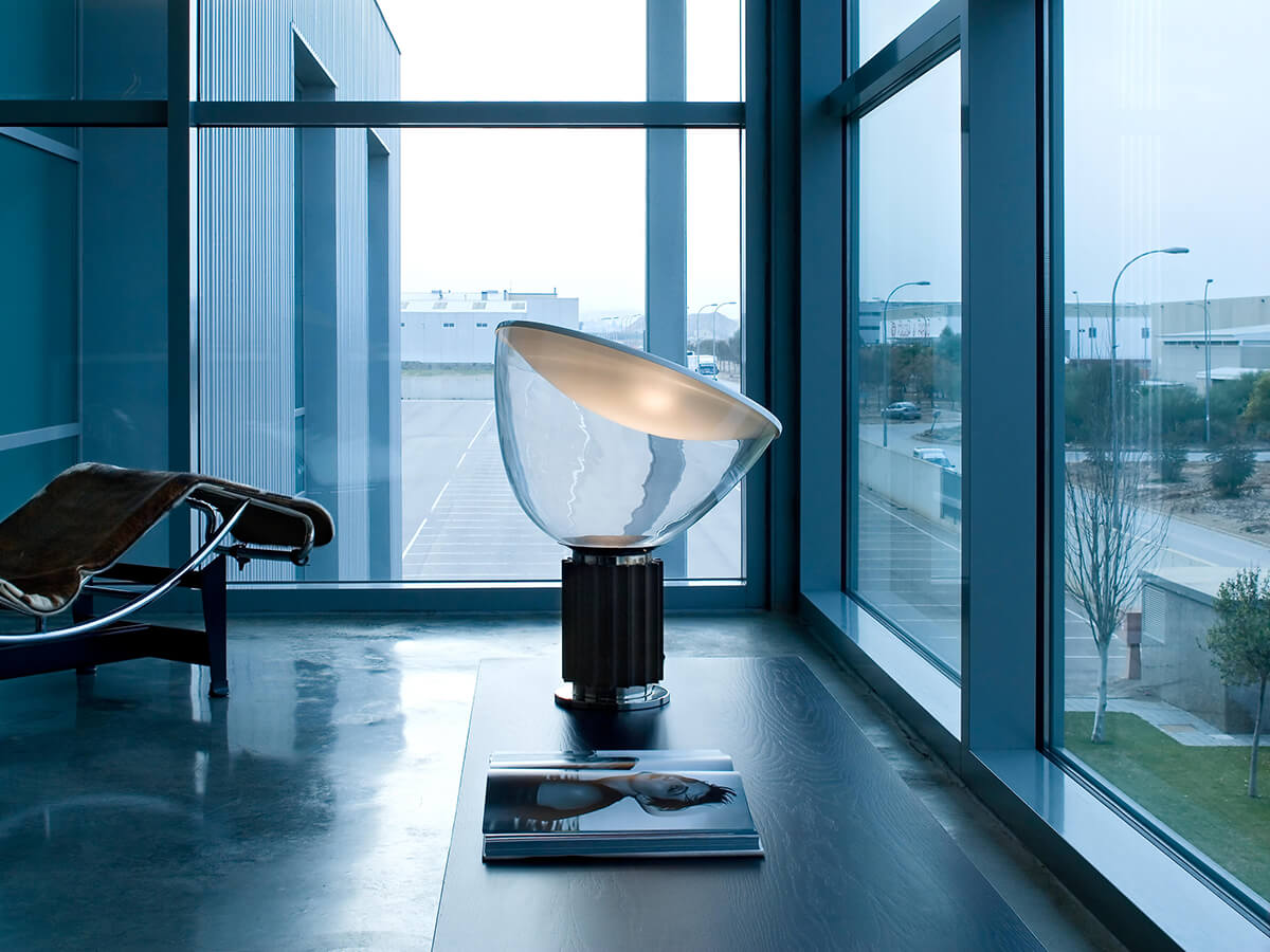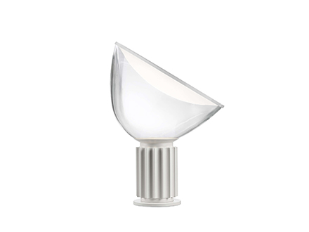 An icon of the past that since the year it was put into production in 1962 continues to be one of the best known and marketed products of the Flos brand. Taccia was born as a table lamp with indirect and reflected light, composed of a metal reflector painted in glossy white liquid internally and white powder coated externally. The large diffuser is adjustable and it is made of transparent mouth-blown glass. The solid body in extruded aluminium offers the perfect base to support this voluminous and highly suggestive structure. Taccia is an elegant and iconic element, capable of adapting to different furnishing contexts without ever losing its masterful distinctive touch.