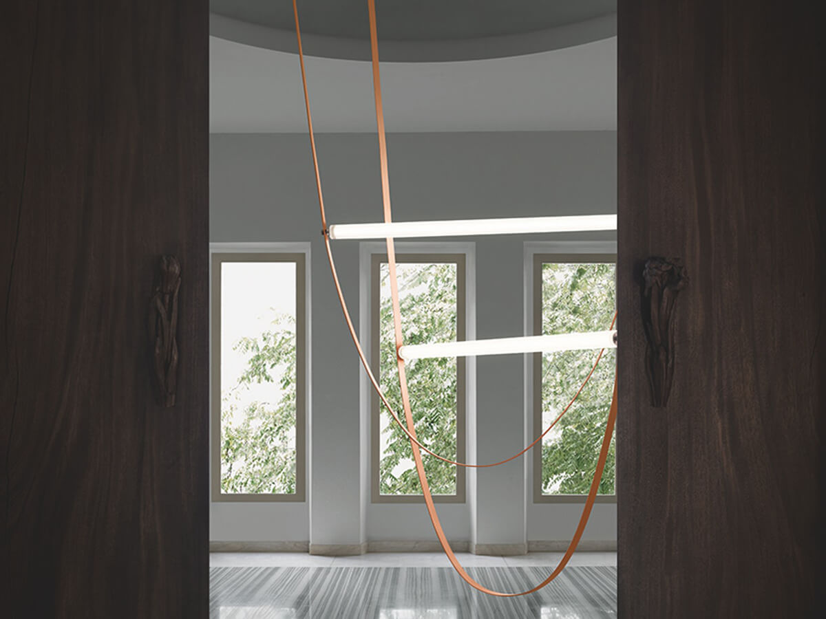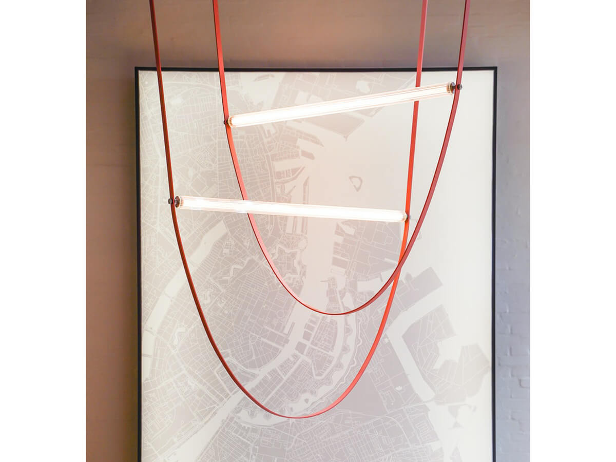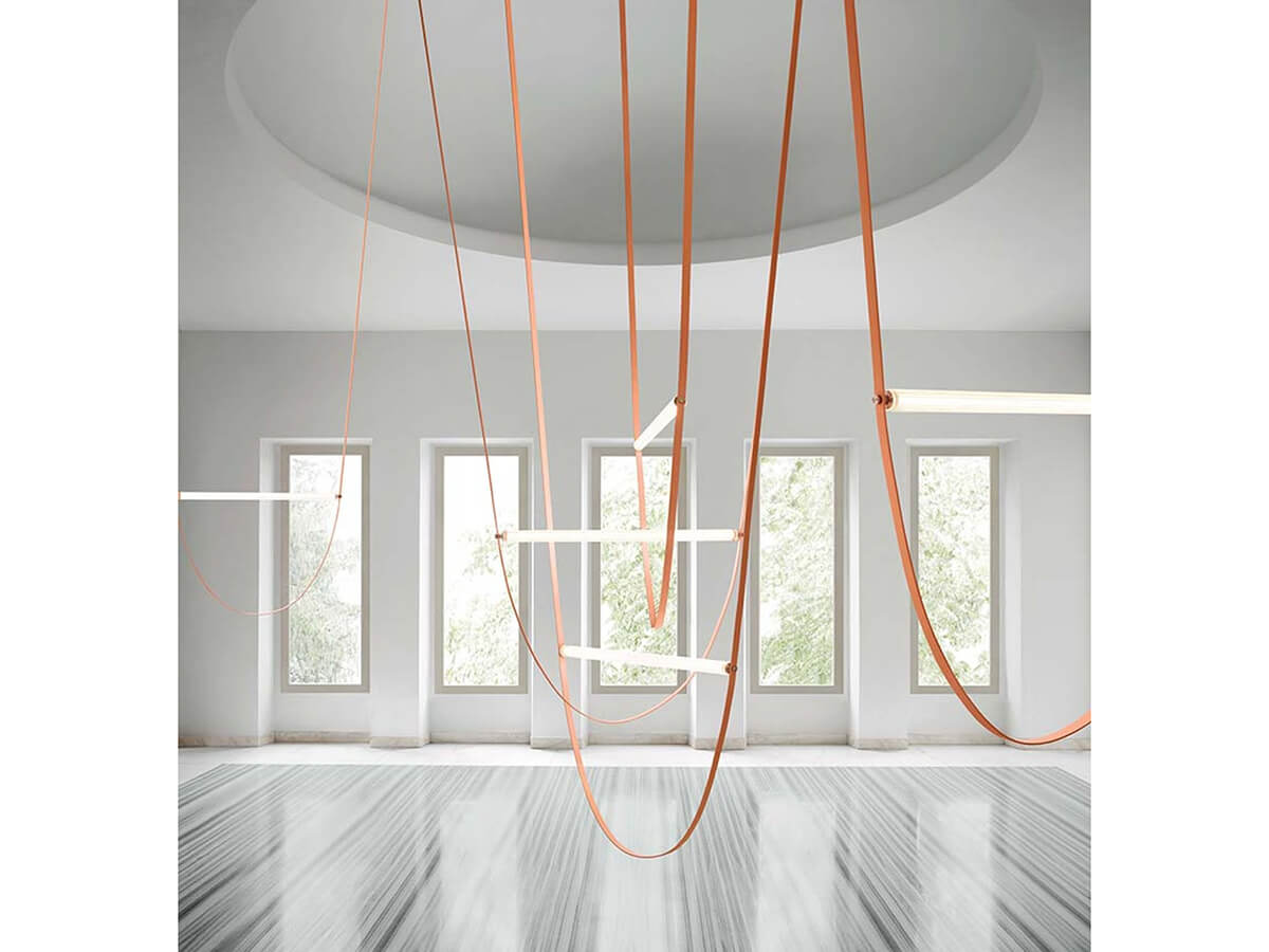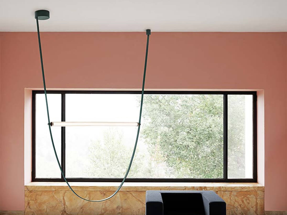 The Formafantasma studio designs the Wireline suspension lamp for Flos, which blends industrial style with artistic and playful expression. The reflection on the electric cable constitutes the soul of the project not only from a functional but also a formal point of view. The pink rubber strap o forest green, combined with the rosettes with the same finishes, creates the shape of the lamp and supports it a borosilicate glass rod that contains the LED light source. Ideal close to a wall but even in the center of the room, in a domestic or contract environment, Wireline integrates easily into contemporary contexts but also period thanks to its singular shape and neutral colors but at the same time trendy.