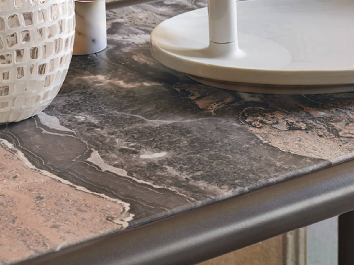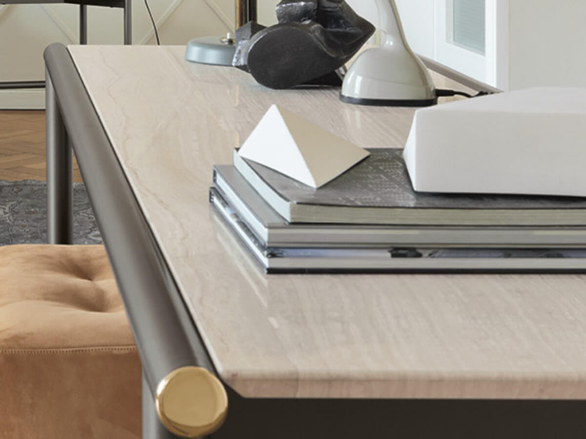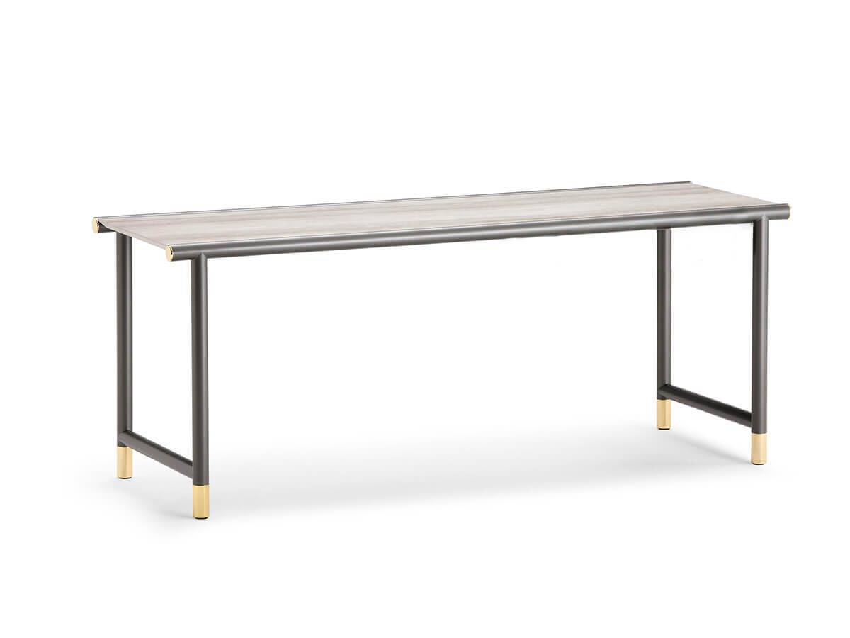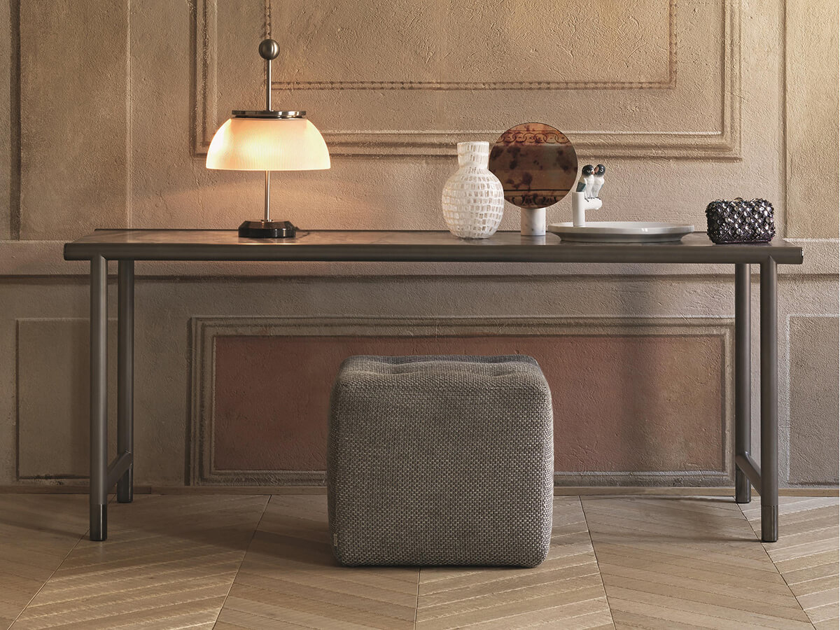 Lightness, purity and structural quality. Rodolfo Dordoni's design gives life to a new suspended and almost impalpable work, ideal whether you want to use it as a desk, console or as a simple shelf. Iko comes in numerous guises and finishes, among which we mention marble, and is also available in the variant with ebony top, precious and characterizing. The underlying iron structure is in turn customizable, embellished in the lower part with details in shiny gold or other finishes of extreme value. Due to its conformation, Iko does not have a favorite room or environment, but lives perfectly wherever it is needed, enriching every corner of the house.* Technical features: structure in matt burnished tubular steel