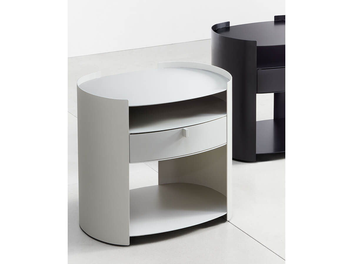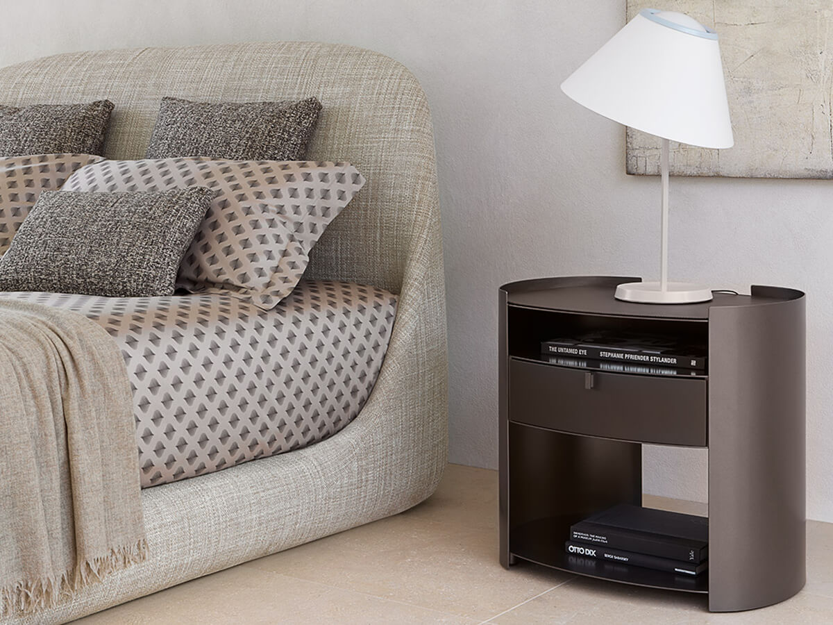 Minimum profiles and thicknesses characterize the simple and functional design of the Lotus bedside table, designed by Emanuela Garbin for Flou. The curved metal structure gives lightness and stability to this piece of furniture equipped with three comfortable shelves and a useful drawer. The profile of the upper top can be customized with a leather top matched to the colors of the structure. The numerous finishes available, from metallic nuances to white, black and colors more decisive, make it easy to combine it with any type of bed and environment.