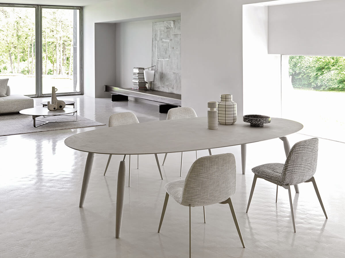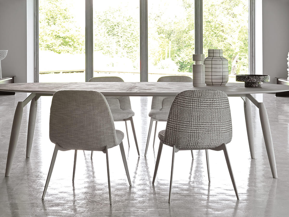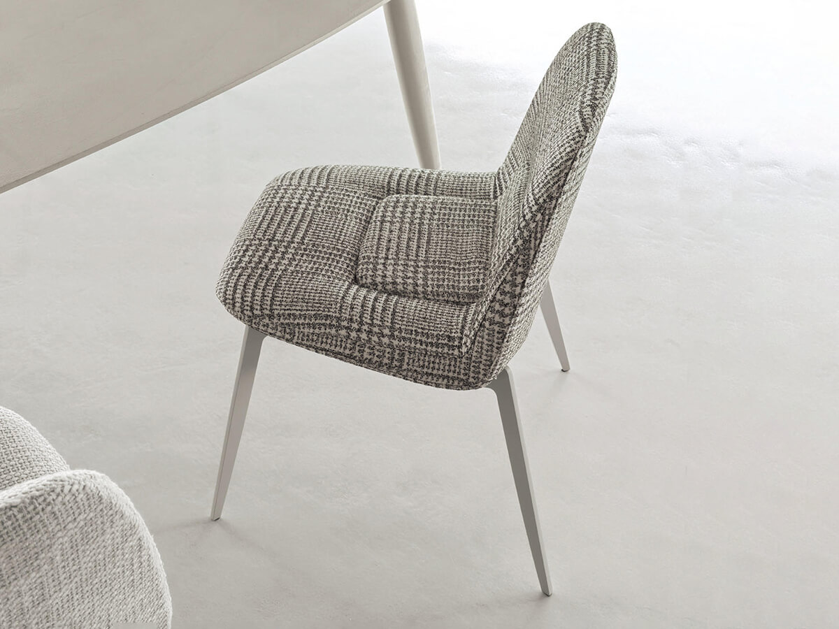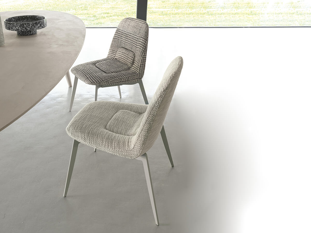 Elegance and practicality are based on this piece of furniture with great character, ideal whether you want to place it in a dining space or in the more versatile living area. Briscola has a softly rounded and welcoming seat and backrest, in stark contrast to the strong lines of the metal legs and available in different finishes including matt burnished, anodic bronze, matt greige and much more. The tailored cuts of the upholstery give softness and comfort to the seat, which in turn is available in a range of choices between fabric and leather.