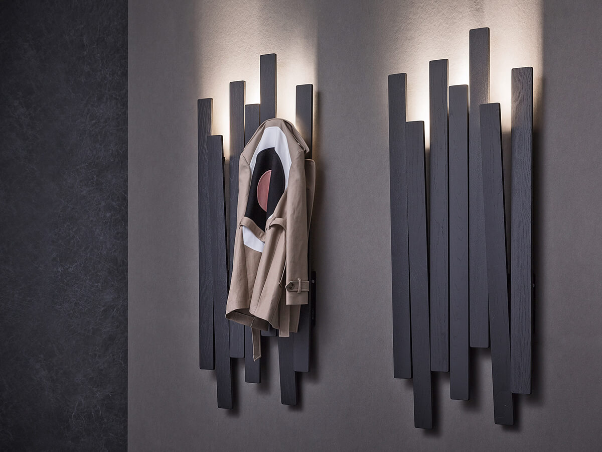 A piece of furniture halfway among sculpture, art and high-end design. Ski incorporates the essentiality of shapes combined to form something suggestive, elegant and above all functional, without however neglecting a pinch of taste. It comes from a curious story: the observation of a sequence of skis leaning against the wall of a shelter and used as coat hangers. The slender wooden slats that compose it are a clear reference to this memory, negligible elements in themselves that together are able to form a new whole. As always, the light gives an absolutely unique detail to the whole, creating a play of shades and enhancing the main structure.*Technical features: LEDs inserted in the sequence of slats