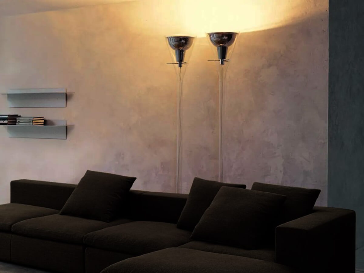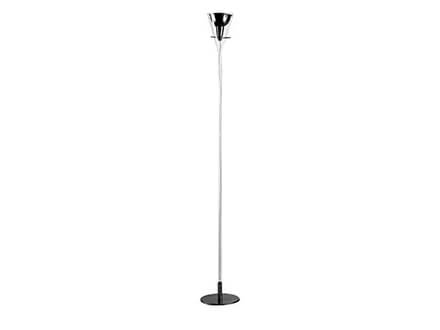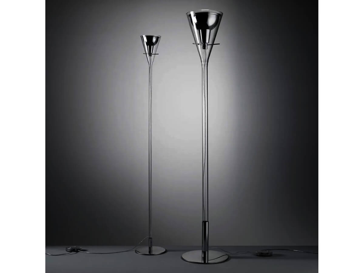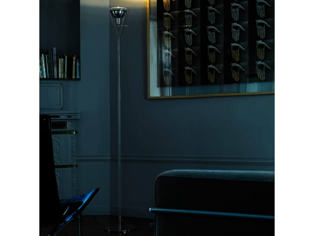 Designed by Franco Raggi in 1999, the Flute floor lamp by Fontana Arte is a clear reference to one of the company's great classics, the famous Luminator by Pietro Chiesa from 1932, whose basic concept is revised and updated with the addition of a witty play of transparencies. Like her model, Flute is also a lamp with indirect lighting, with the light source pointing towards the ceiling to make the light refract from there throughout the room, and like her, it has a long stem that opens slightly towards the top. in a thin cone - hence the name, as it resembles a glass of champagne. Flute, however, is a "stripped-down" Luminator: with the exception of the base, with its elegant chromed metal finish, its entire structure is transparent, allowing you to see the internal mechanism, that is the electric wire that runs along the entire stem and the metal cup that supports and hides the light source, vaulted fixed to the structure by three thin protruding metal rods.