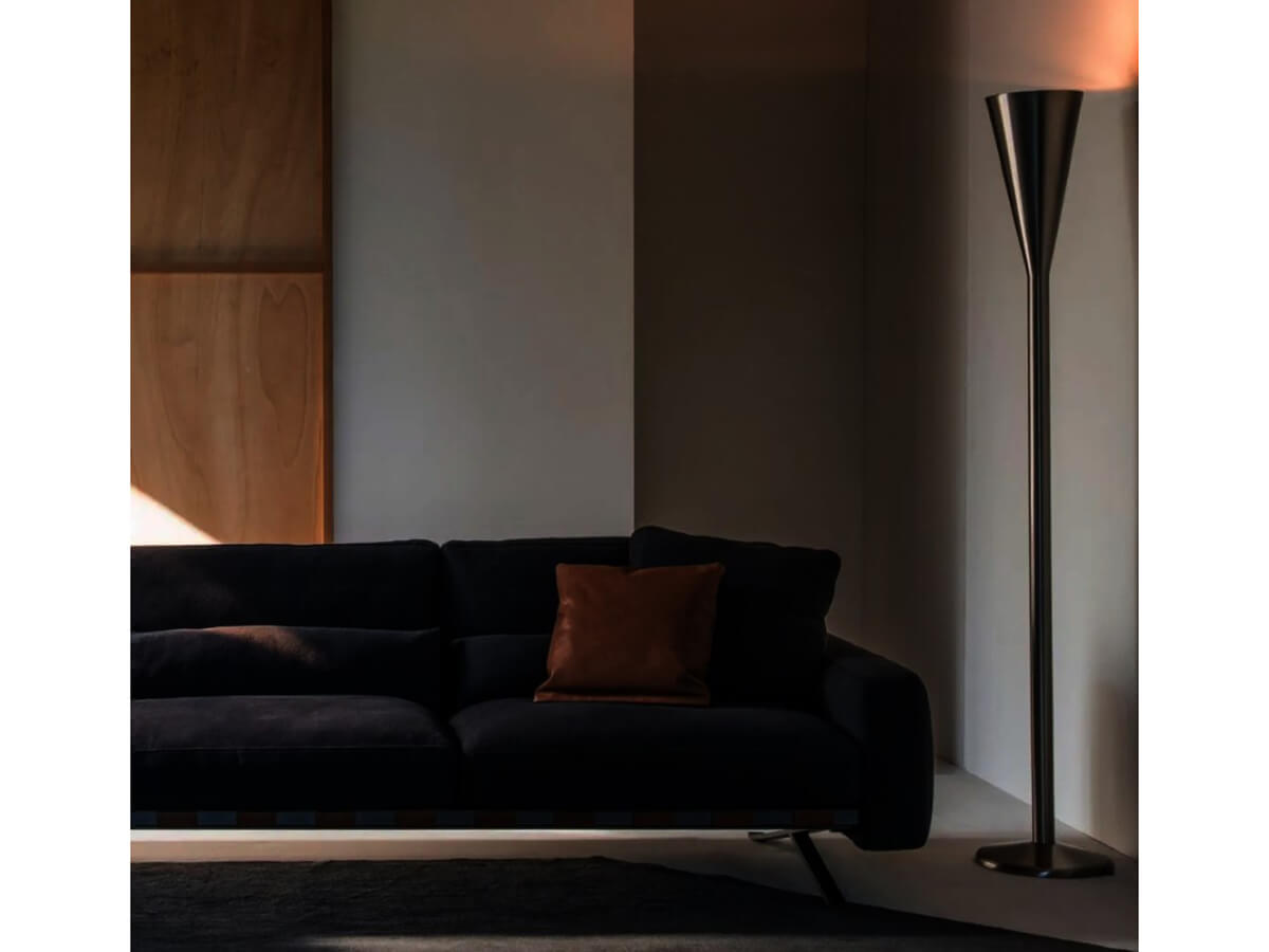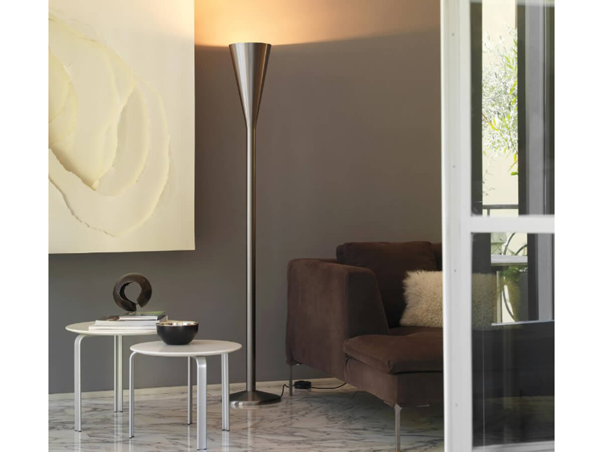 The Luminator floor lamp by Fontana Arte has almost a century of history: it was in fact originally designed by Pietro Chiesa in 1932. The term "Luminator" indicated a kind of floor lamp very widespread in those years, in which light was projected against the ceiling and then refract from there and diffuse into the environment. In the large Luminator chain of Italian design - from the original Bernocchi one designed by Luciano Baldessarri and presented at the 1932 Expo to that of the Castiglioni brothers for Flos in the 1950s - the version of Fontana Arte carves out a prominent role, thanks to the balanced simplicity of the forms and to the measured decorative values. In the Luminator by Pietro Chiesa the long stem opens delicately into a cone in its final part, with the metal coating that covers it in all its parts, hiding the light source from view.