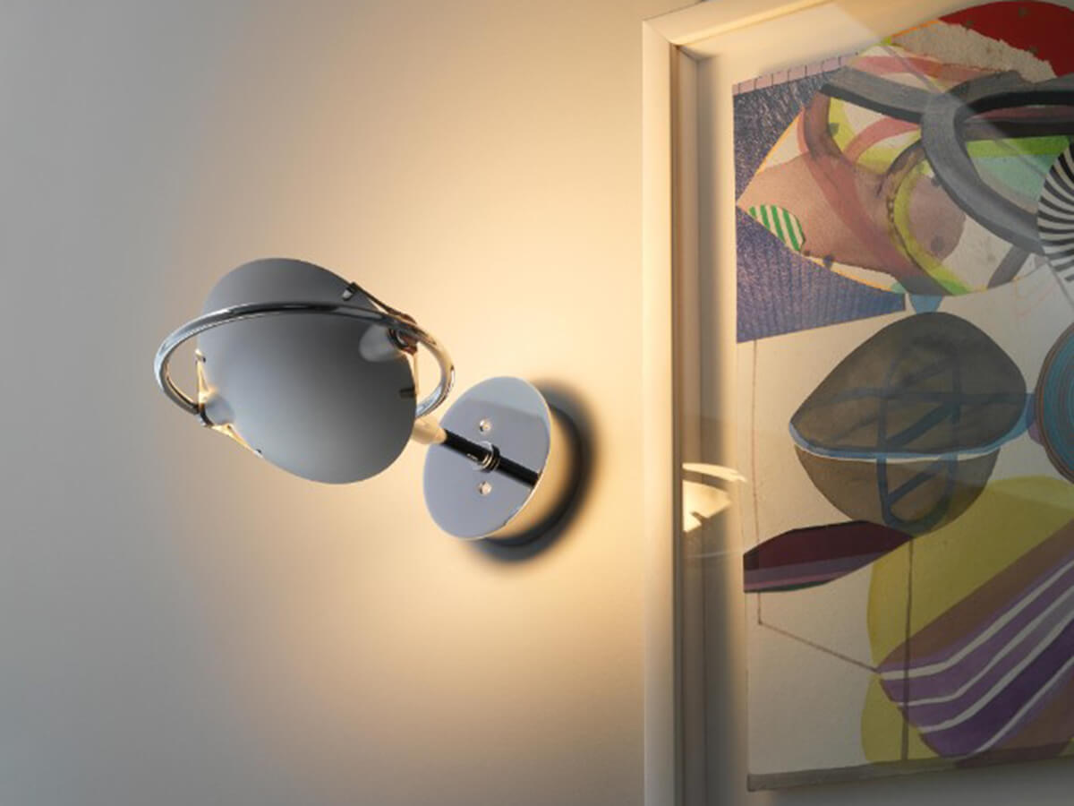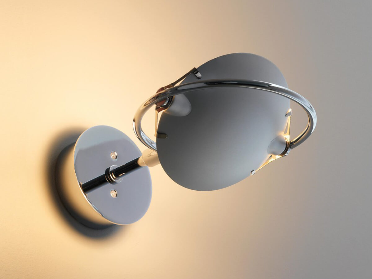 The Nobi wall lamp by Fontana Arte, discreet and elegant, has been one of the most iconic and recognizable wall lamps on the market for many years. Conceived by the Metis Lighting studio in 1992, it is characterized by the rounded and protruding shape of the diffuser, balanced and enigmatic, almost a small eye protruding from the wall. The metal structure that supports it is in nickel-plated satin metal, while the diffuser itself is the result of a minute engineering work: it is in fact made up of two concave glasses placed side by side and held in position by a system of small clamps and is fixed to the structure by two pins that allow a wide rotation, thus allowing you to direct the light at will. Technical features: version in chrome and satin nickel equipped with LEDs