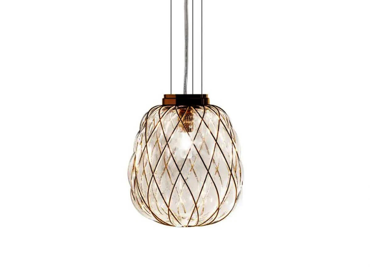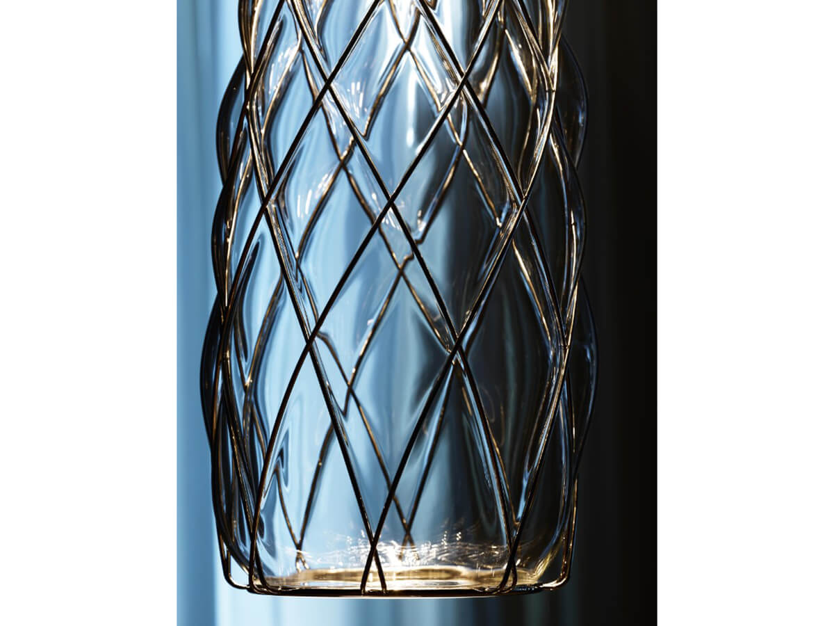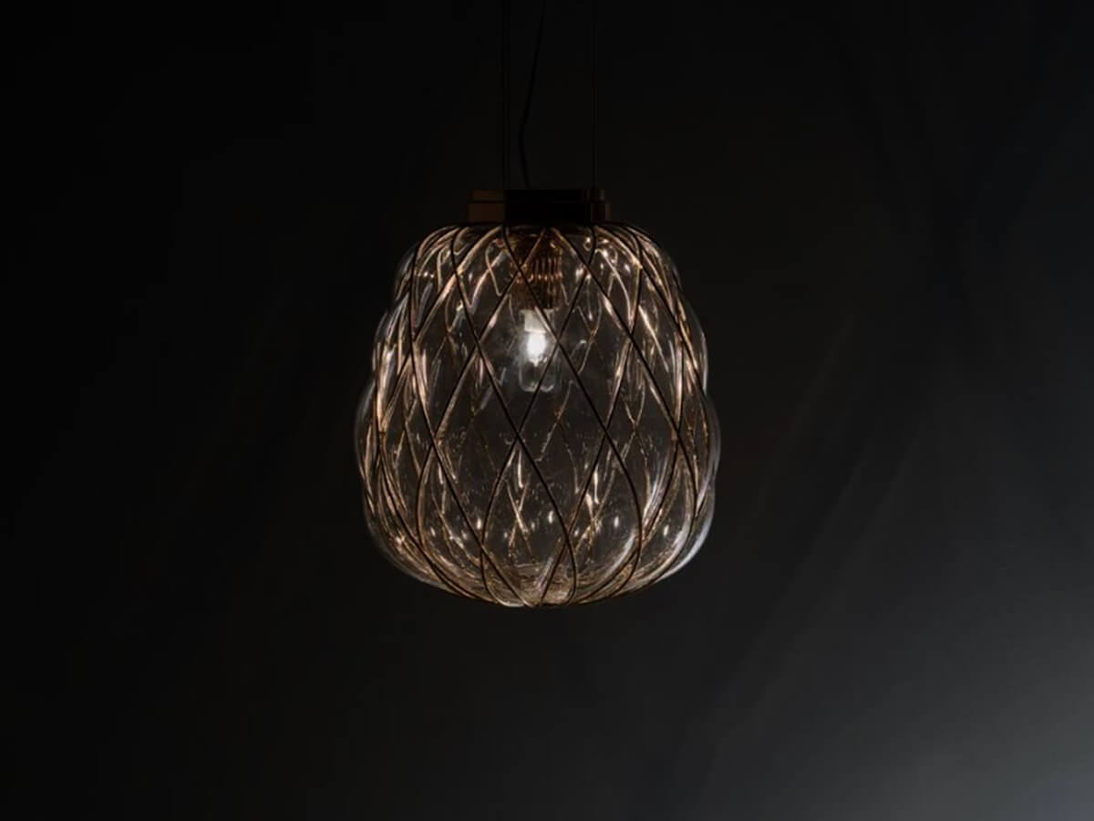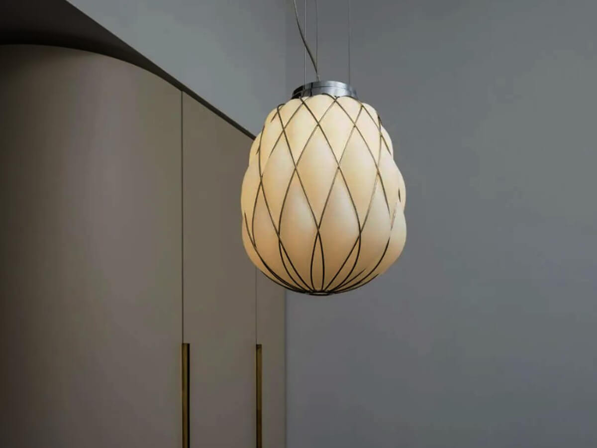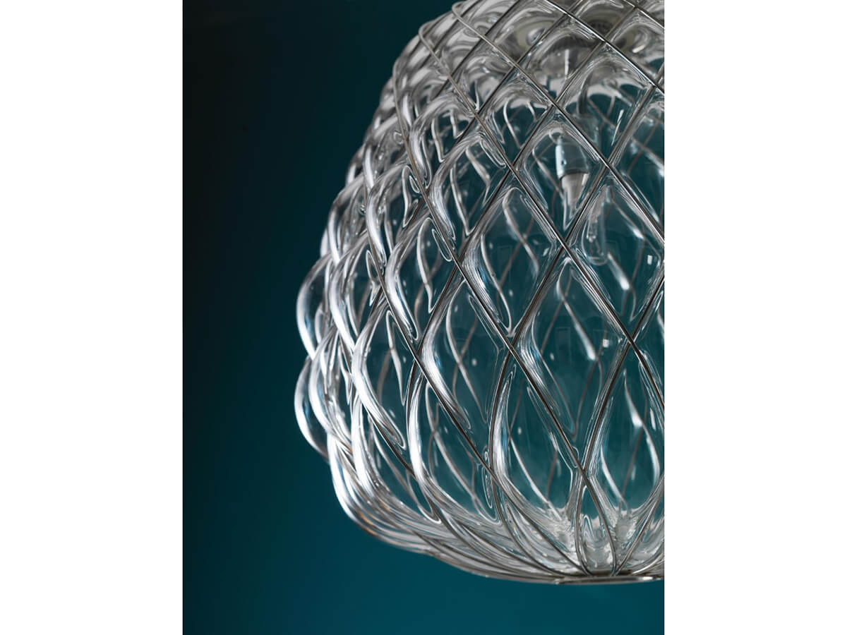 The Pinecone suspension lamp by Fontana Arte, luxurious and precious, has the signature of the designer Paola Navone and bases its refined charm on the traditional technique of caged blown glass. Its entirely artisanal creation requires the master glassmaker to blow the classic glass bubble with his mouth inside a metal cage, in whose intersections it ends up overflowing slightly in a harmonious way. The artifact thus created seems in constant tension, with the glass that seems to press to come out of the confinement in which it is enclosed. The effect has different shades depending on the finish: the transparent glass divides the light according to the design of the small rhombuses that make up the frame of the lamp, with a kaleidoscopic play of light with a strong scenographic impact, while the white glass gives life to a more compact lamp in which the light is diffused in a more balanced way.