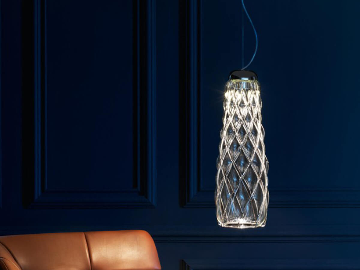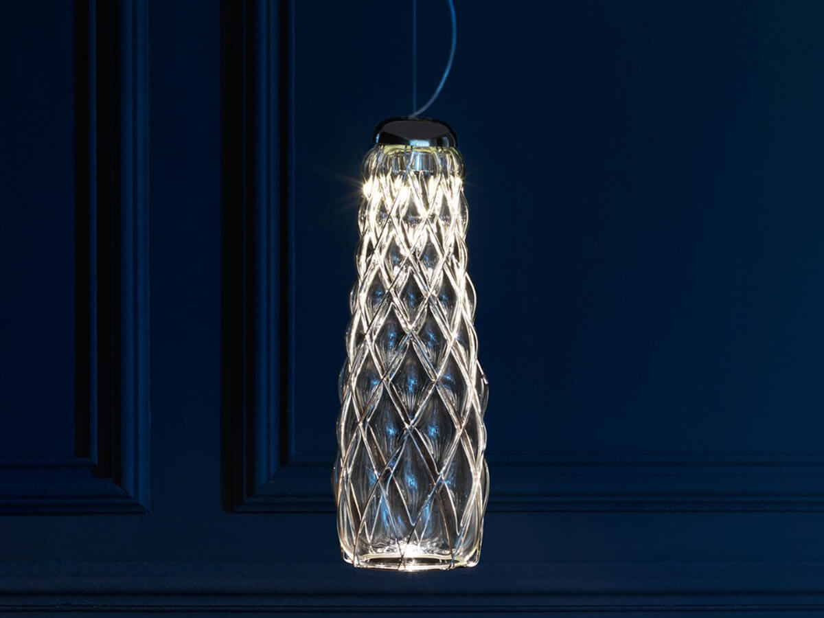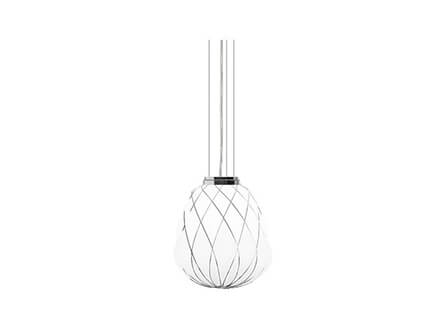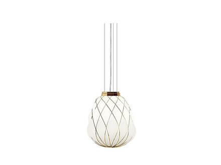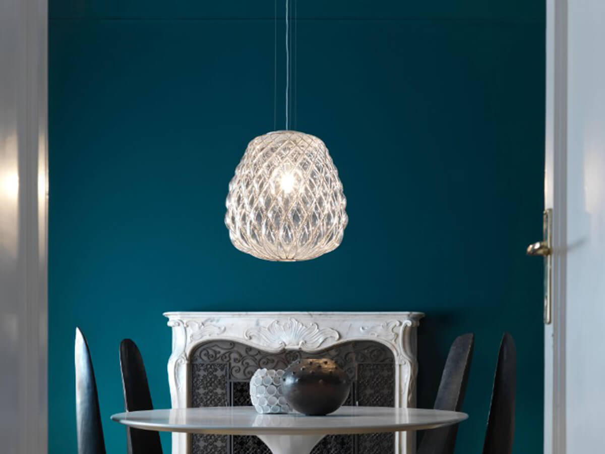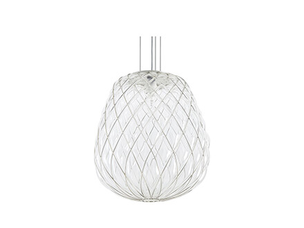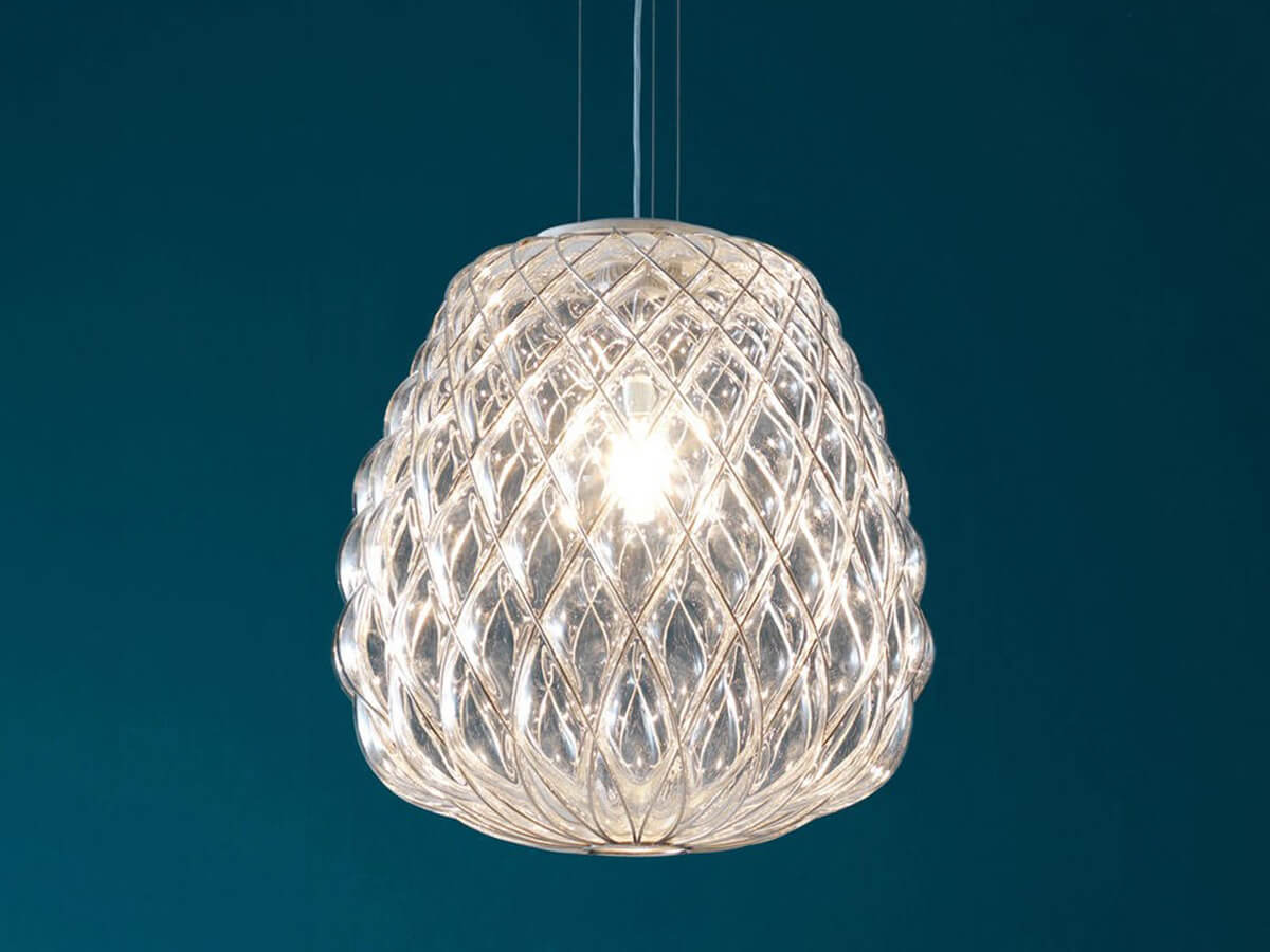 The Pinecone suspension lamp by Fontana Arte, luxurious and precious, has the signature of the designer Paola Navone and bases its refined charm on the traditional technique of caged blown glass. Its entirely artisanal creation requires the master glassmaker to blow the classic glass bubble with his mouth inside a metal cage, in whose intersections it ends up overflowing slightly in a harmonious way. The artifact thus created seems in constant tension, with the glass that seems to press to come out of the confinement in which it is enclosed. The effect has different shades depending on the finish: the transparent glass divides the light according to the design of the small rhombuses that make up the frame of the lamp, with a kaleidoscopic play of light with a strong scenographic impact, while the white glass gives life to a more compact lamp in which the light is diffused in a more balanced way.