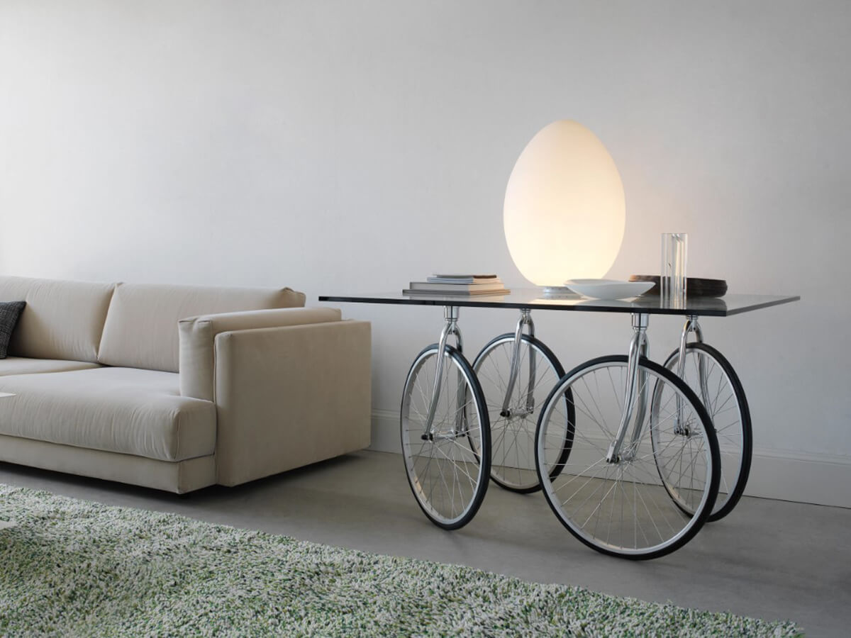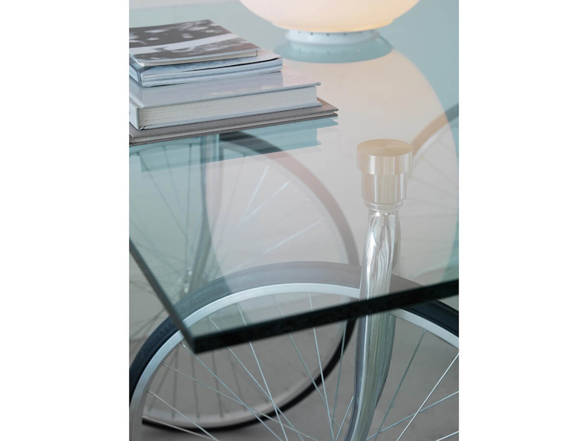 Playful and unsettling, the Tour table is one of the great masterpieces created by Gae Aulenti for Fontana Arte in the period in which she was the company's art director. Its design dates back to 1993 and is inspired by another great success conceived by Gae Aulenti for the Milanese brand, the iconic "Tavolo con Ruote", in which a glass top is supported by four small industrial wheels. With Tour, Gae Aulenti takes the Dadaist alienation effect at the base of the prototype to the extreme, replacing the wheels with four real full-size bicycle wheels. These support the ground float glass top and give life to a bizarre and alienating object, but perfectly functional, usable both in the home and in offices or waiting rooms.