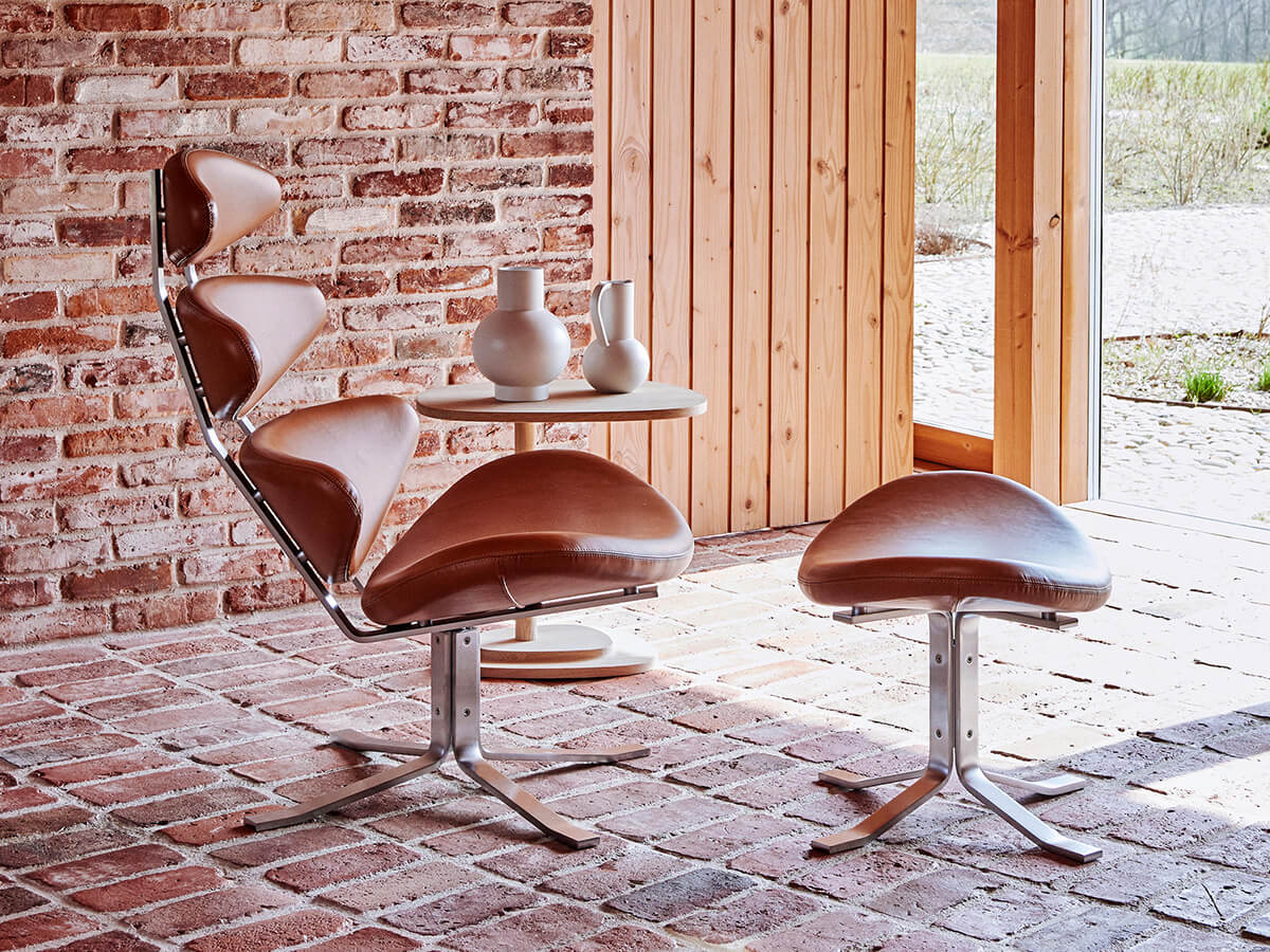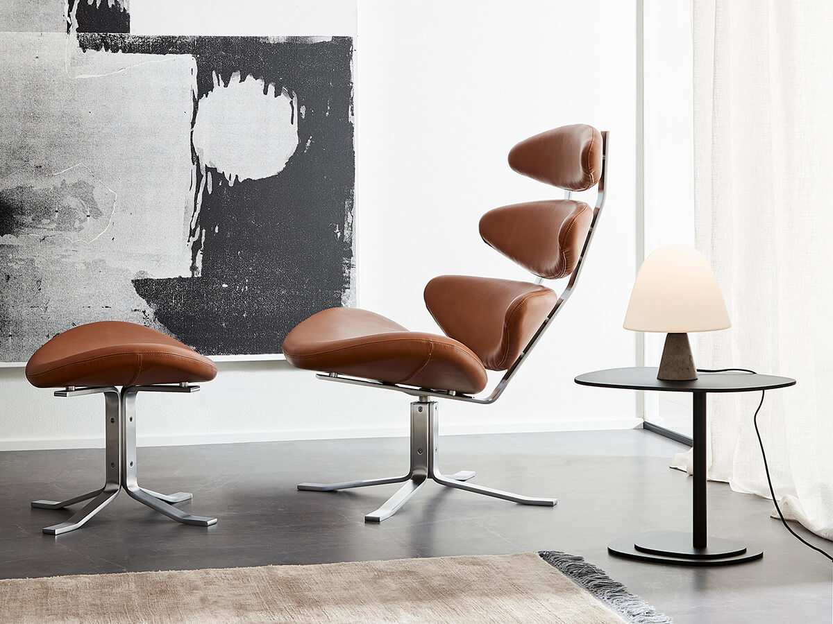 The Corona armchair was for many years the most iconic product of the historic Danish brand Erik Jørgensen, then absorbed in 2020 by Fredericia. Its current form dates back to 1964 but is the result of a long research by its designer Poul M. Volther, who after the Second World War had set himself the goal of creating an armchair that minimized the use of fabric. then very difficult to find. Thus was born the peculiar structure of Corona, in which the seat and back are made up of four elliptical elements of sloping dimensions that are firmly fixed to a metal base and structure. Corona is a truly unique armchair, capable of being particularly fascinating even with leather upholstery, and over the years it has appeared as a scenographic element in countless films and TV series.