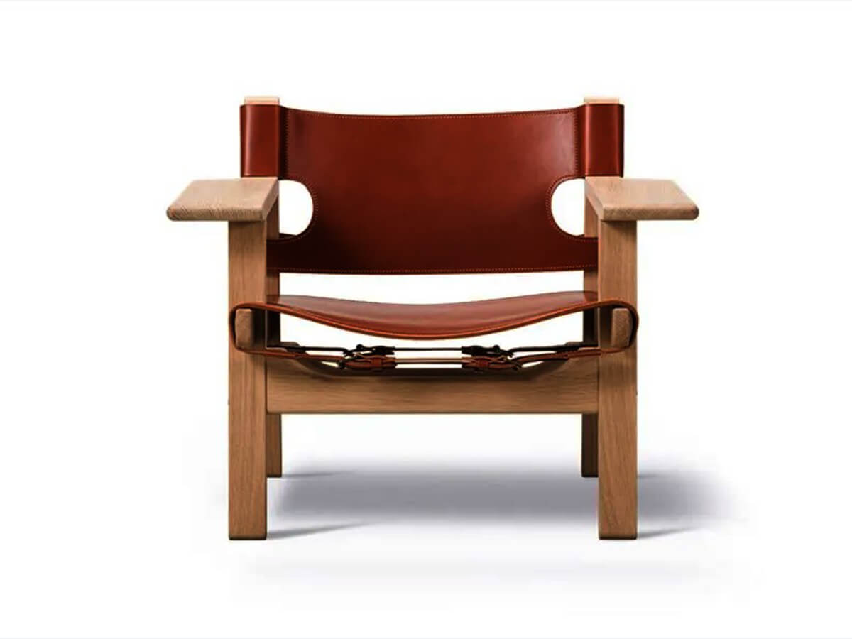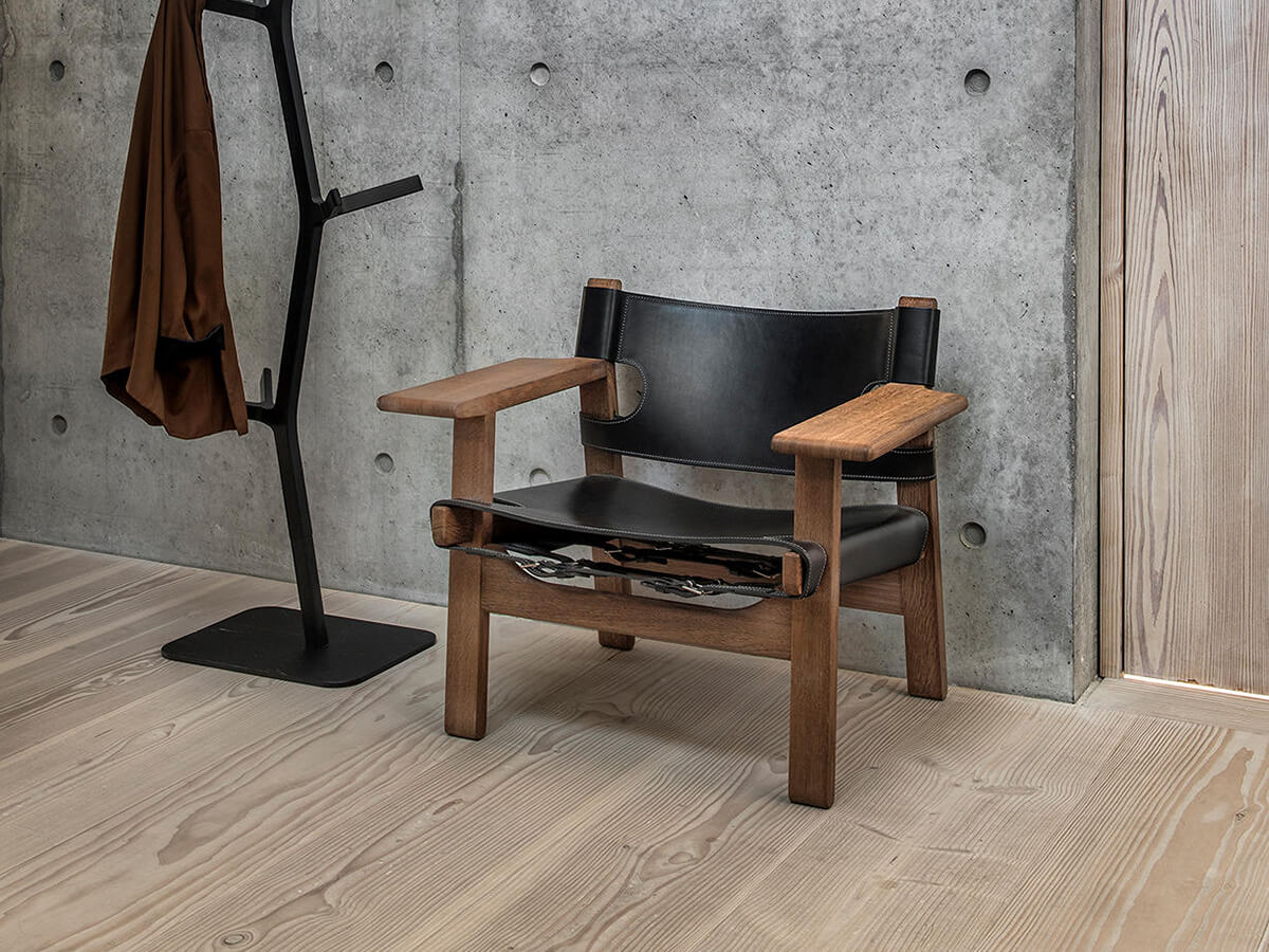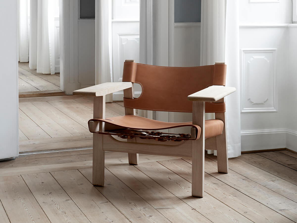 The Spanish Chair by Fredericia is probably the most famous creation of one of the great masters of Danish design, Børge Mogensen, known above all for his ability to adapt ideas drawn from the traditional furnishings of distant cultures to the Scandinavian design concept. For his Spanish Chair of 1958, Mogensen found inspiration in Medieval Spain, where armchairs were in use in which the seat and back were made up of two long and taut strips of leather. A choice that can also be found in the Spanish Chair, enriched however by constructive details of high saddlery and by a low wooden seat that gives it an unmistakably Nordic taste.