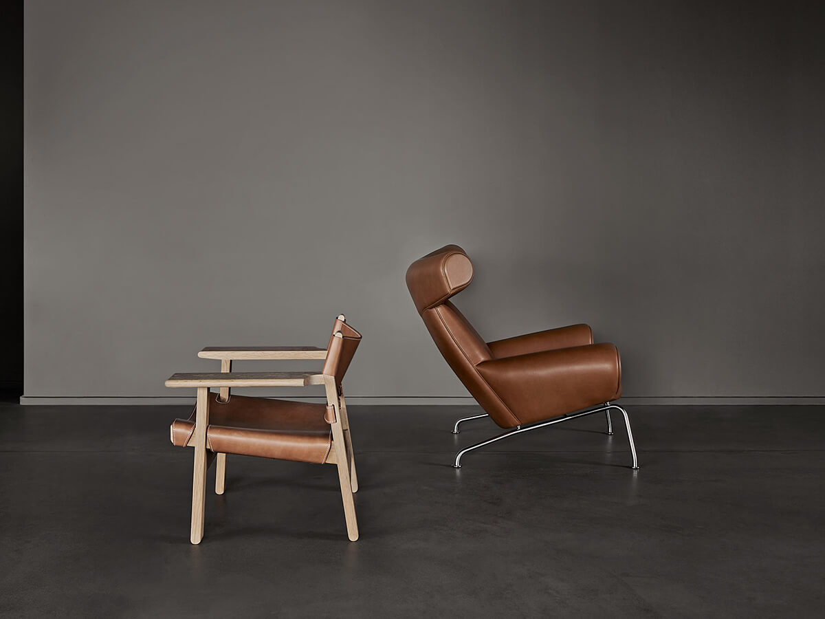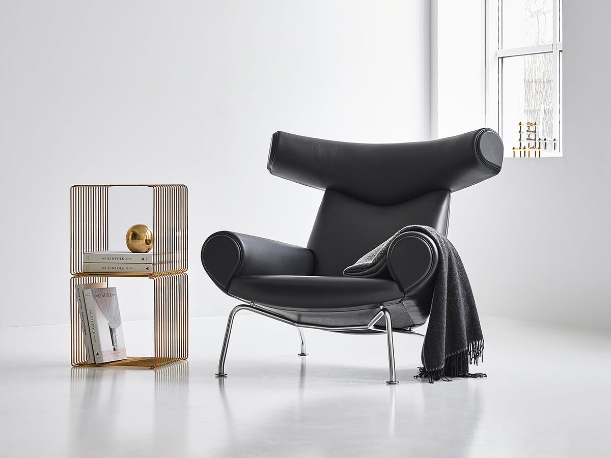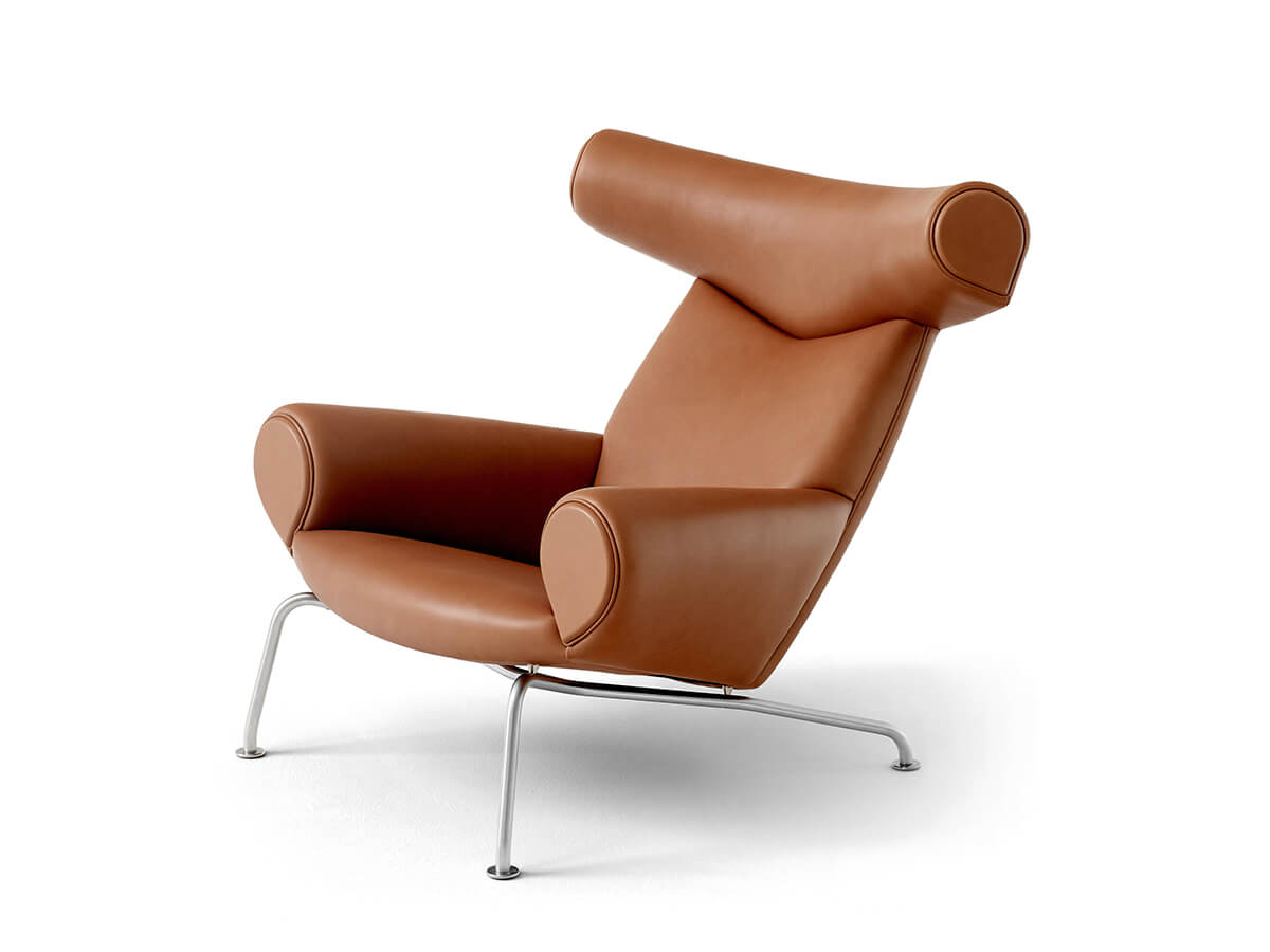 The OX Chair by Hans J. Wegner, historically produced by Erik Jørgensen and now part of the Fredericia catalog, is one of the most sculptural and impressive creations ever conceived by the great Danish master. Its characteristic element is the large headrest, whose shapes are inspired by those of the horns of an ox. Originally designed in 1960, OX Chair is an armchair with a large and very comfortable seat, conceived primarily for relaxation, and has more luxurious and distinct features than the classic productions of Nordic design. The padding and upholstery operations (in leather or fabric) are carried out entirely by hand and require considerable expertise and a certain physical strength, so much so that they require a whole day for each piece.