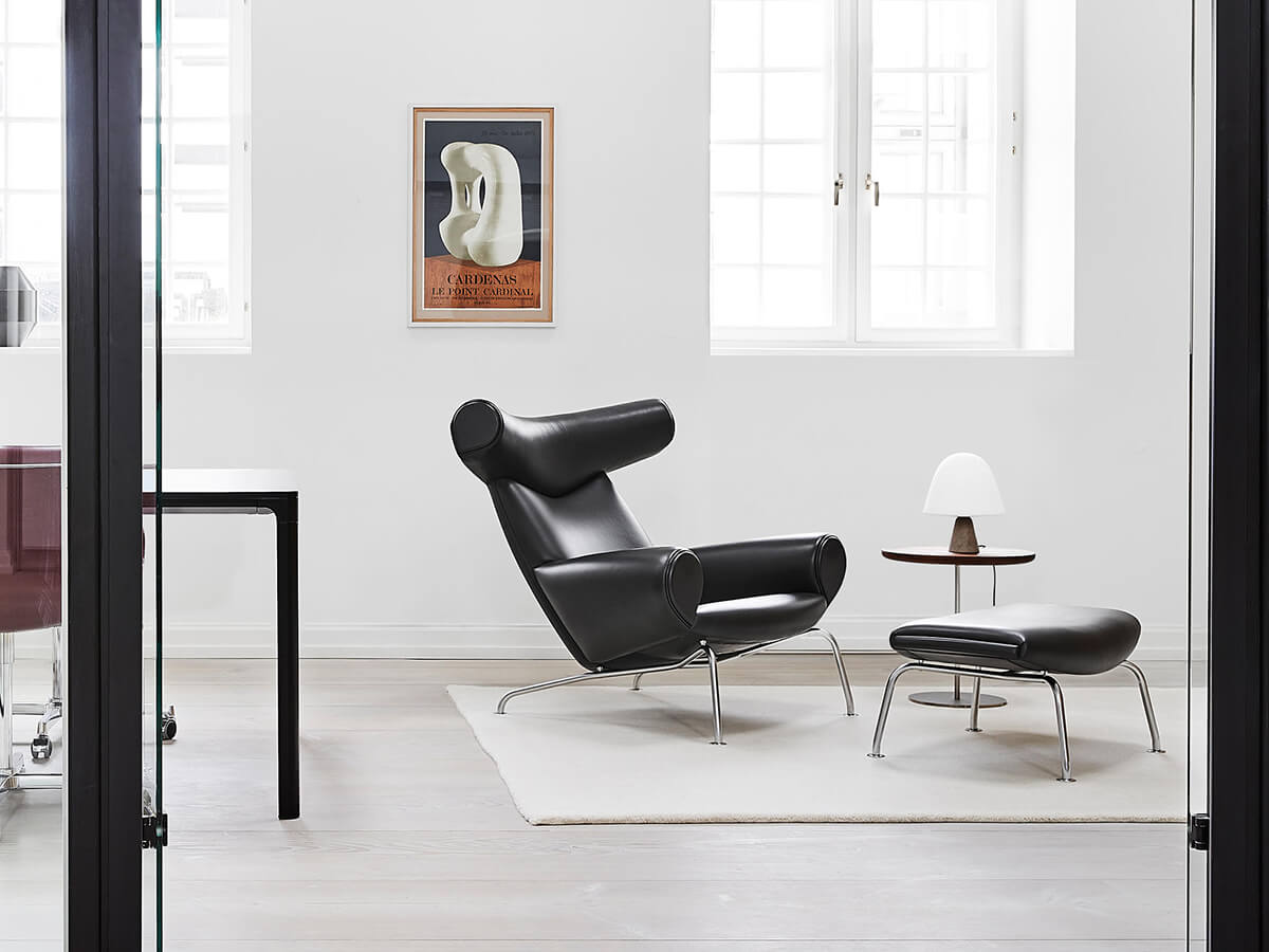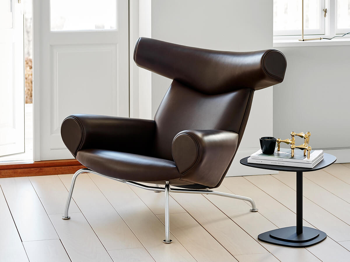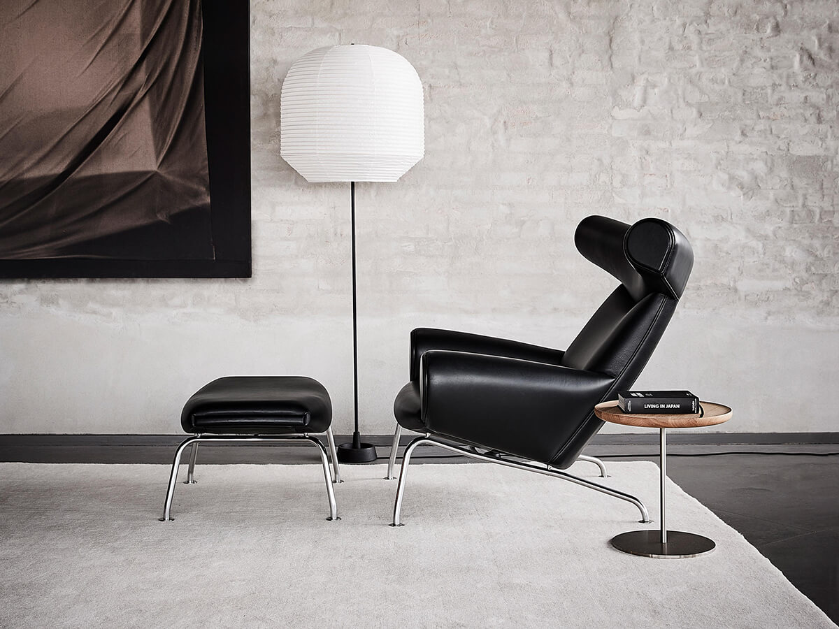 The OX Chair by Hans J. Wegner, historically produced by Erik Jørgensen and now part of the Fredericia catalog, is one of the most sculptural and impressive creations ever conceived by the great Danish master. Its characteristic element is the large headrest, whose shapes are inspired by those of the horns of an ox. Originally designed in 1960, OX Chair is an armchair with a large and very comfortable seat, conceived primarily for relaxation, and has more luxurious and distinct features than the classic productions of Nordic design. The padding and upholstery operations (in leather or fabric) are carried out entirely by hand and require considerable expertise and a certain physical strength, so much so that they require a whole day for each piece.