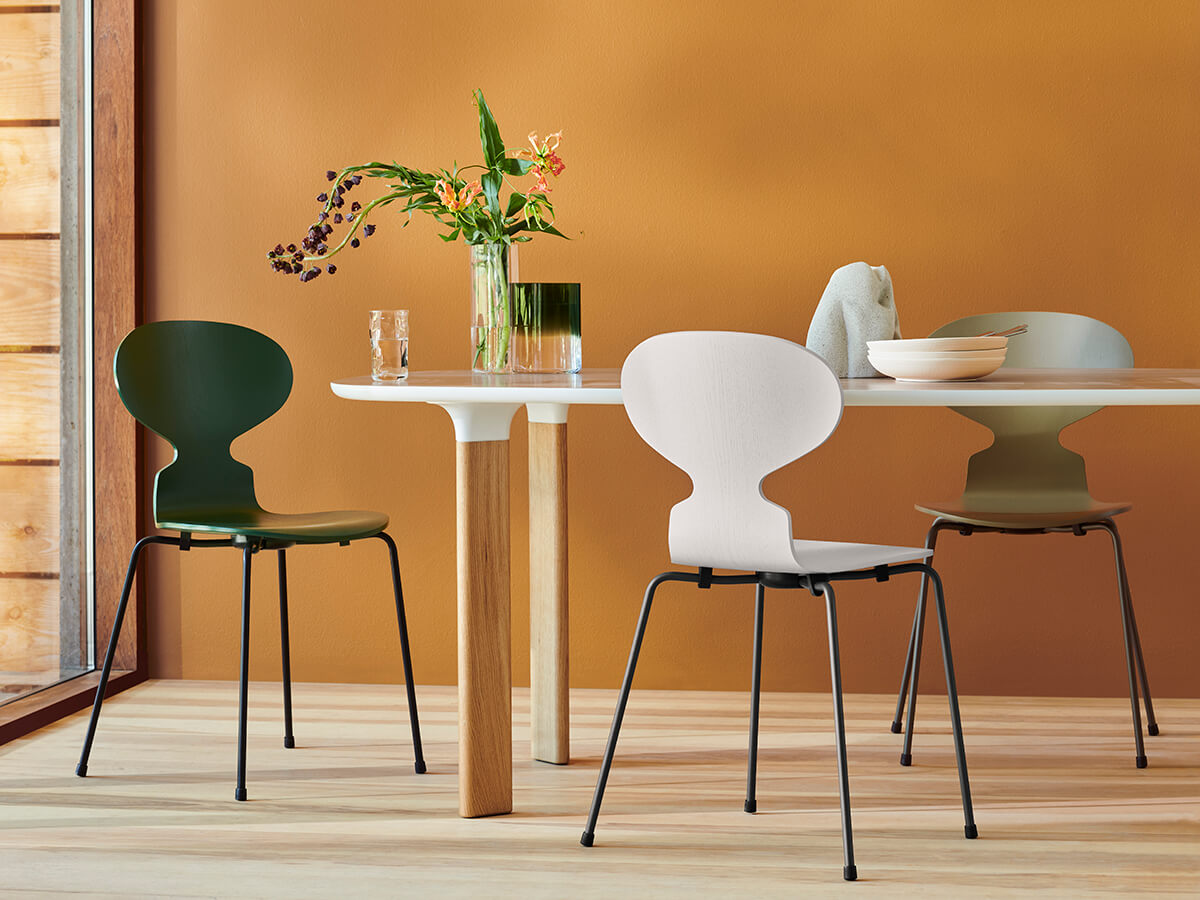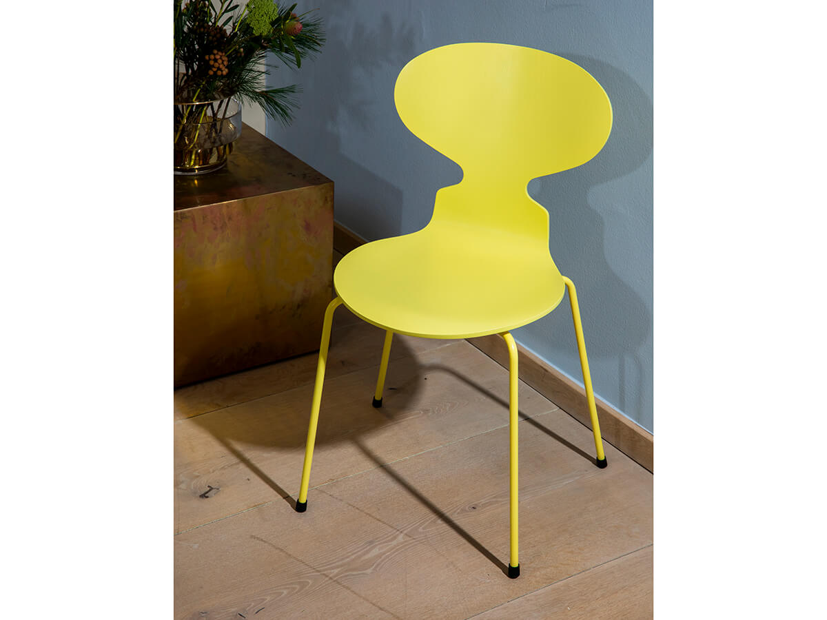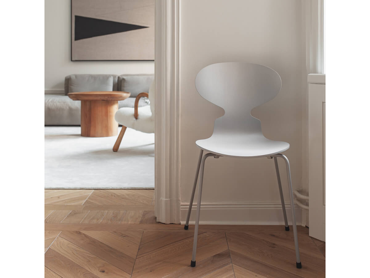 The Ant Chair by Arne Jacobsen, produced by Fritz Hansen, is a real piece of design history: it is in fact the first chair in history in which the seat and back are made from a single sheet of curved plywood. Made in 1952 for the company canteen of the Novo pharmaceutical industry, the Ant chair owes its typical, particularly narrow shape of the backrest to the resistance problems that plagued the material at the time and with which all the other designs that had attempted a similar undertaking, including the Eameses. In addition to being perfectly functional, the shape chosen by Jacobsen - which was very reminiscent of an ant's head, hence the name of Ant - also proved to be iconic and recognizable, contributing decisively to the lasting success of the product. Originally designed with only three legs, it is now also produced in a more ordinary four-legged version. The back is in natural wood or lacquered in different colors.