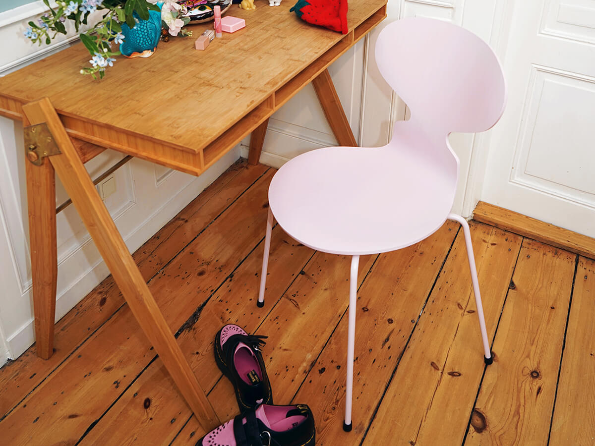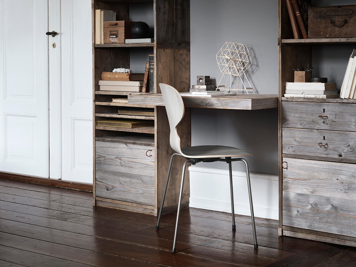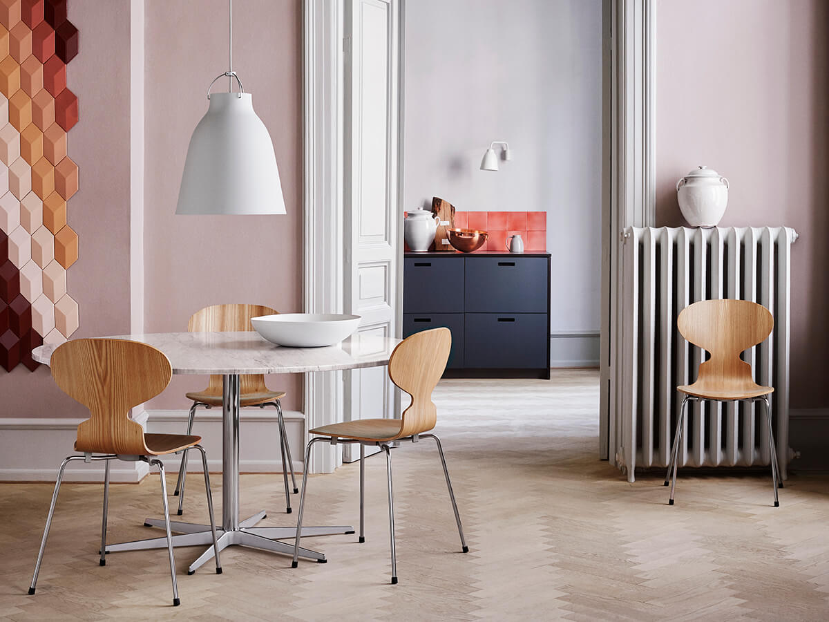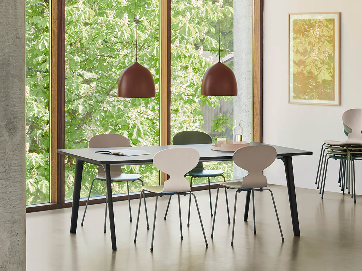 The Ant Chair by Arne Jacobsen, produced by Fritz Hansen, is a real piece of design history: it is in fact the first chair in history in which the seat and back are made from a single sheet of curved plywood. Made in 1952 for the company canteen of the Novo pharmaceutical industry, the Ant chair owes its typical, particularly narrow shape of the backrest to the resistance problems that plagued the material at the time and with which all the other designs that had attempted a similar undertaking, including the Eameses. In addition to being perfectly functional, the shape chosen by Jacobsen - which was very reminiscent of an ant's head, hence the name of Ant - also proved to be iconic and recognizable, contributing decisively to the lasting success of the product. Originally designed with only three legs, it is now also produced in a more ordinary four-legged version. The back is in natural wood or lacquered in different colors.
