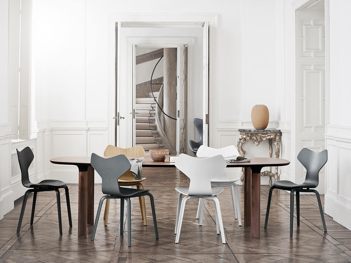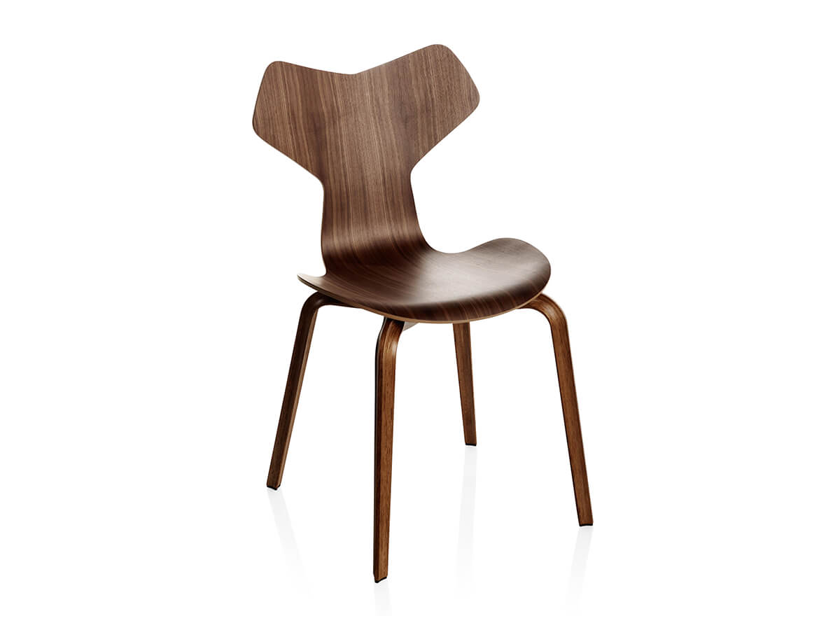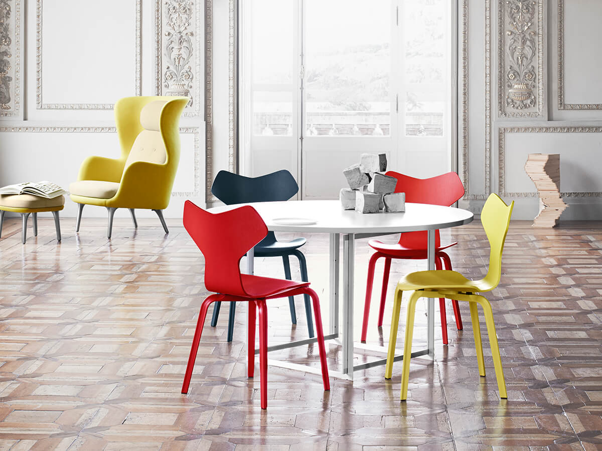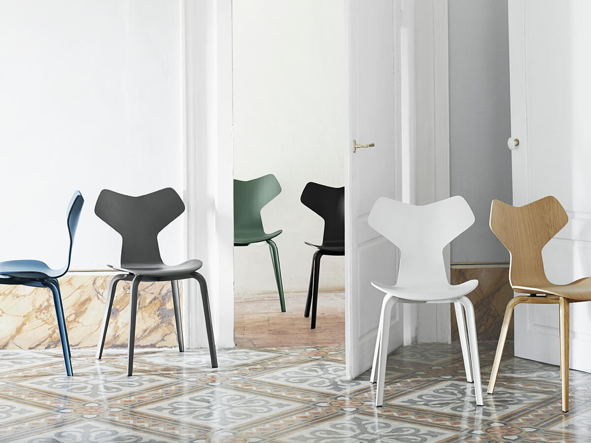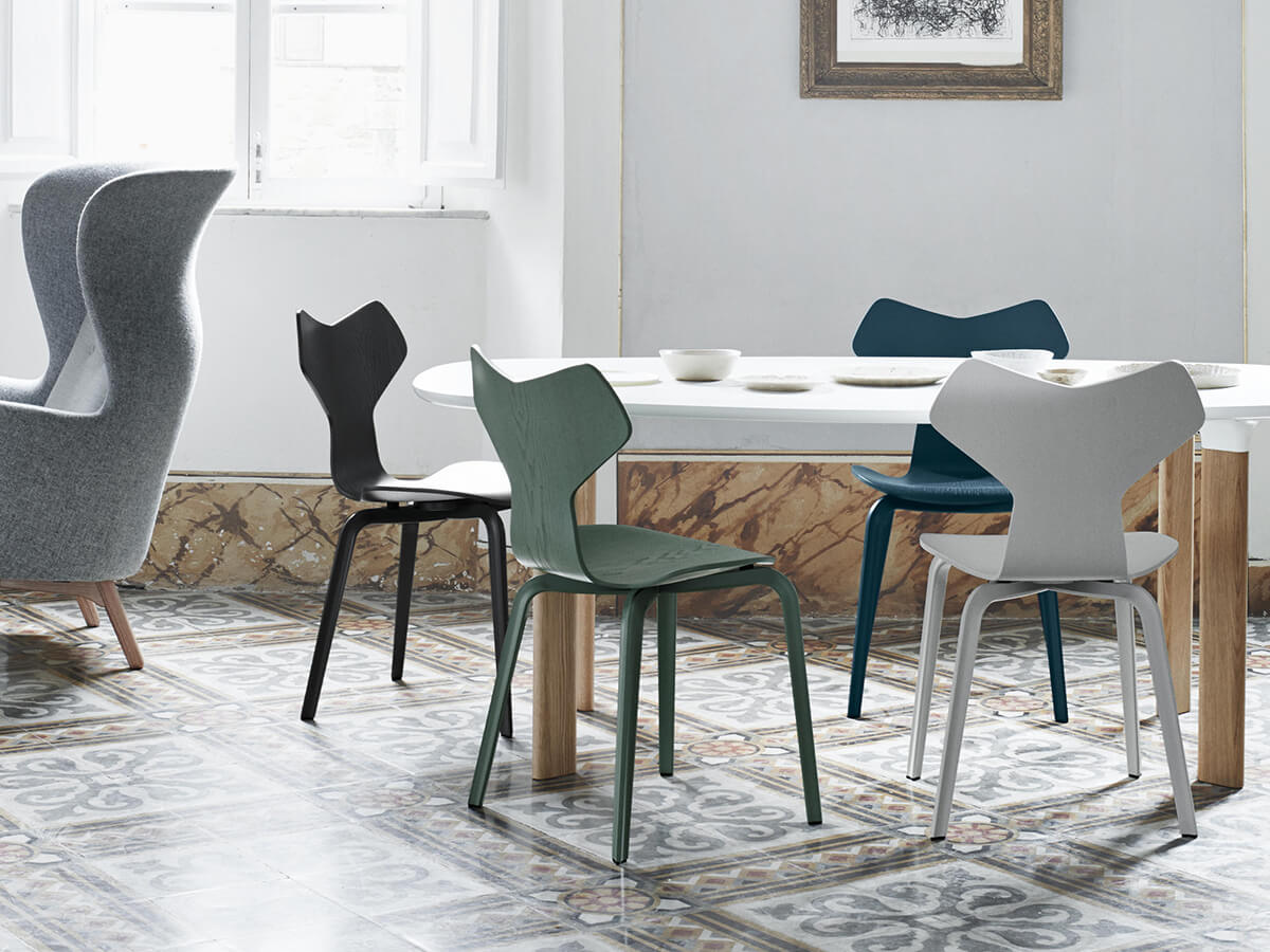 The Grand Prix chair by Arne Jacobsen, produced by Fritz Hansen, owes its name to the victory of the main prize at the XI Milan Triennale in 1957. The seat, comfortable and practical, is characterized by a backrest that has narrower shapes in its part central and then open upwards into two large ears that act as support for the shoulders. The four legs, originally only in wood - unique in Jacobsen's production - are now also available in a metallic finish. Historic product of great success, the Grand Prix chair can be proposed in a great variety of interpretations: entirely in wood, with a warmer and more articulate feeling, with the seat covered in fabric, which makes it perhaps more suitable for common spaces and uses. contract, or even with a leather seat that enhances its elegance.