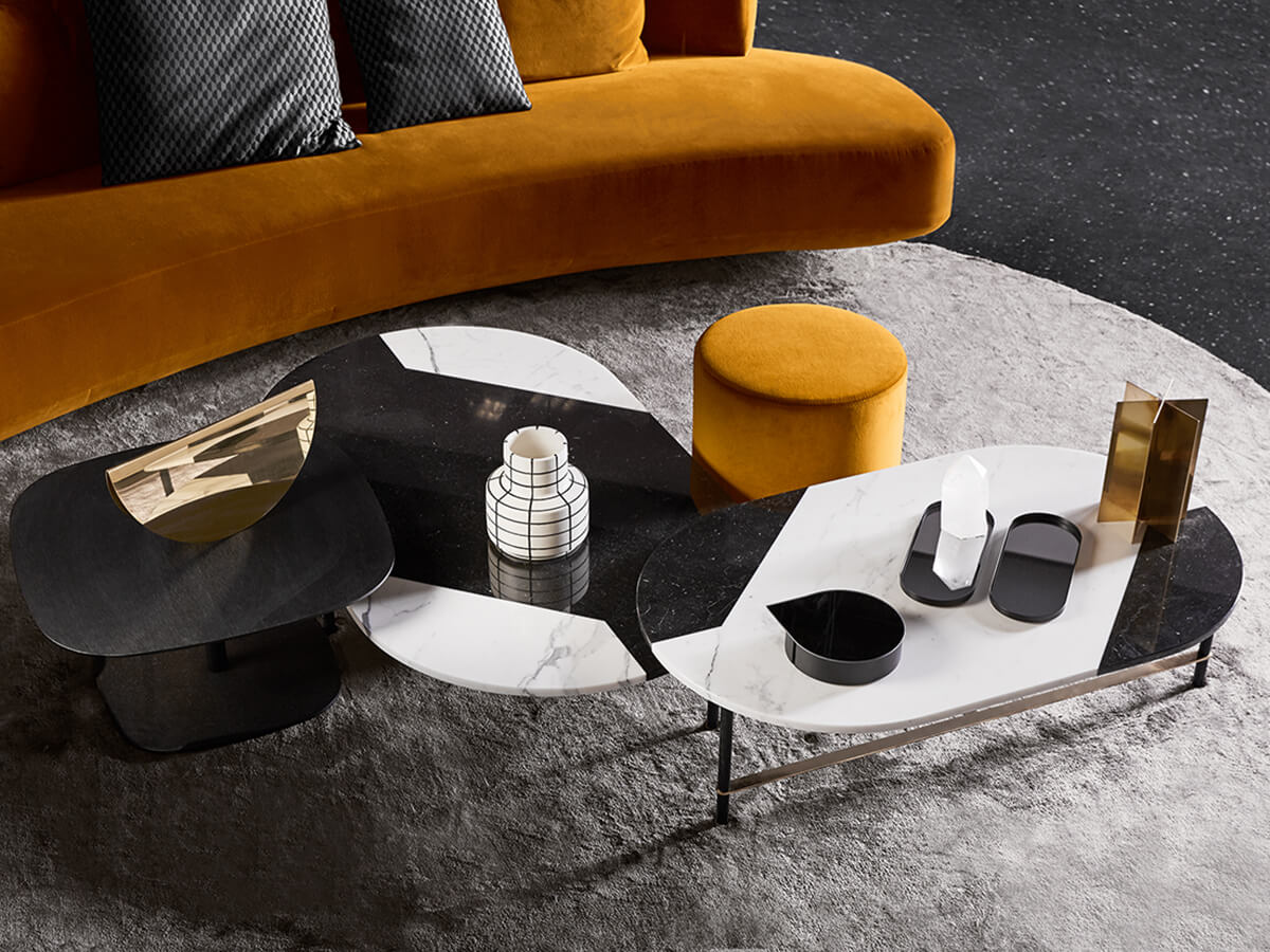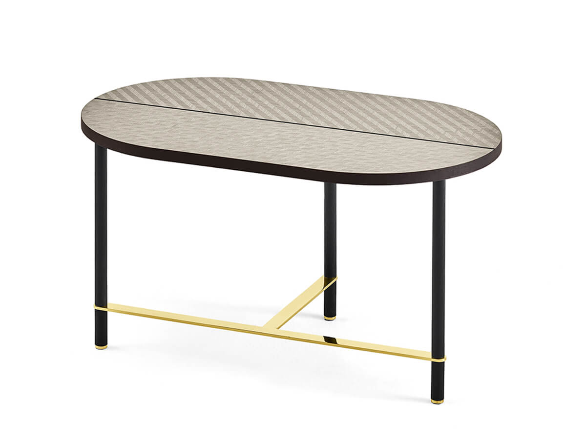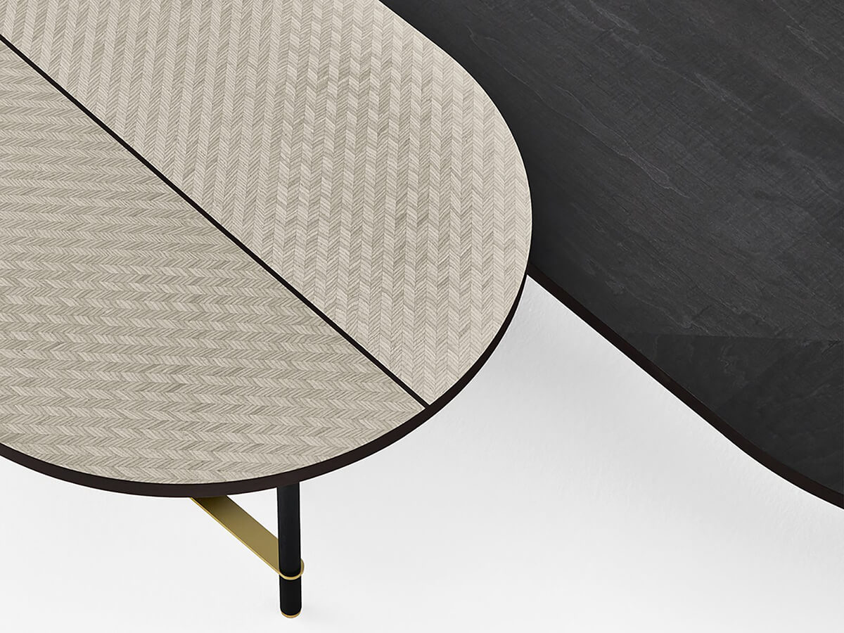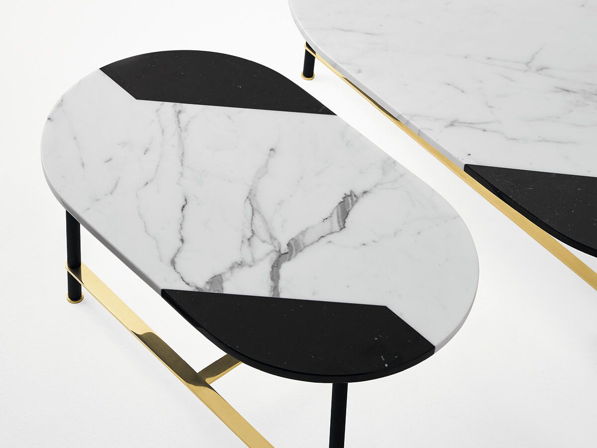 The Cookies coffee table by Gallotti & Radice best embodies the theatrical and refined poetics of its author, the designer Pietro Russo. Its focal point lies in the decoration of the top, which can be characterized by the strong black and white contrasts of the inlaid Statuario and Marquinia marble or in suggestive herringbone wood infill with Tweed motif (in dark gray frisé maple), or even in a composition of rare essences such as white Taba frisé wood and black Tanganika. In the classic version the top, also oval in shape, is then supported by three thin metal supports, while in the Cookies Circle version the table takes on a round shape.* Technical features: structure in black anodized aluminum and polished brass