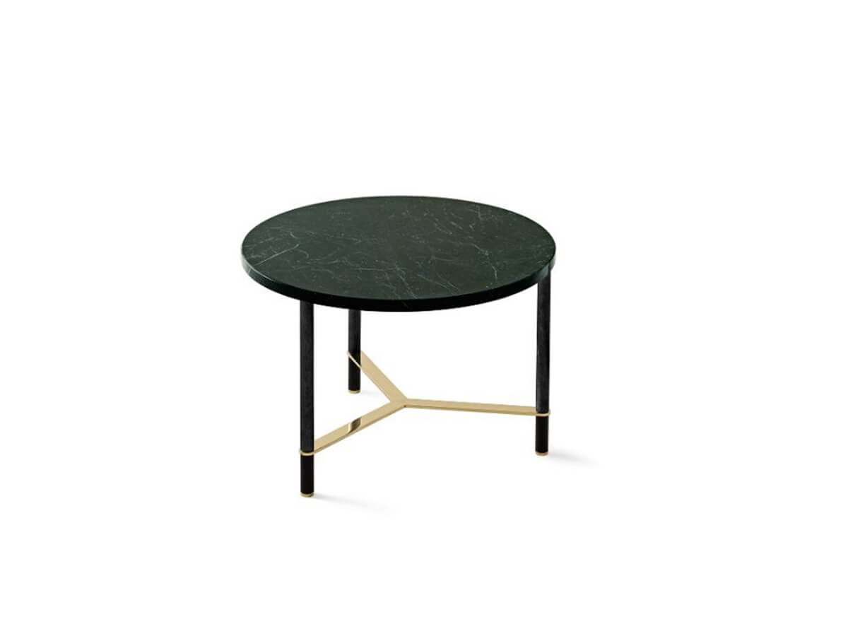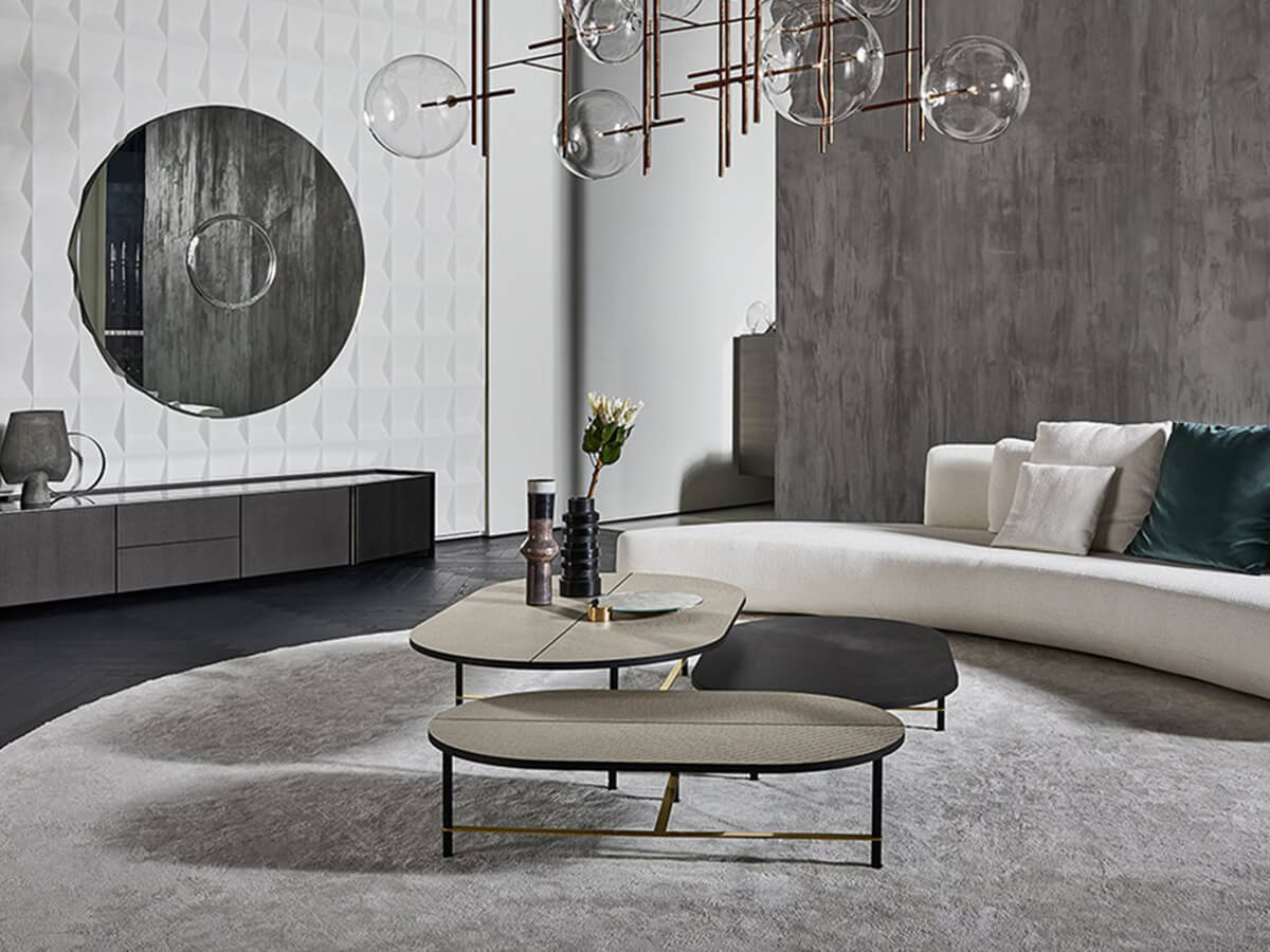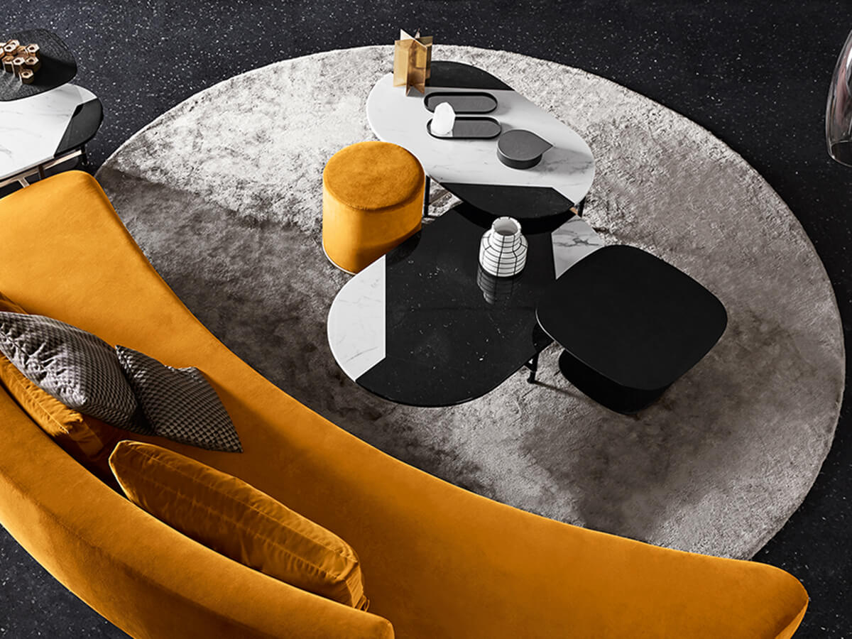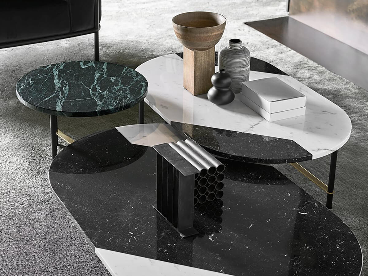 The Cookies coffee table by Gallotti & Radice best embodies the theatrical and refined poetics of its author, the designer Pietro Russo. Its focal point lies in the decoration of the top, which can be characterized by the strong black and white contrasts of the inlaid Statuario and Marquinia marble or in suggestive herringbone wood infill with Tweed motif (in dark gray frisé maple), or even in a composition of rare essences such as white Taba frisé wood and black Tanganika. In the classic version the top, also oval in shape, is then supported by three thin metal supports, while in the Cookies Circle version the table takes on a round shape.* Technical features: structure in black anodized aluminum and polished brass