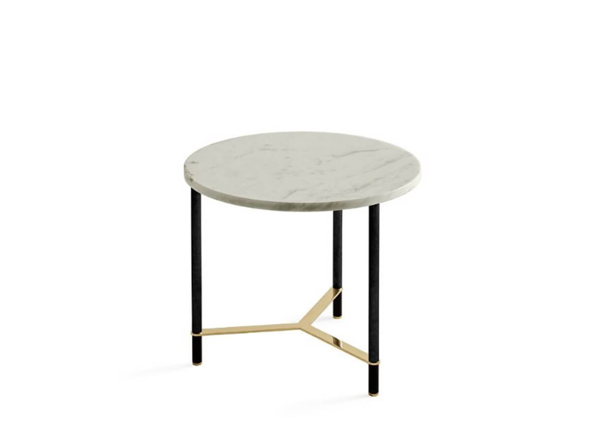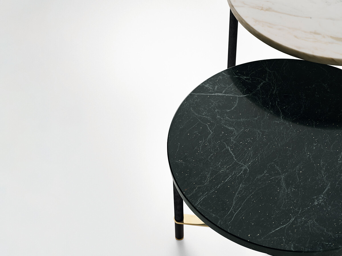 The Cookies coffee table by Gallotti & Radice best embodies the theatrical and refined poetics of its author, the designer Pietro Russo. Its focal point lies in the decoration of the top, which can be characterized by the strong black and white contrasts of the inlaid Statuario and Marquinia marble or in suggestive herringbone wood infill with Tweed motif (in dark gray frisé maple), or even in a composition of rare essences such as white Taba frisé wood and black Tanganika. In the classic version the top, also oval in shape, is then supported by three thin metal supports, while in the Cookies Circle version the table takes on a round shape.* Technical features: structure in black anodized aluminum and polished brass