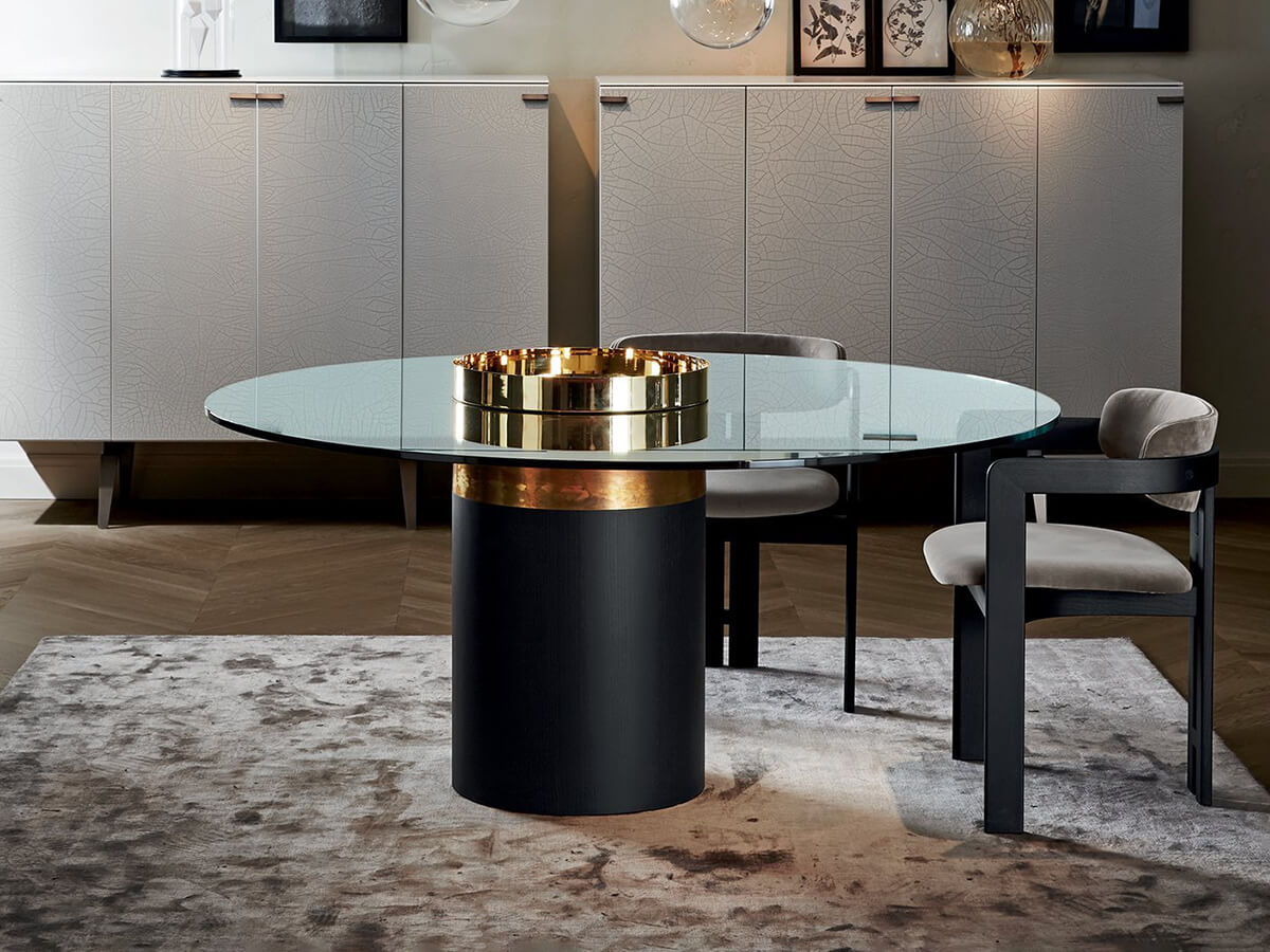 Haumea-T, designed by Massimo Castagna for Gallotti & Radice, is a round table with a strong spectacular impact. It is supported by a single voluminous wooden pillar (open pore black lacquered or in a rust finish), slightly off-center from the top in order to create an effect of unexpected dynamism. The terminal part of the base is made up of a spectacular brass ring, which creates a striking contrast with the transparencies of the 15 mm tempered glass top. Above the top there is a removable brass tray, an ideal extension of the base that adds a decorative touch of value to the table.* Technical features: transparent glass top; metal parts in polished, burnished, coppered or black chromed brass available in fixed combinations.