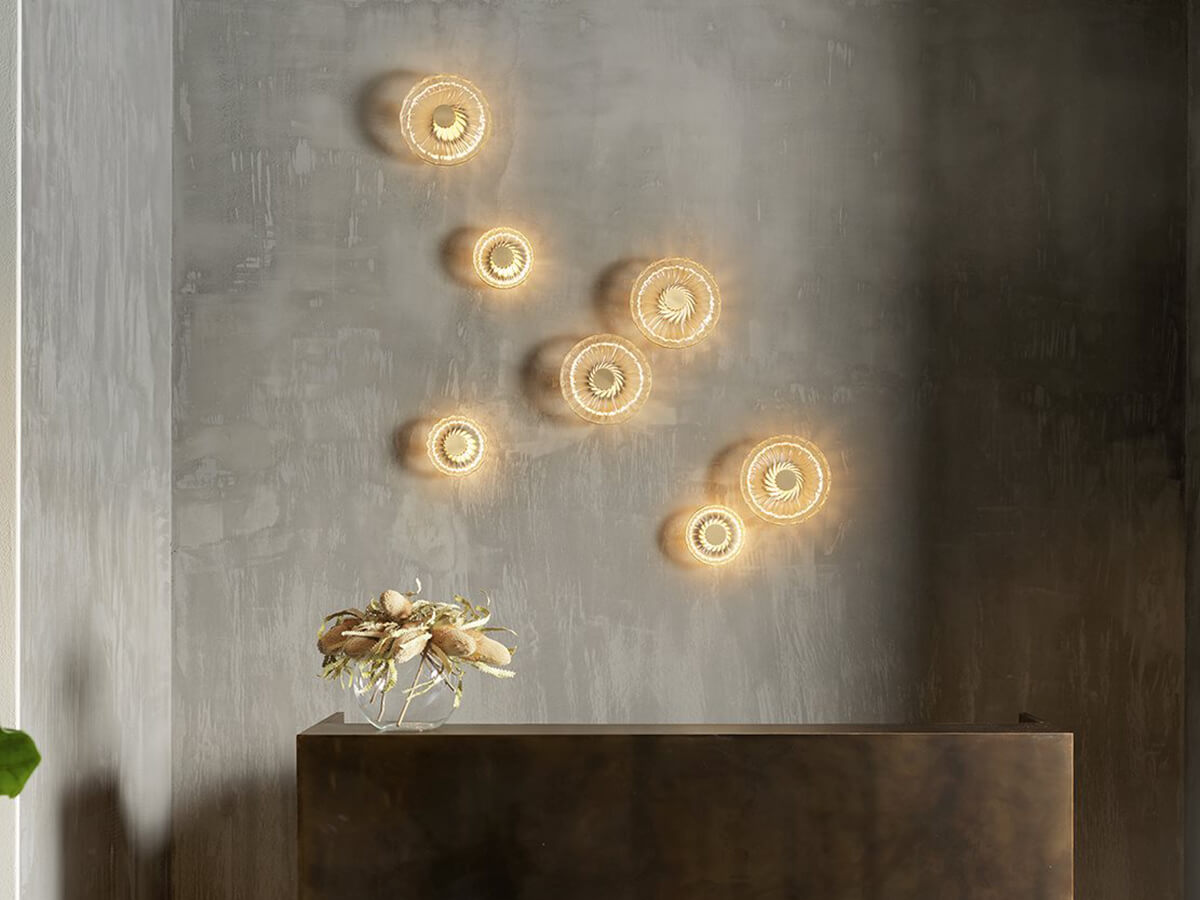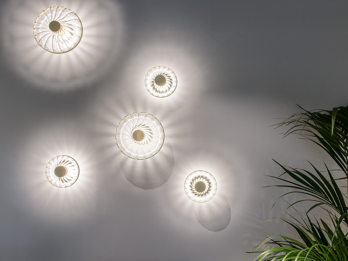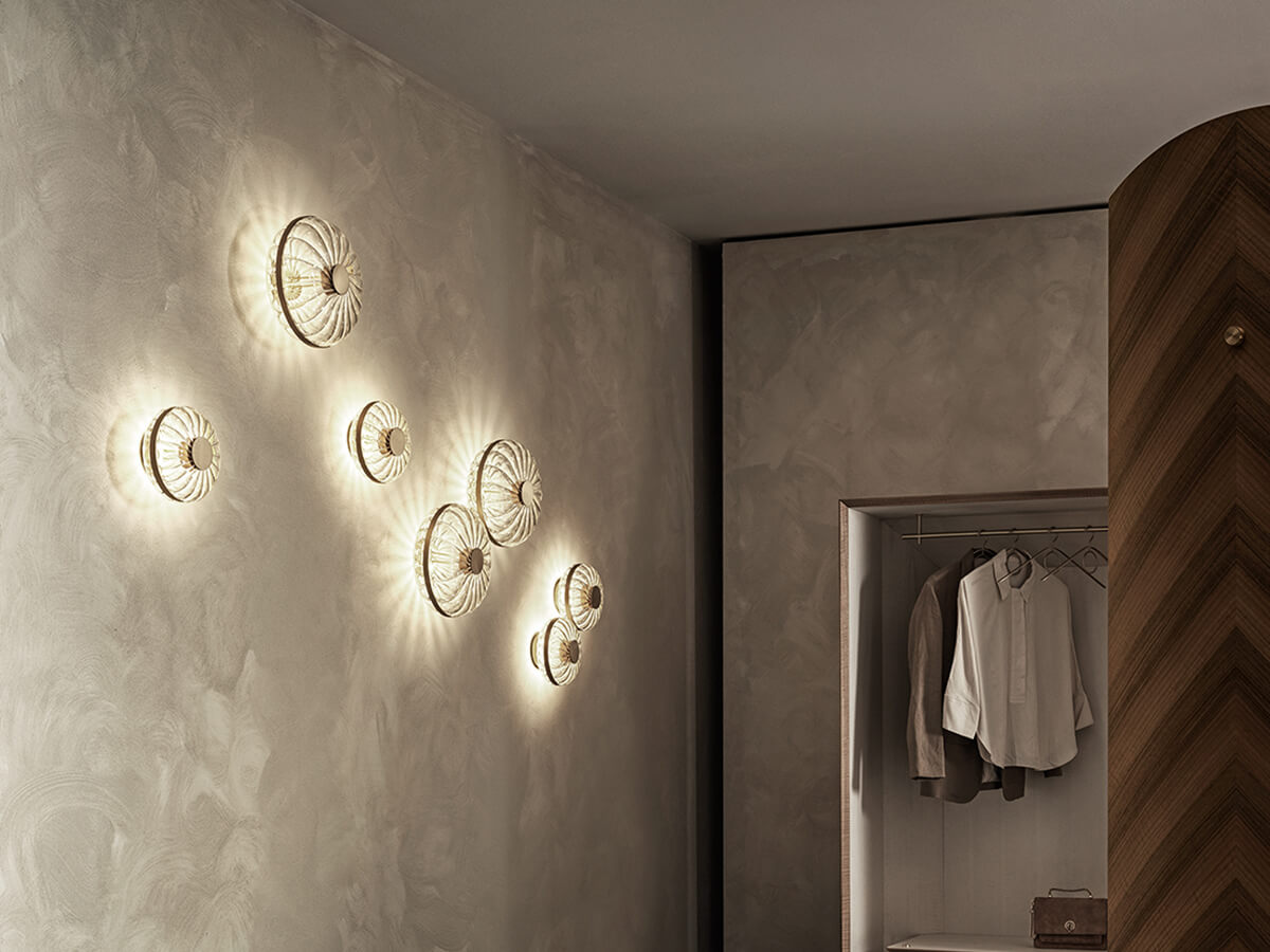 Graceful and finely decorative, the Jolie applique lamp by Gallotti & Radice bears the signature of one of the most important emerging figures in Italian design, the young Federica Biasi. The feminine touch is immediately noticeable in its precious but delicate forms, subtly retro, which make it similar to a luminous "wall flower". It is made of mouth-blown and richly worked transparent crystal and has a central disc in satin brass that radiates the environment with its reflections of warm tones. The lighting source of the Jolie Applique lamp is led.* Technical features: applique in blown crystal and metal details in satin brass; Led light