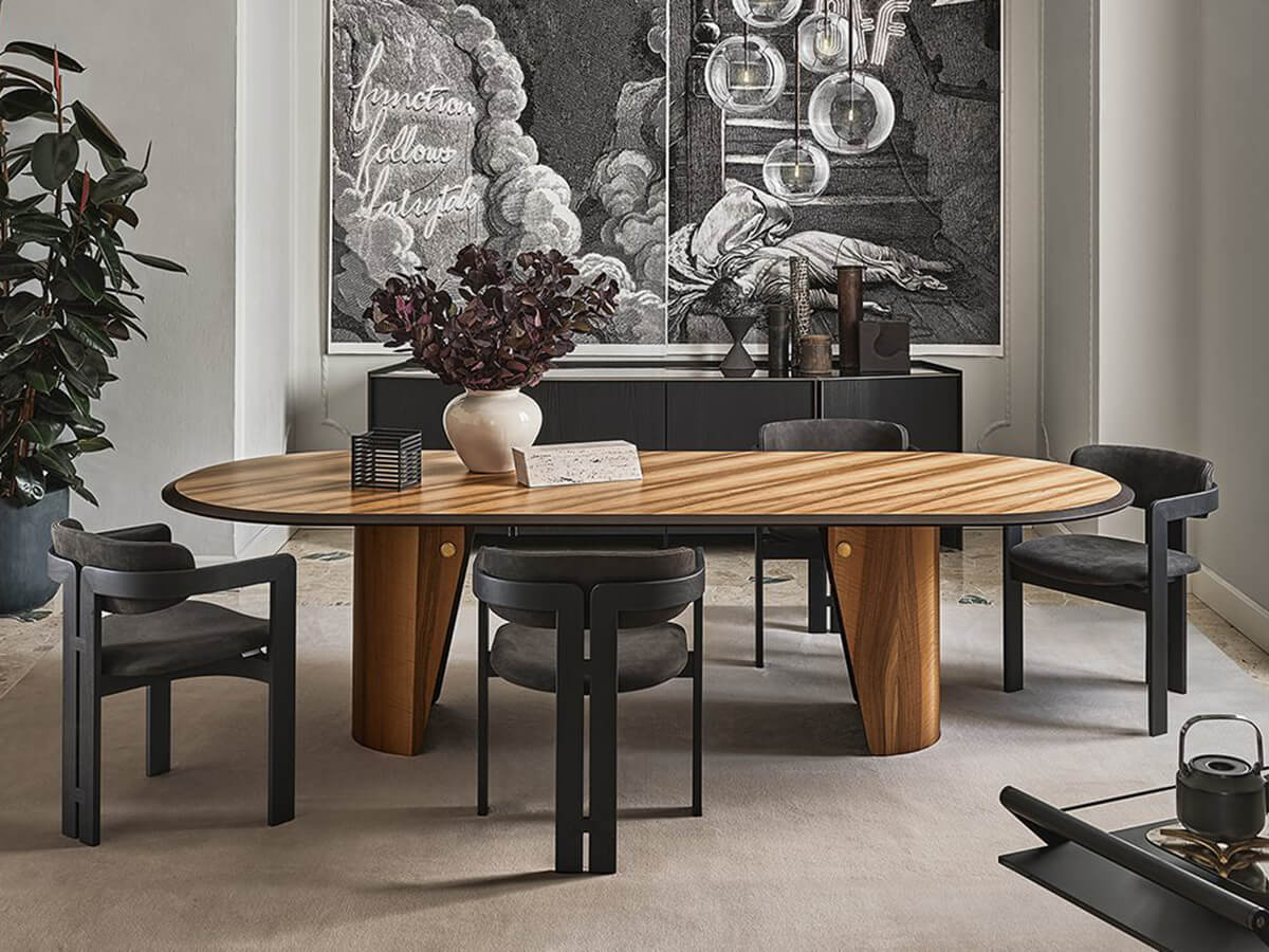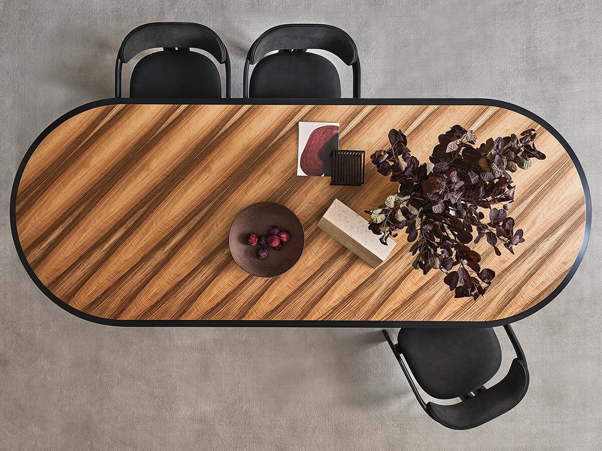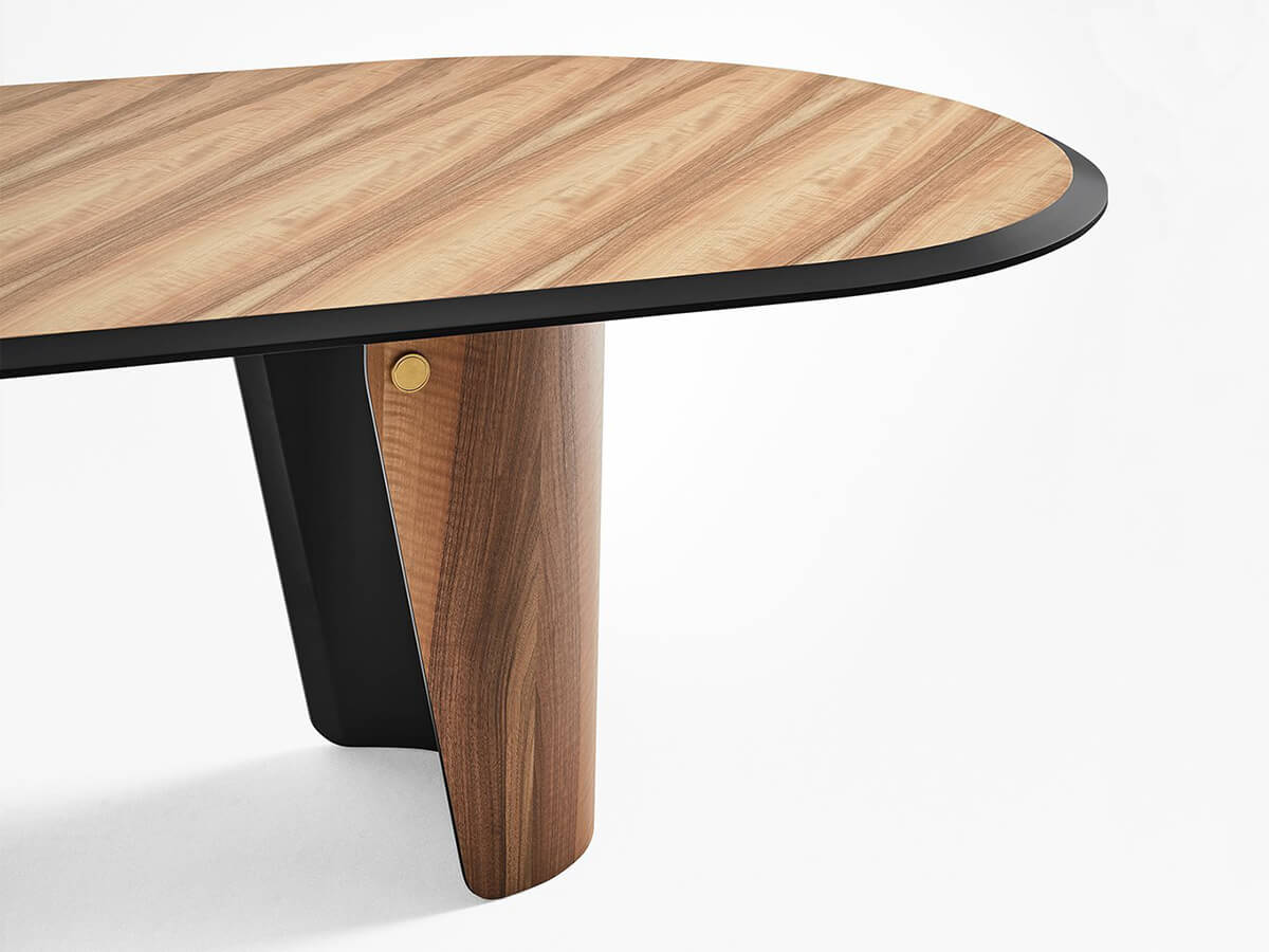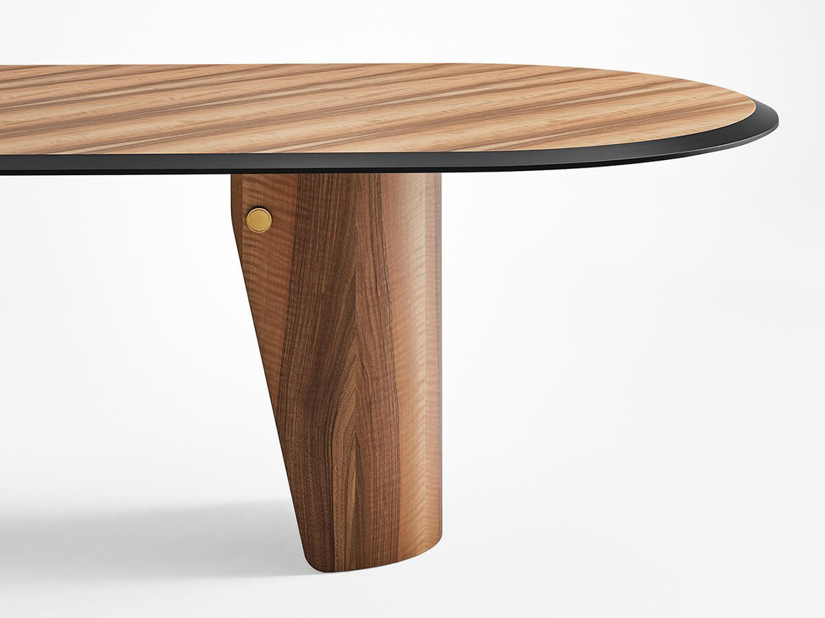 Manto is a table capable of enhancing the intrinsic elegance of wood and its grain in the best possible way. As with all the products designed by Pietro Russo for Gallotti & Radice, Manto shows a particular sensitivity for geometries and broken lines, shown here right into the material thanks to the particular frisé effect of the wood that composes the top, available in walnut inlaid with Herringbone with black bevel or in other Frisé woods such as maple or Tanganyika. The large central base is in curved wood and has a small opening on the bottom and the charming detail of a brass button that holds the two parts together. An unmistakable design that has also obtained important international awards: it was in fact awarded in 2020 with an Archiproducts Design Award. Technical features: oval-shaped version available only in frisé walnut