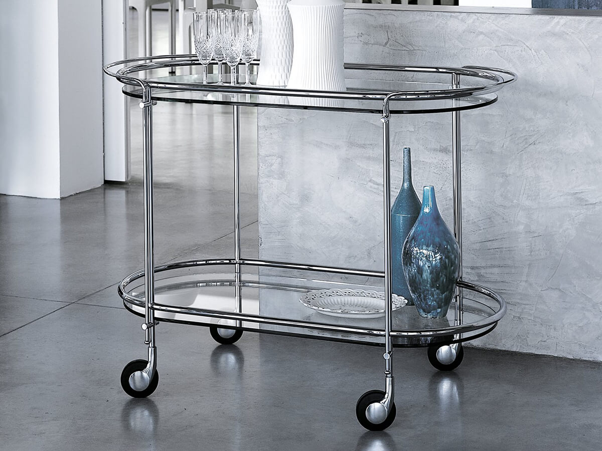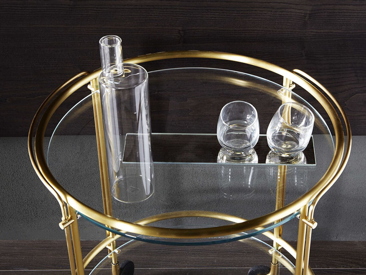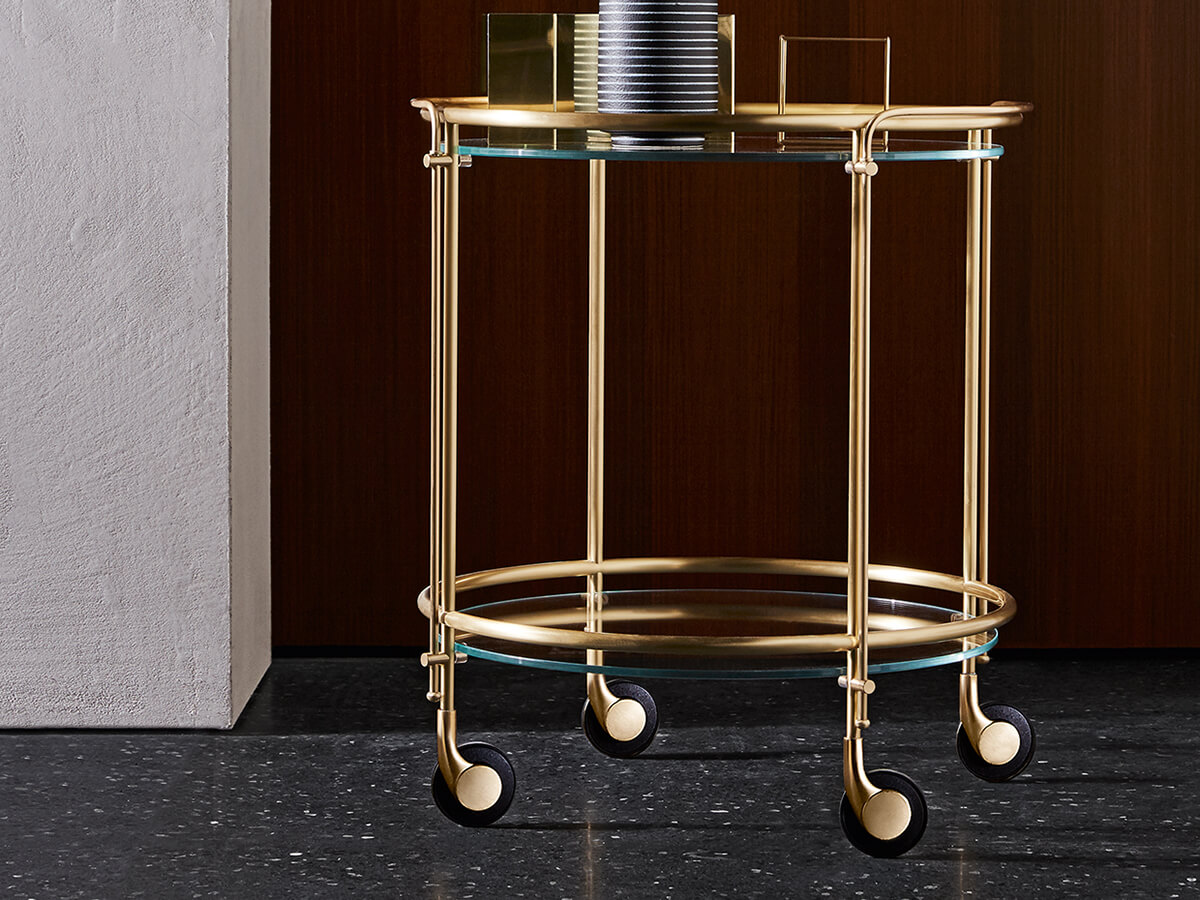 The Riki trolley is one of the historical pieces of the Gallotti & Radice collection. It was designed in 1971 by Pierangelo Gallotti, the historic owner of the company. Shapes, materials and colors perfectly embody the style of the era: the cold chromed brass structure blends perfectly with the reflections of the two glass tops. A charm that involves a whole typology, the "serving cart", once an obligatory piece of furniture in every bourgeois home and now back in fashion in a revival intended for skilled connoisseurs who know how to capture its charm and functionality. However, it is also available in more modern finishes, such as polished or satin brass for the structure or the more opaque back-painted glass for the tops. It can be made in different versions, round or oval.