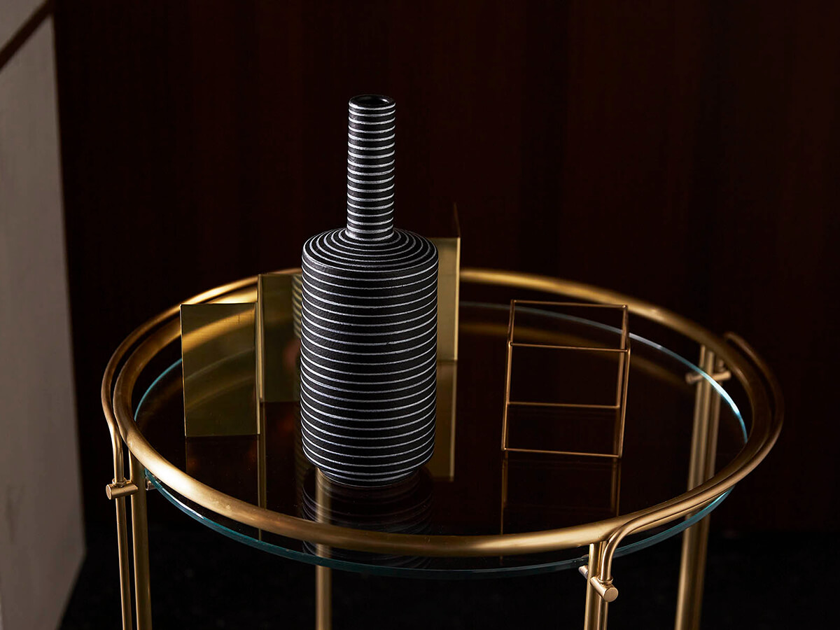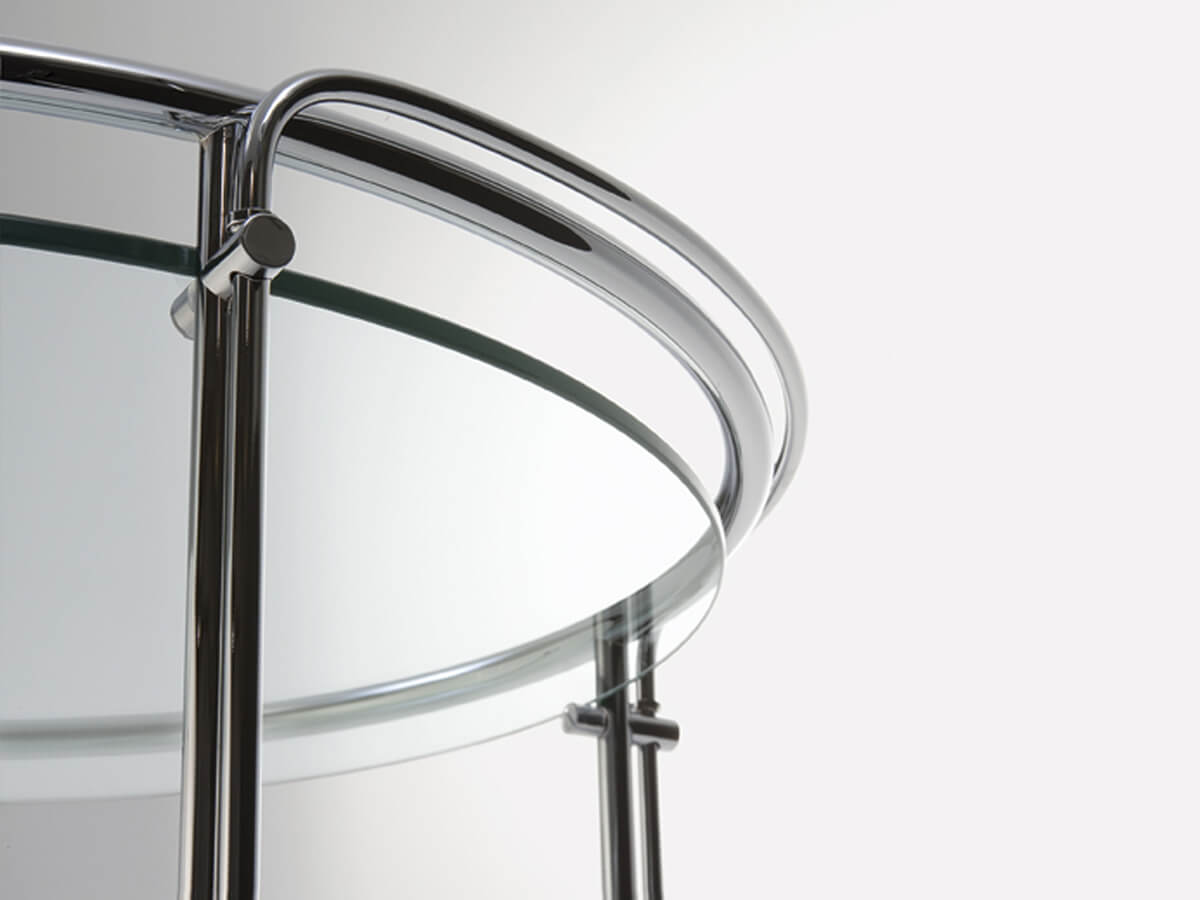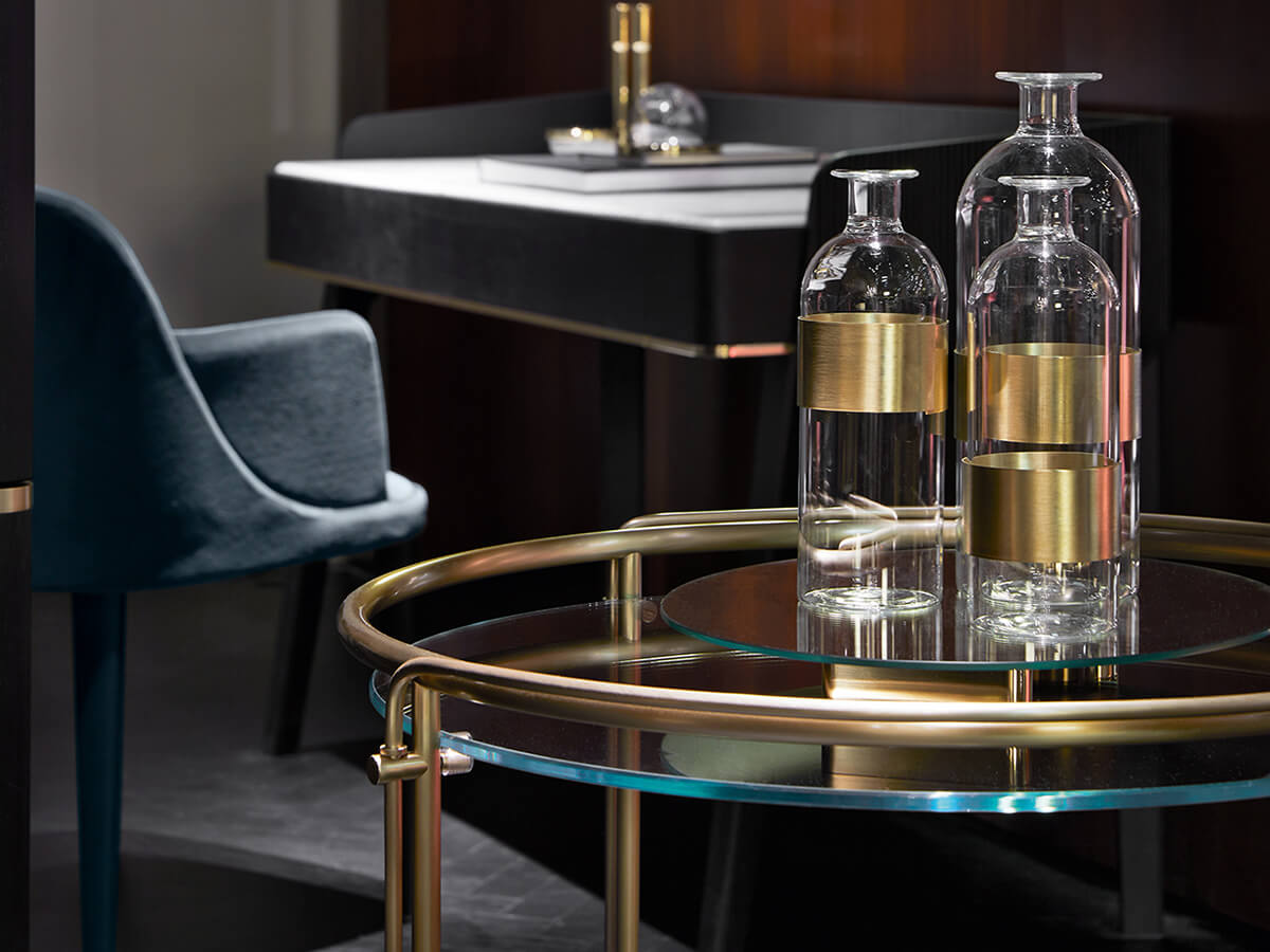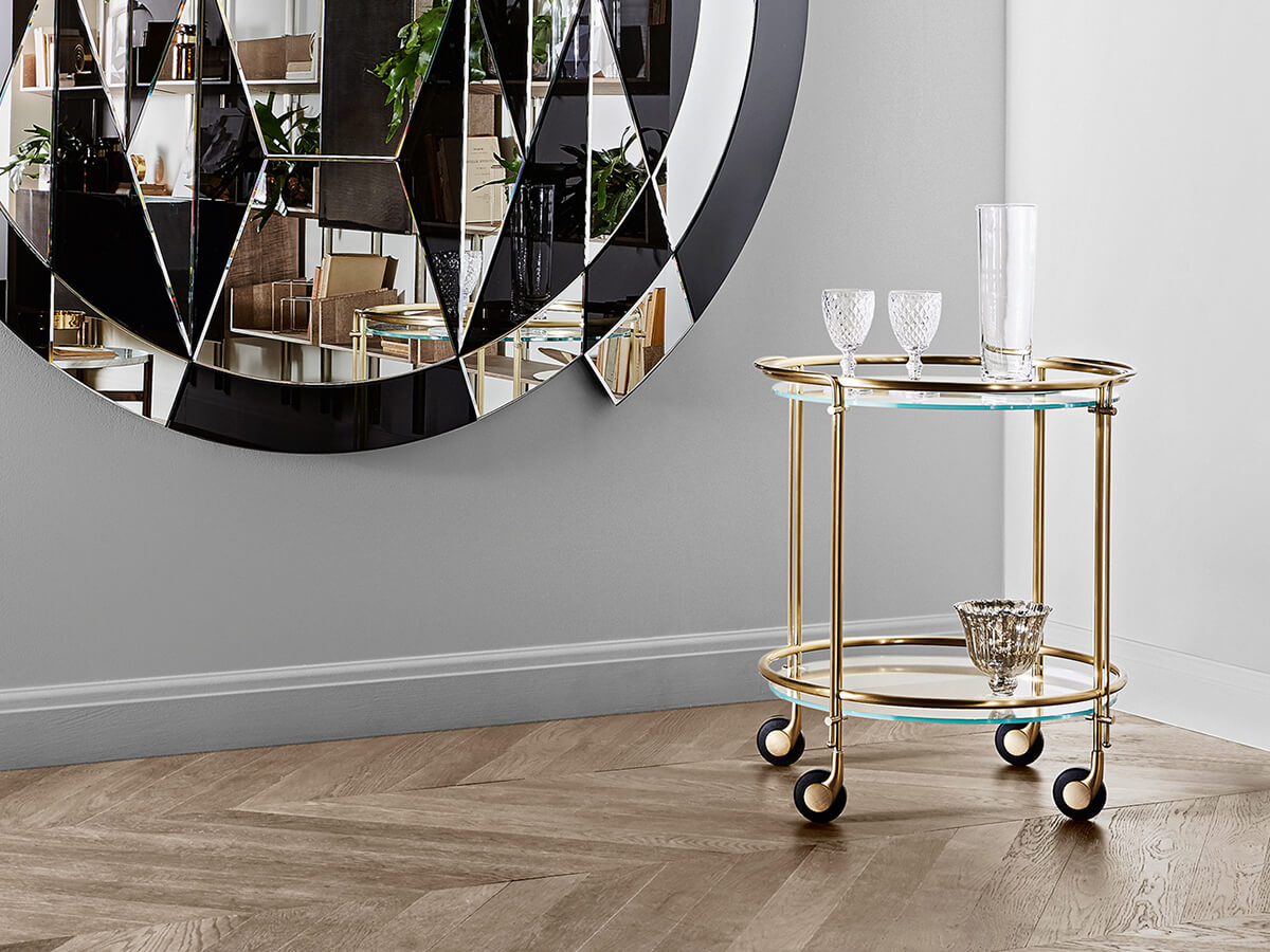 The Riki trolley is one of the historical pieces of the Gallotti & Radice collection. It was designed in 1971 by Pierangelo Gallotti, the historic owner of the company. Shapes, materials and colors perfectly embody the style of the era: the cold chromed brass structure blends perfectly with the reflections of the two glass tops. A charm that involves a whole typology, the "serving cart", once an obligatory piece of furniture in every bourgeois home and now back in fashion in a revival intended for skilled connoisseurs who know how to capture its charm and functionality. However, it is also available in more modern finishes, such as polished or satin brass for the structure or the more opaque back-painted glass for the tops. It can be made in different versions, round or oval.