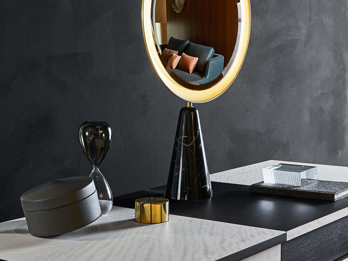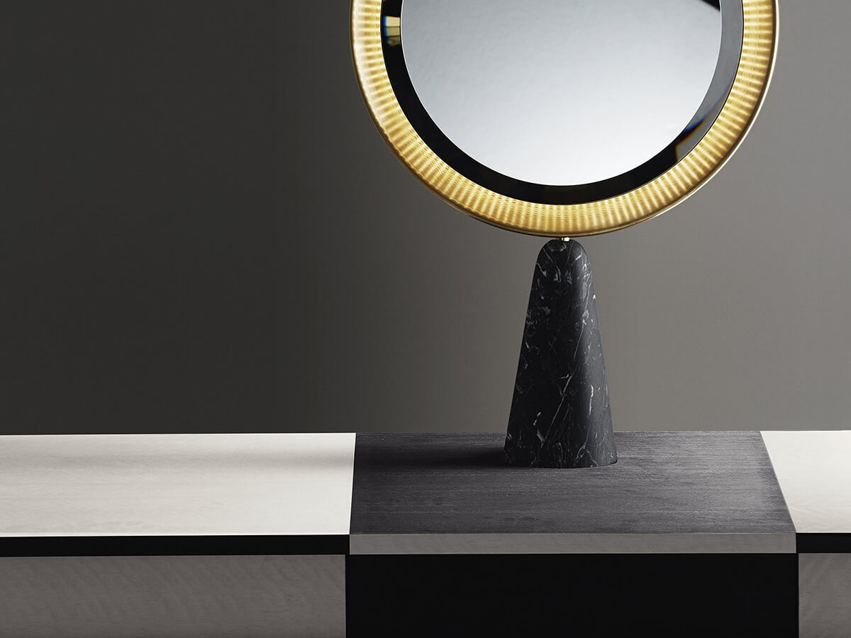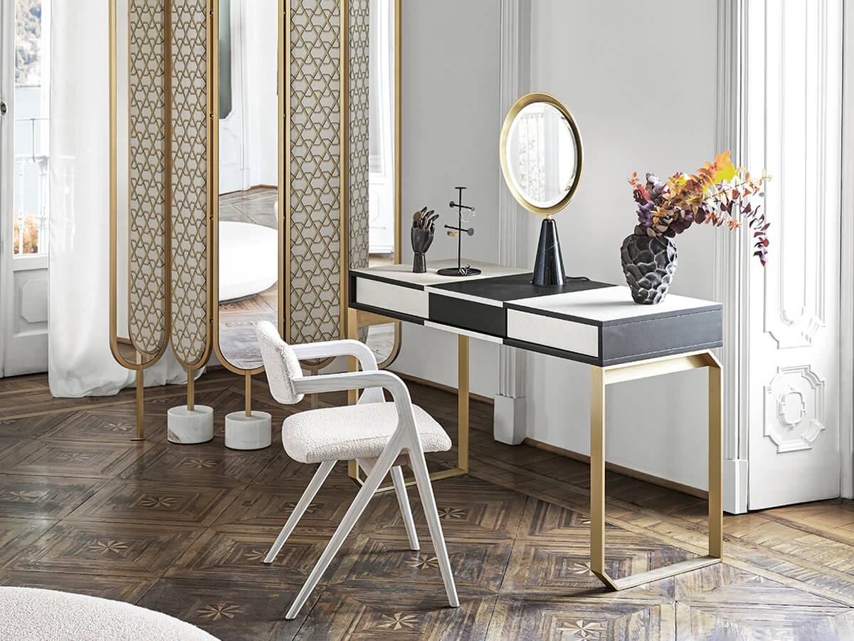 The Selene vanity desk bears the signature of a refined and surprising designer like Pietro Russo and recalls the traditional predilection for precious materials and chromatic games of black and white. With a veiled Art Déco inspiration, Selene rests on two scenographic bases in satin brass and sees a geometric alternation of white Taba Frisè wood and black Tanganyika in a suggestive alternating optical effect. The composition is dominated by the Selene mirror (which can also be purchased individually as a decorative object), with a precious black Marquinia marble base. Selene is proposed as an elegant addition to the sleeping area of the house to compose a makeup area that is both practical and luxurious.* Technical features: structure in white taba frisé and black tanganika, metal parts lacquered in satin brass and mirror with light